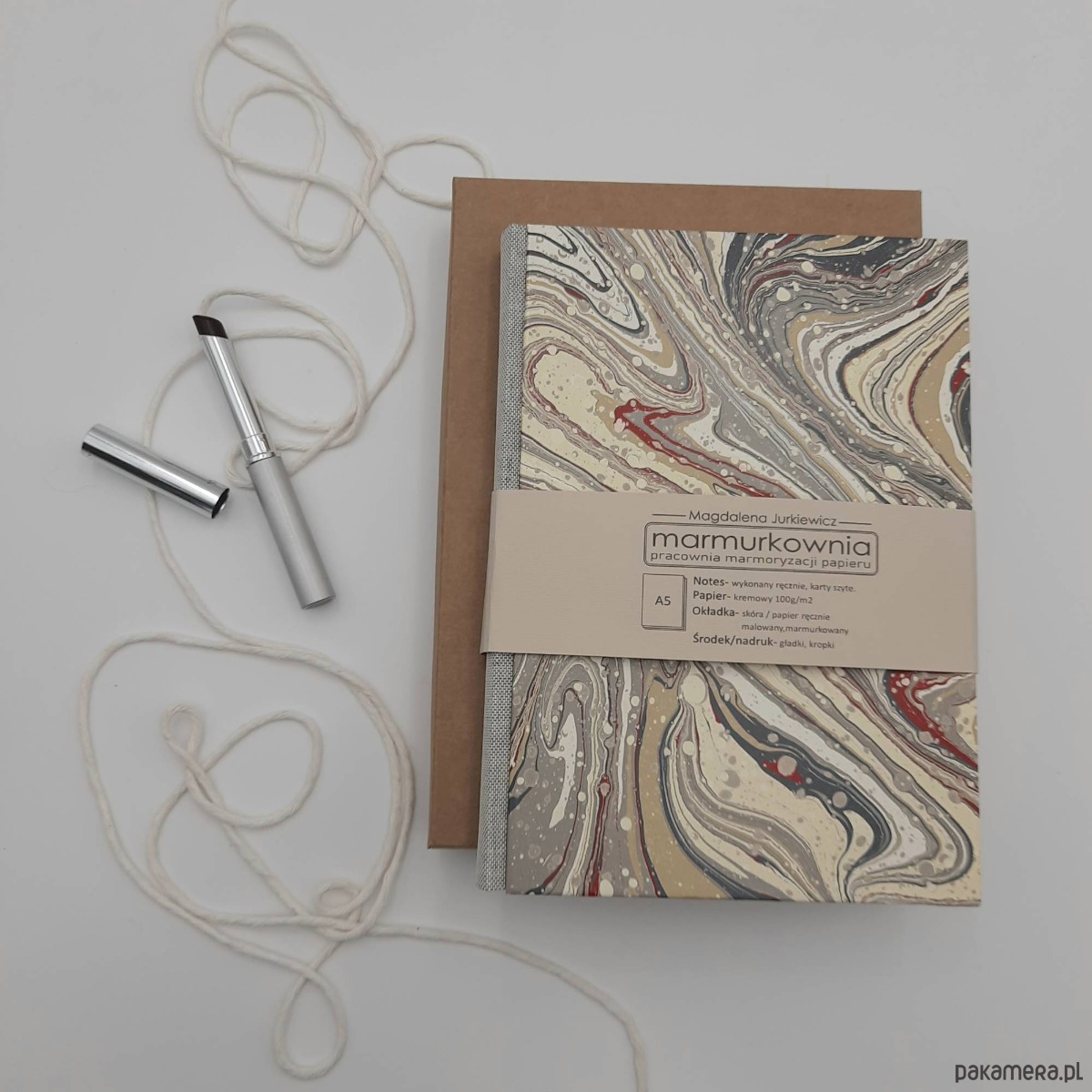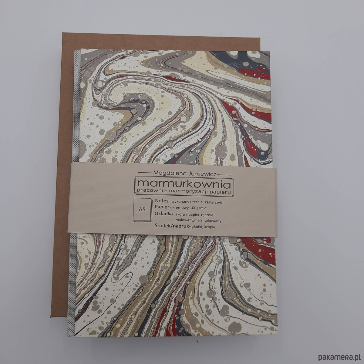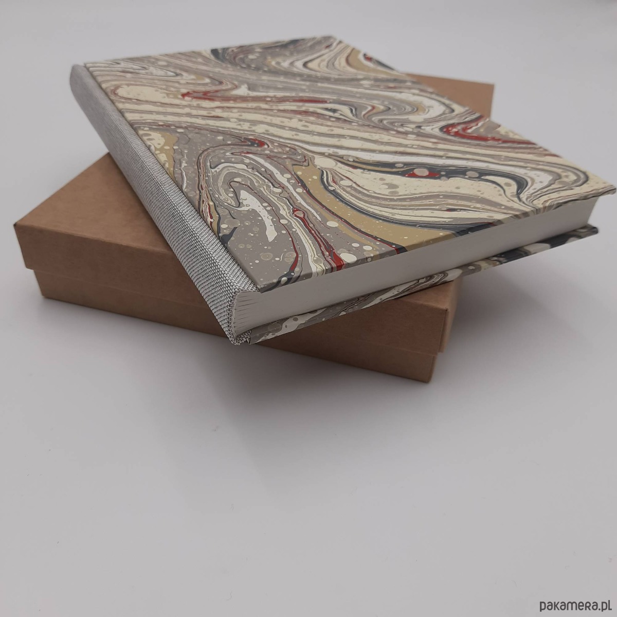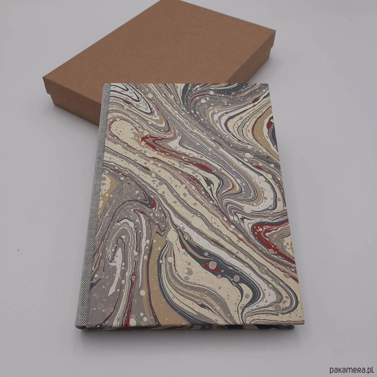 Notes, szkicownik, ręcznie wykonany, w twardej oprawie oklejonej płótnem oraz papierem barwionym w technice marmoryzacji, który maluję w mojej pracowni.