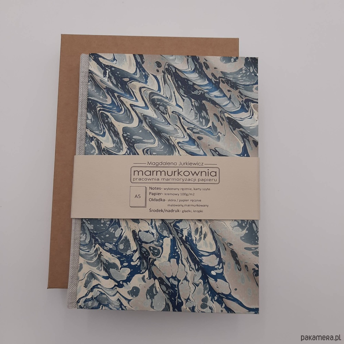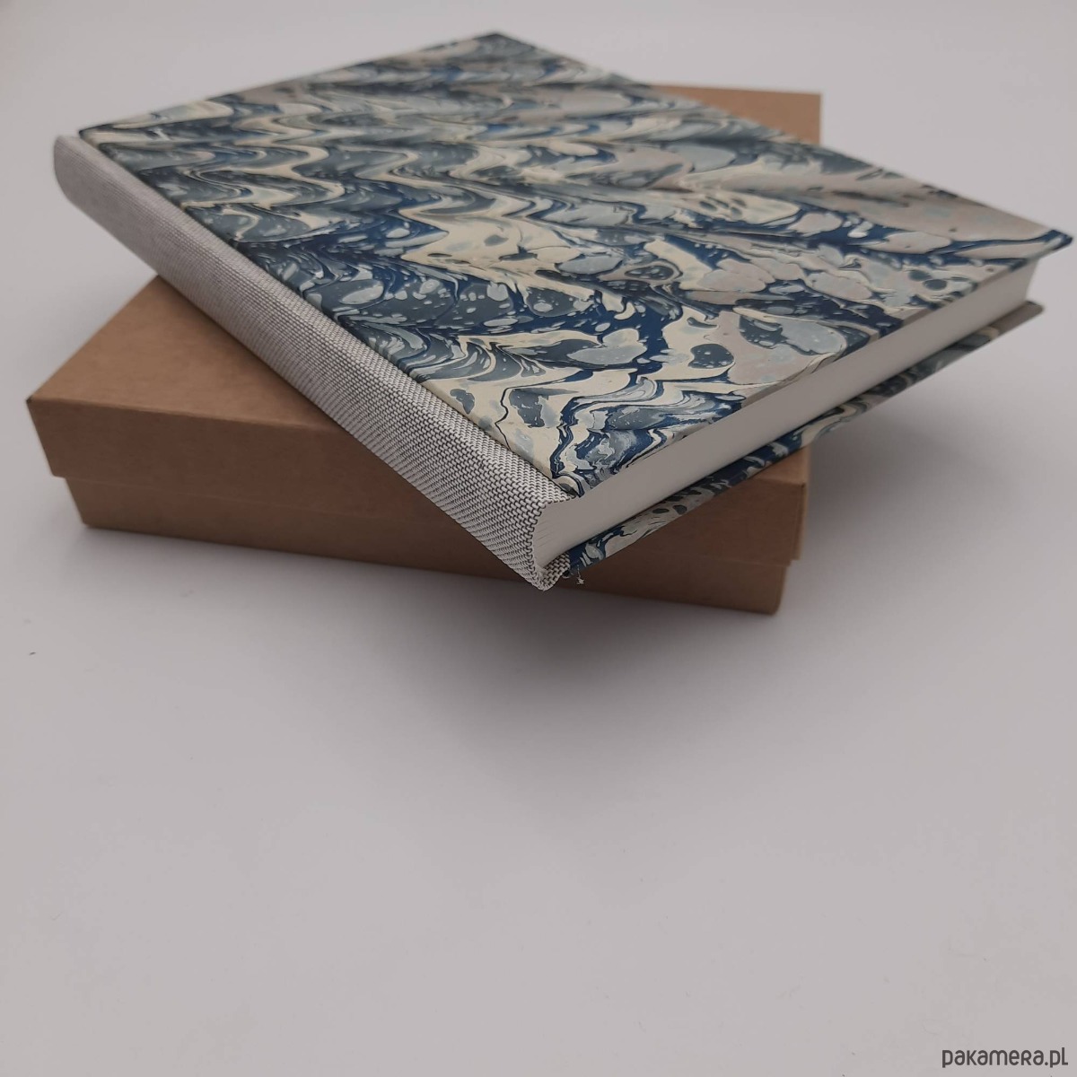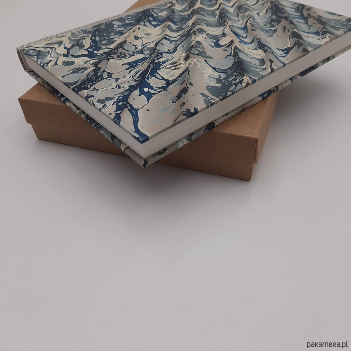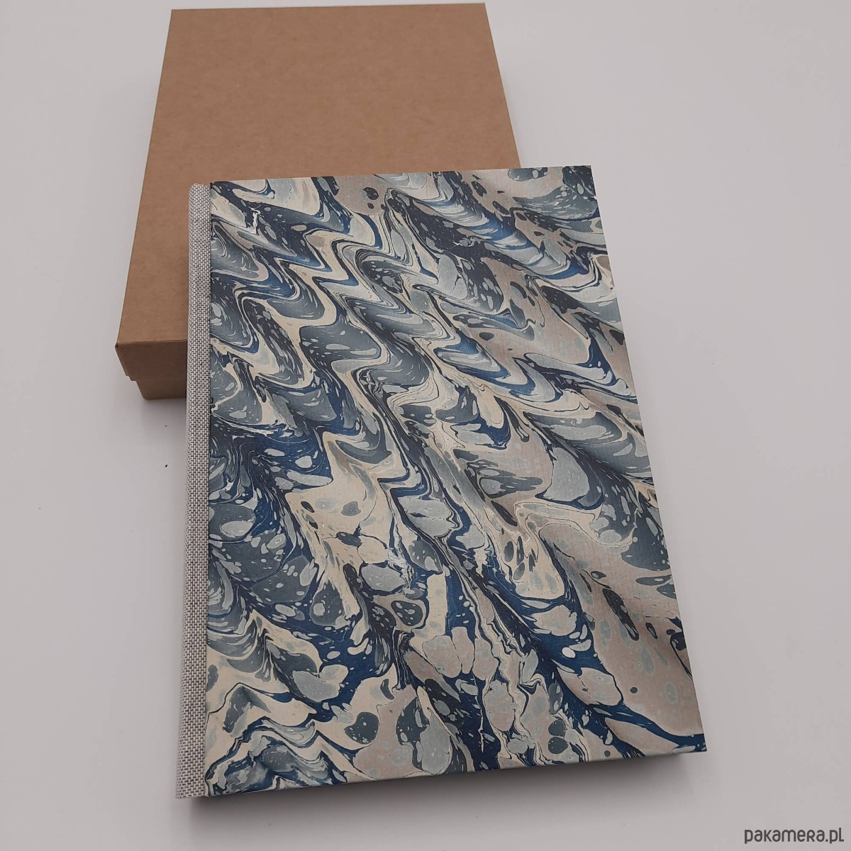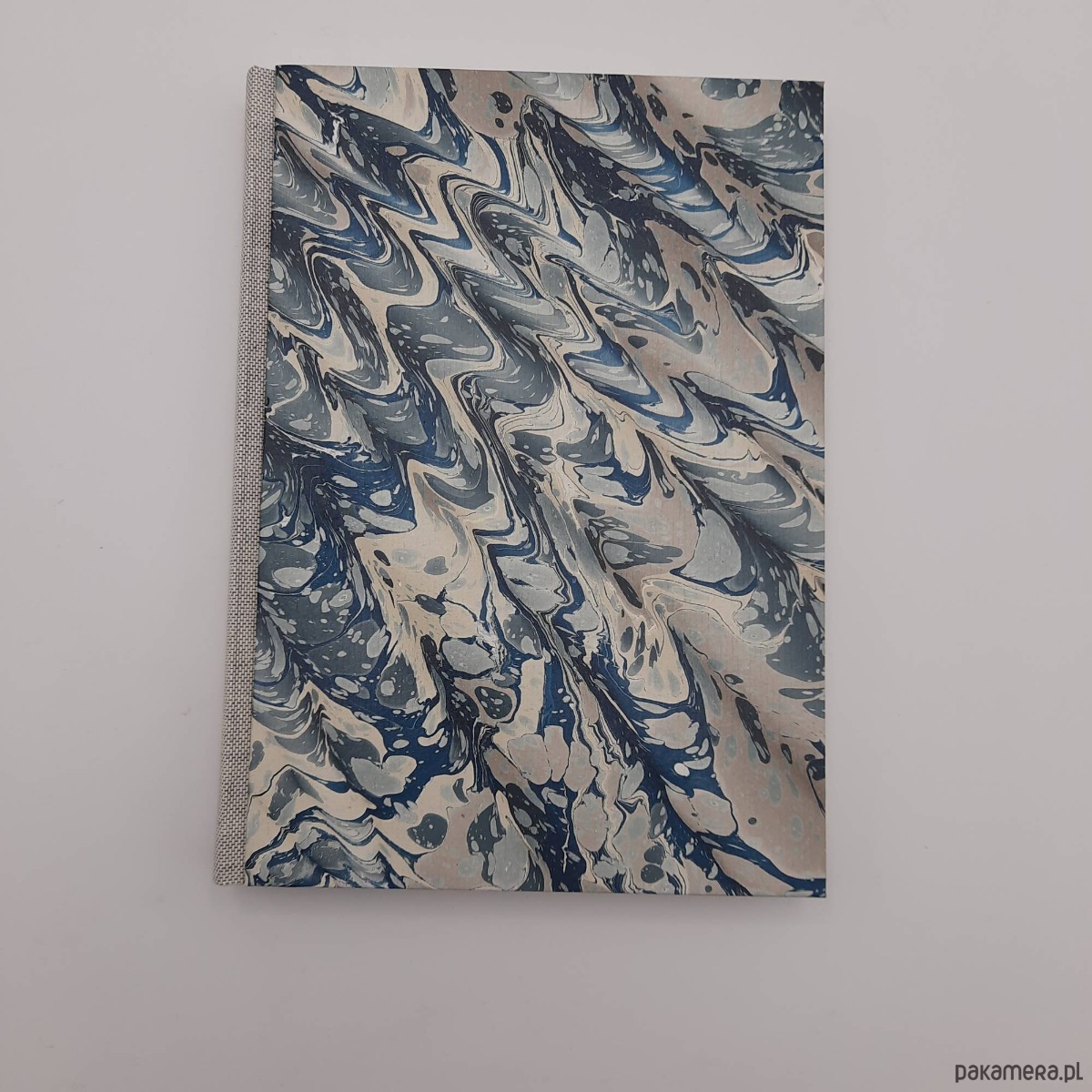 Notes, szkicownik, ręcznie wykonany, w twardej oprawie oklejonej płótnem oraz papierem barwionym w technice marmoryzacji, który maluję w mojej pracowni.