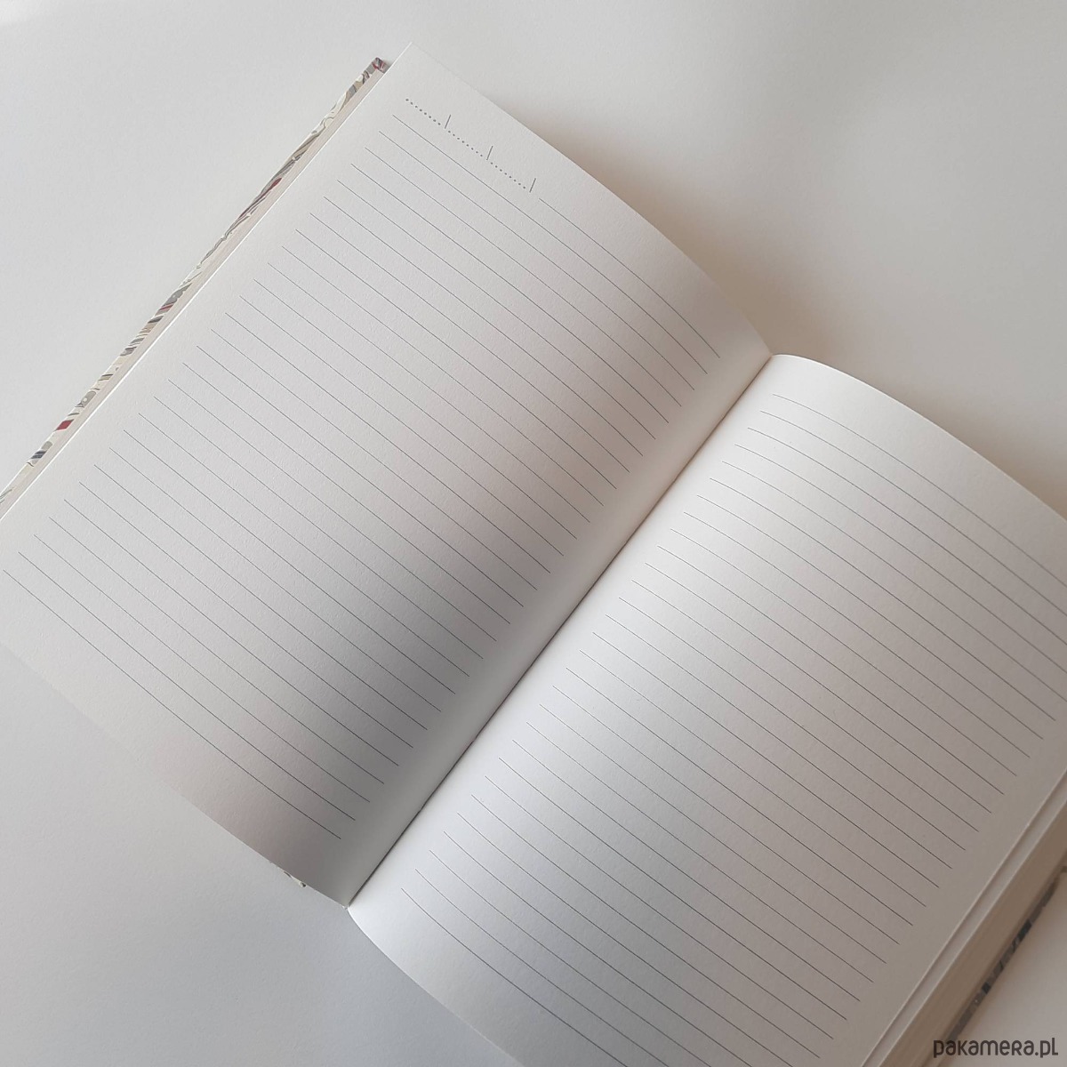 Środek notesu zawiera 200 stron z nadrukiem w linię, plus datownik w lewym górnym rogu strony,