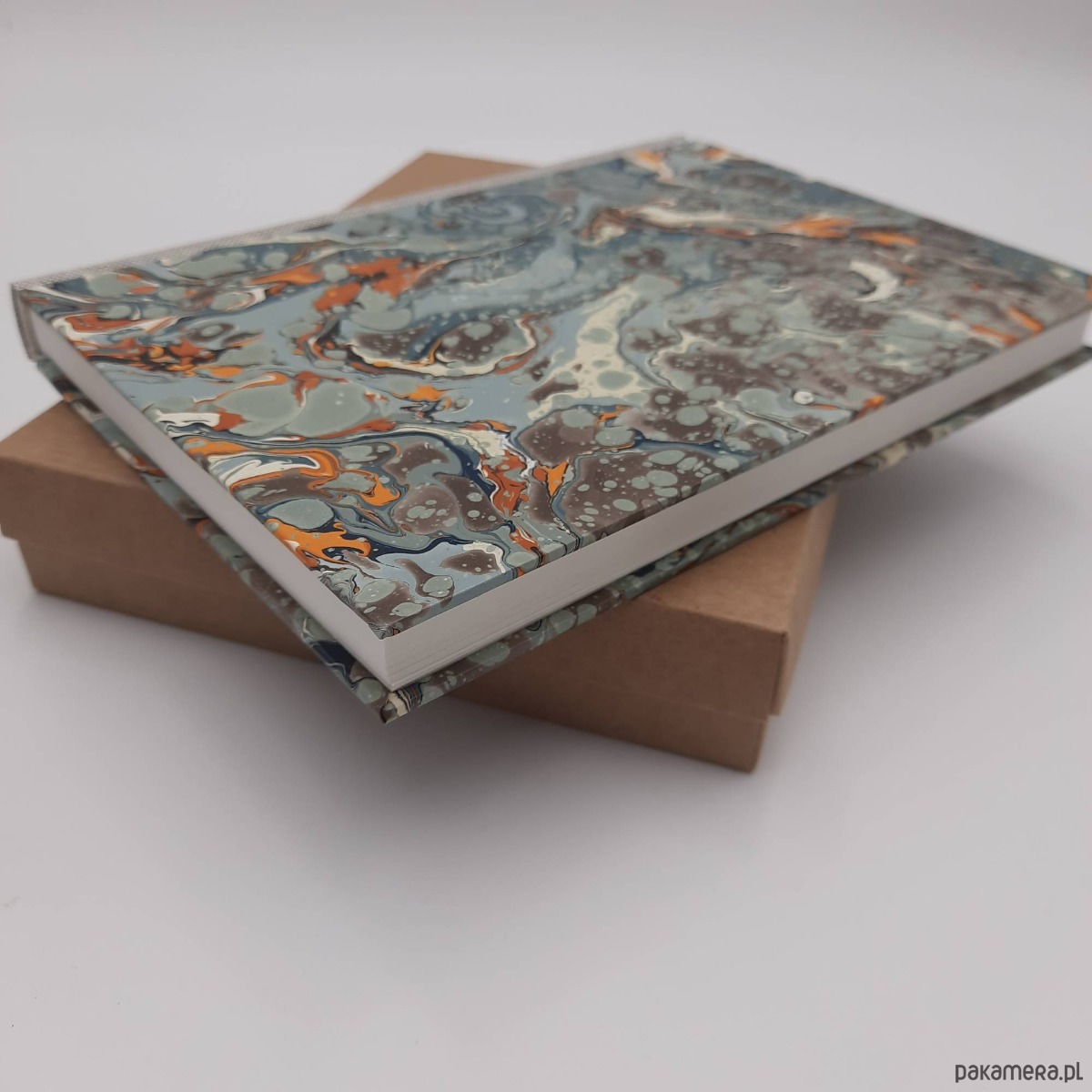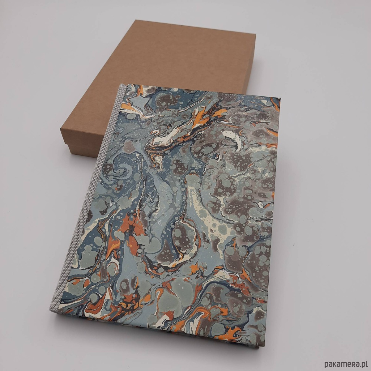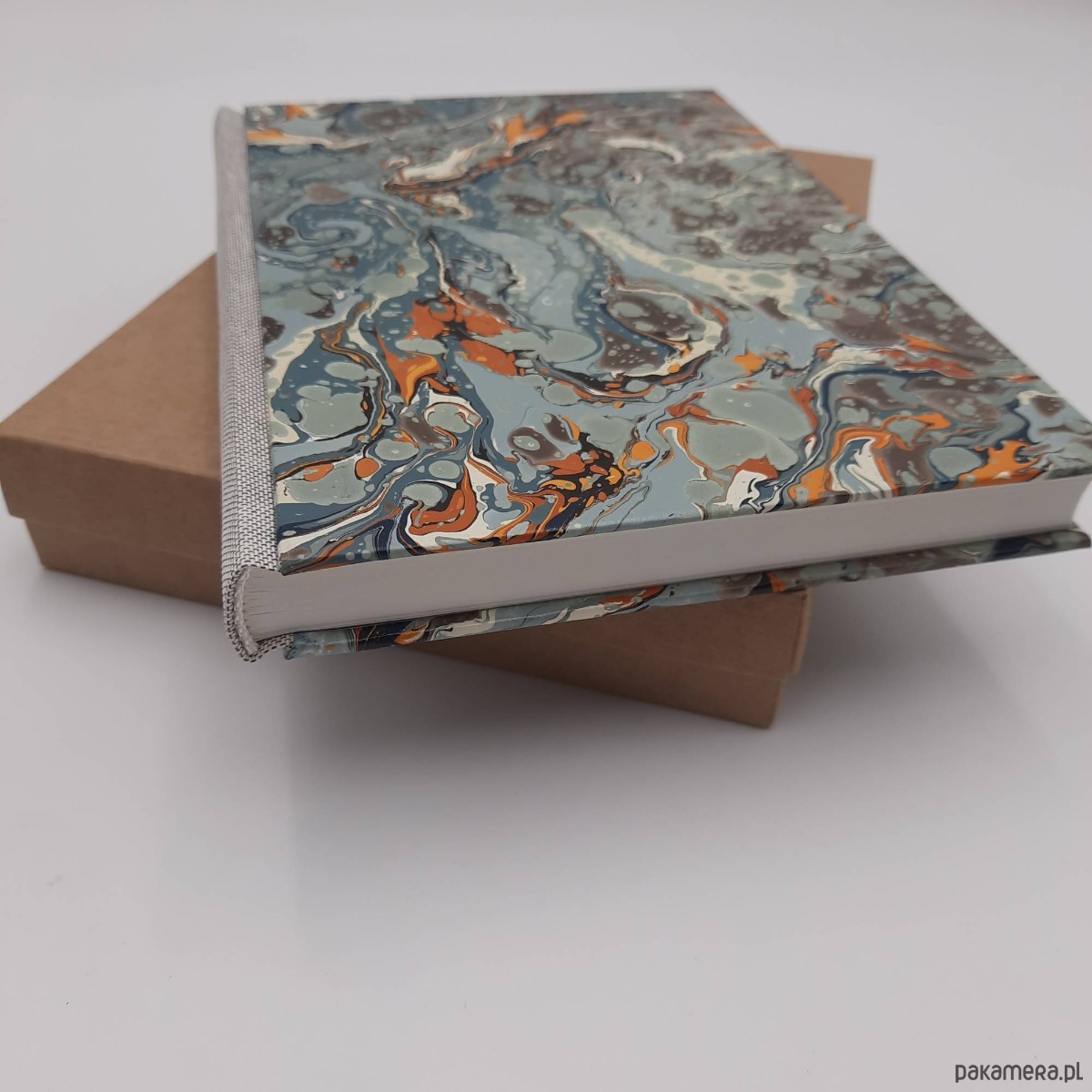 Notes, szkicownik, ręcznie wykonany, w twardej oprawie oklejonej płótnem oraz papierem barwionym w technice marmoryzacji, który maluję w mojej pracowni.
