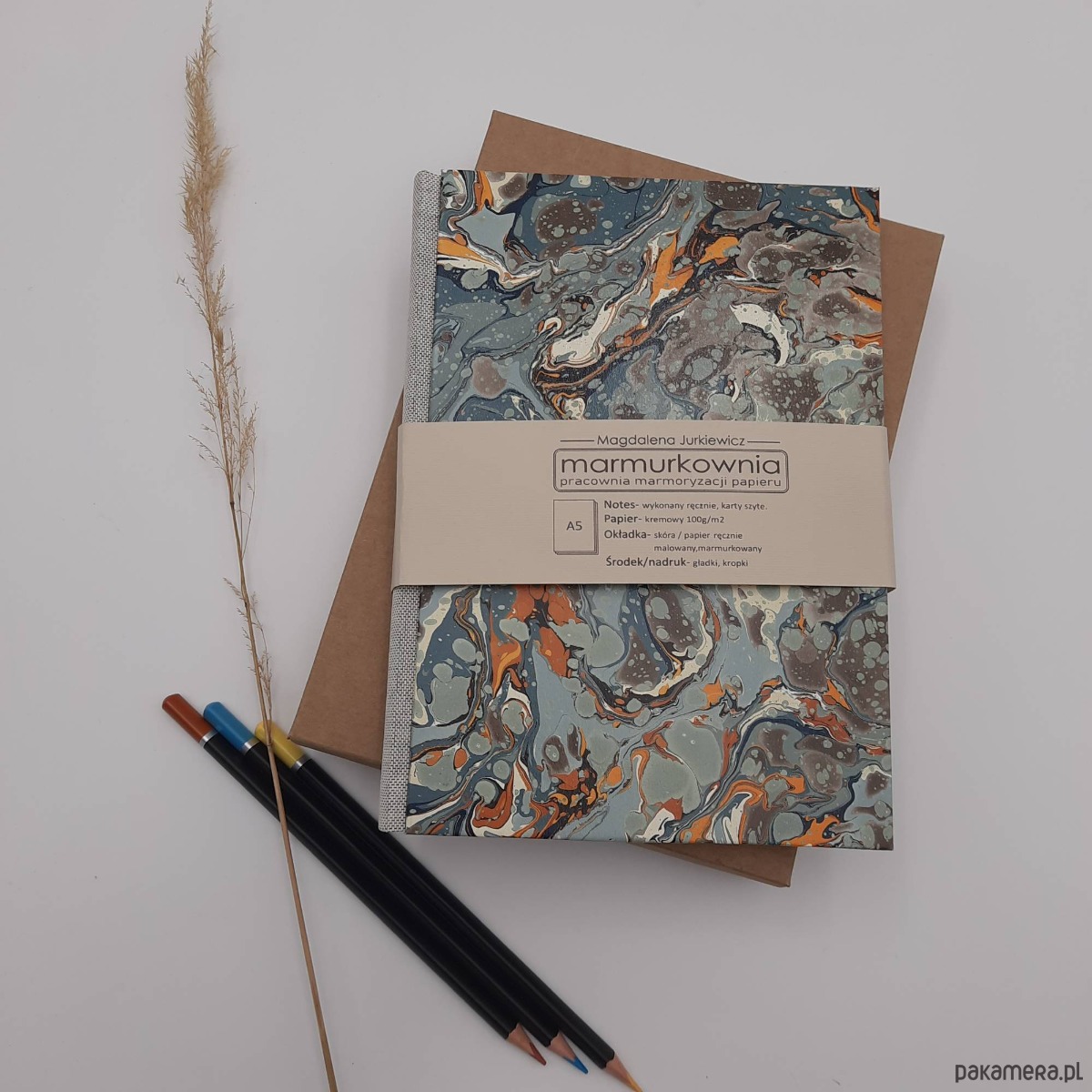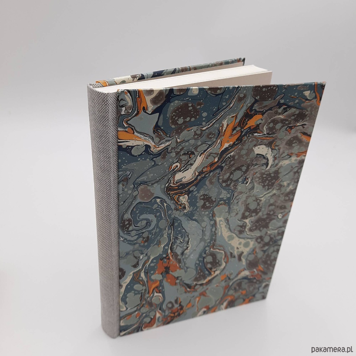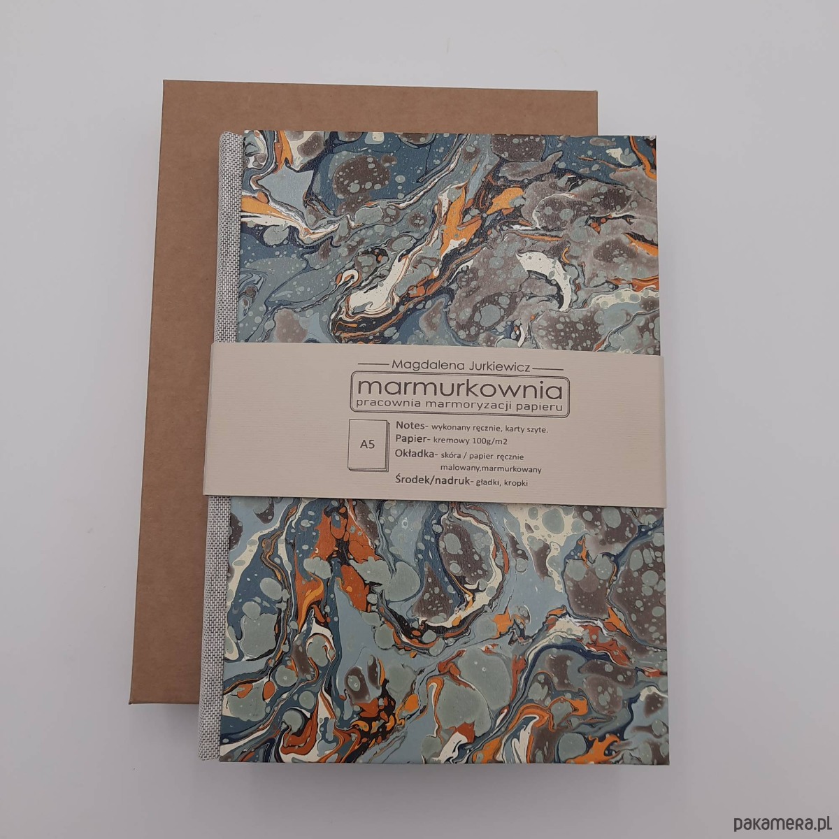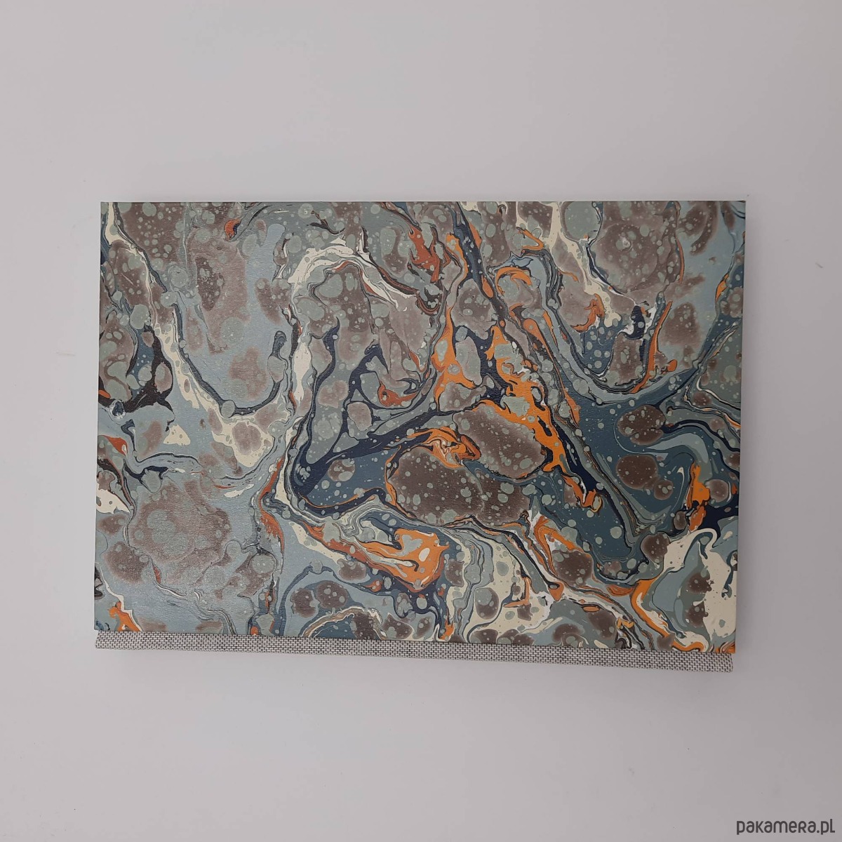 Notes, szkicownik, ręcznie wykonany, w twardej oprawie oklejonej płótnem oraz papierem barwionym w technice marmoryzacji, który maluję w mojej pracowni.