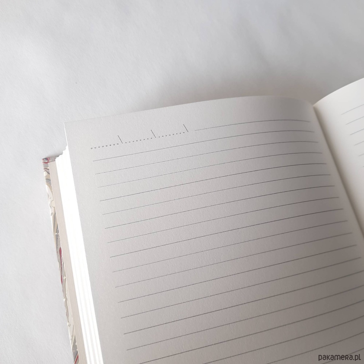 Środek notesu zawiera 200 stron z nadrukiem w linię, plus datownik w lewym górnym rogu strony,