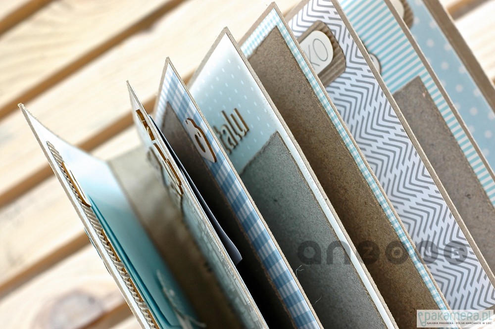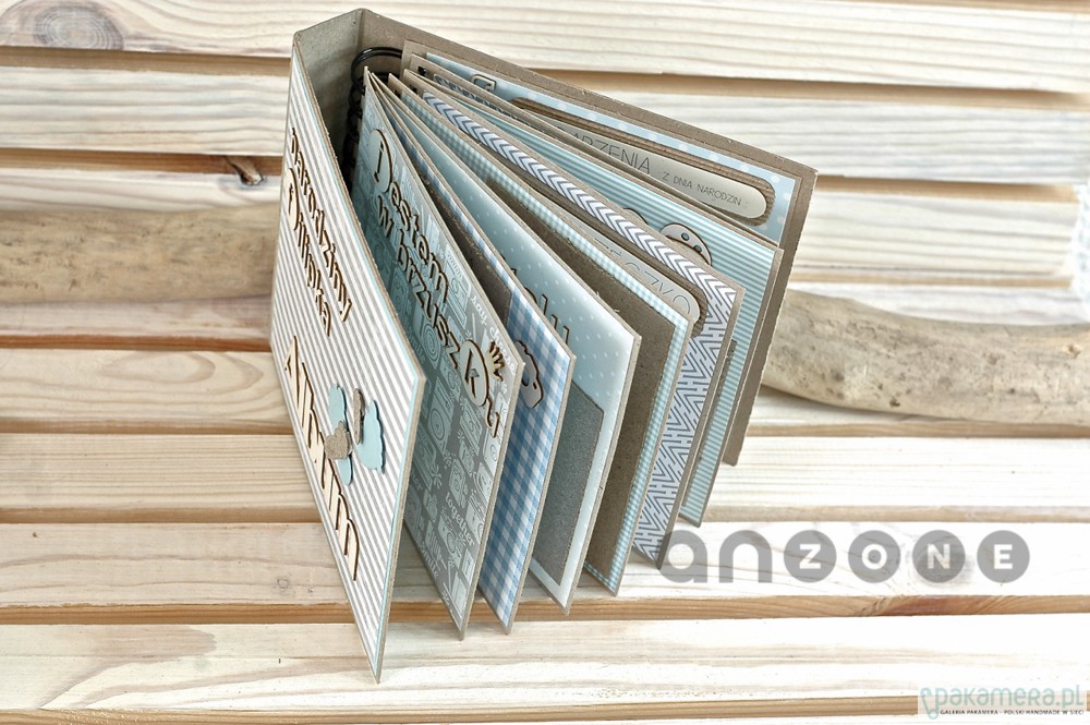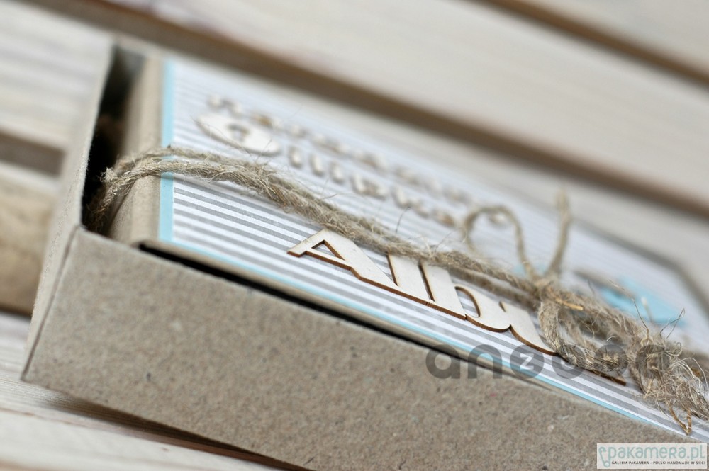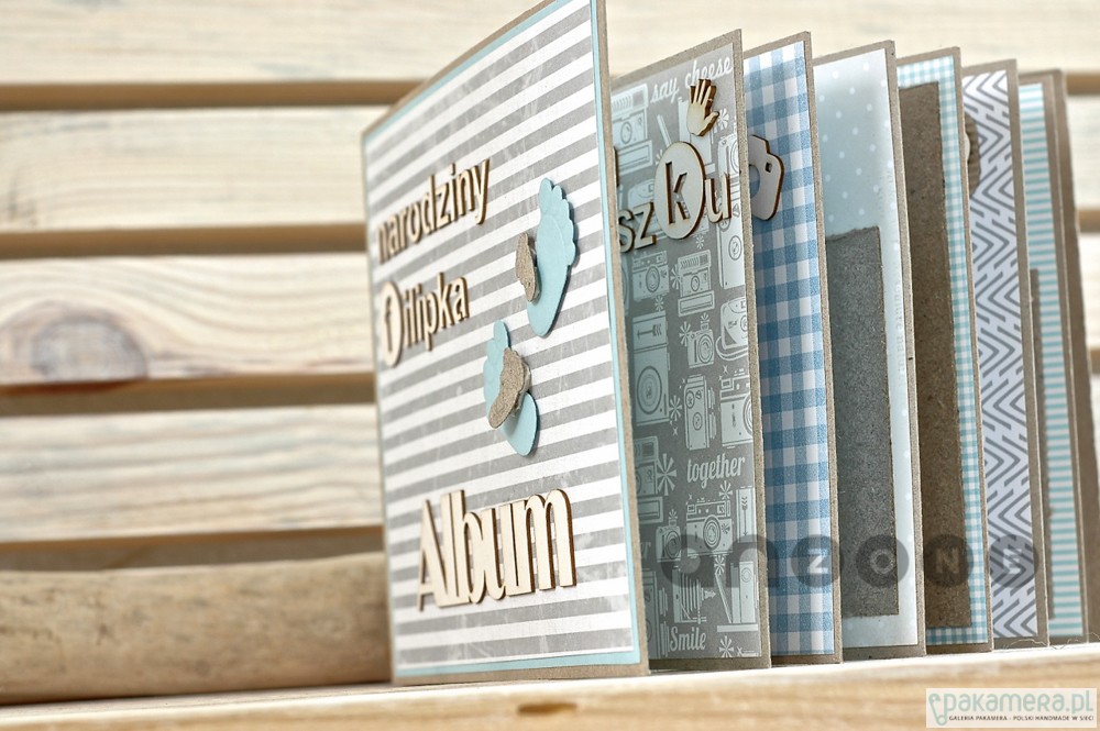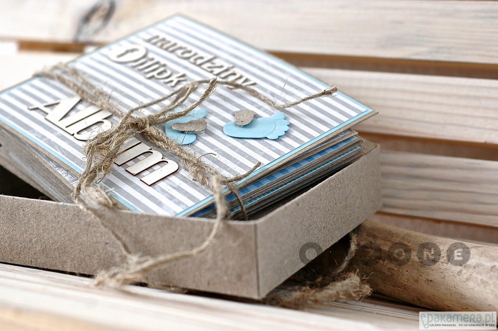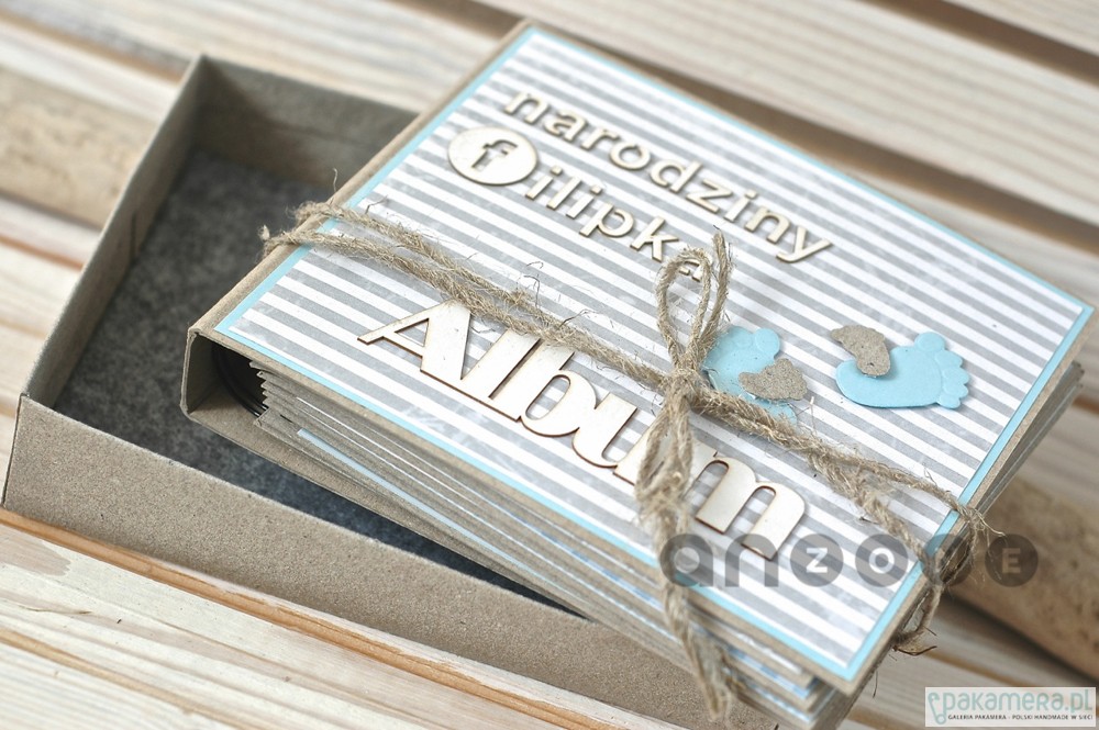 Słodki album w dekoracyjnym pudełku z okazji narodzin dziecka. Będzie doskonałym prezentem i wspaniałą pamiątką dla malaluszka i jego rodziców. Zawiera 8 kart (po 2 strony) papieru spiętego spiralą, ozdobionego kolorowymi papierami do scrapbookingu oraz dodatkami Album mieści zdjęcia w formacie 13 x 9 . Na kartach oprócz zdjęć można zamieśćić informacje, teksty, akcesoria związane z okresem oczekiwania na dziecko, porodu, narodzin (np. jest koperta na USG, koperta na piereszy film z maluszkiem, kieszonka na pępowinę, opaskę szpitalną, nwes’y z dnia narodzin tj. cena chleba, wydarzenie z kraju itp. , metryczka urodzenia i wiele innych). Całkowity format albumu: 19 cm x 16,5 cm Kolorystyka albumu: niebiesko- szaro – ecru ( na życzenie inna) Baza albumu – beż a na życzenie może być biała lub ecru. UWAGA: napisy, teksty według życzenia klienta !!!