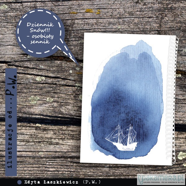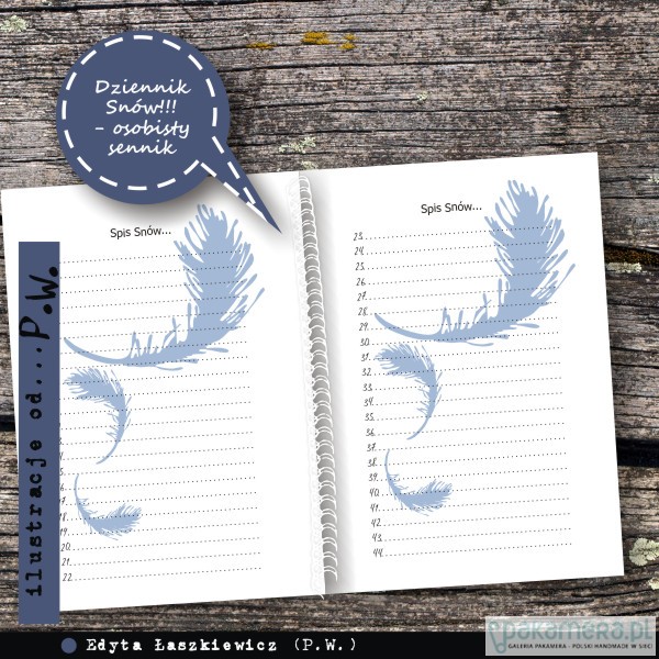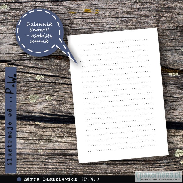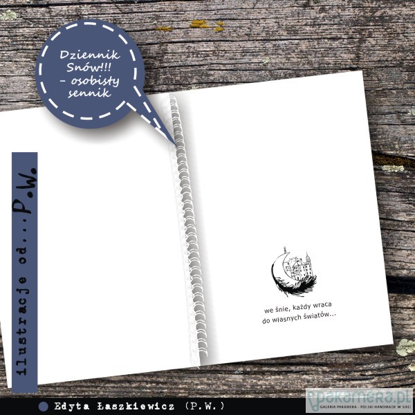 Dziennik Snów, to osobisty sennik na notatki z sennych podróży zdobiony autorskimi ilustracjami. Okładka została wydrukowana na papierze satynowanym o wysokiej gramaturze. Na pierwszej stronie znajduje się ilustracja oraz motto. Z tyłu dziennika został osadzony Spis Snów. Dziennik posiada 120 gładkich stron o gramaturze 80 g/m2 i jest w formacie A5. Całość została zszyta białym, metalowym grzbietem. Do dziennika dołączona jest sztywna karteczka z liniami - do podkładania pod białe karteczki. Dziennik Snów może też być dość niebanalnym prezentem... Możliwa jest personalizacja, lub modyfikacja sennika. W takim przypadku proszę o kontakt przez galerię.