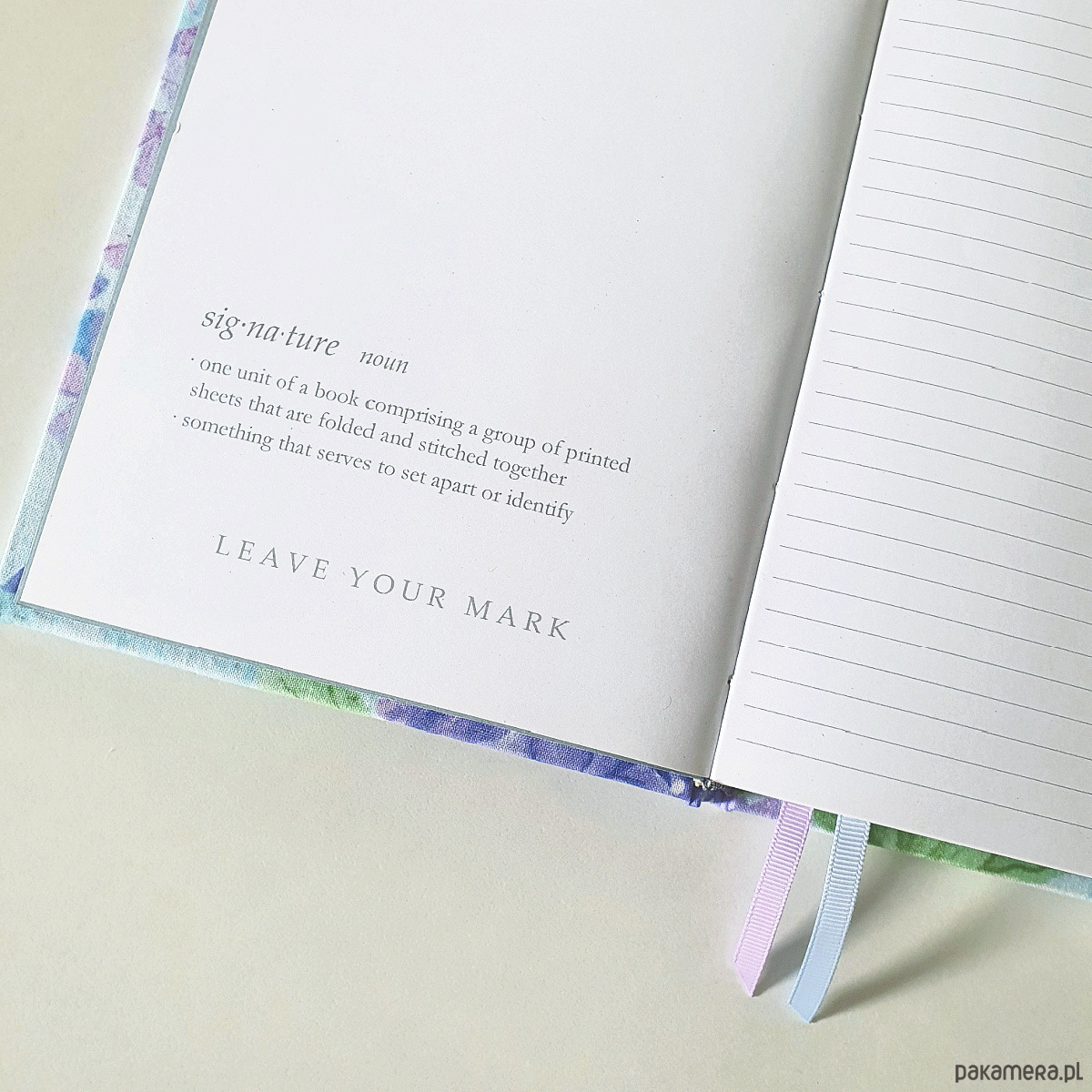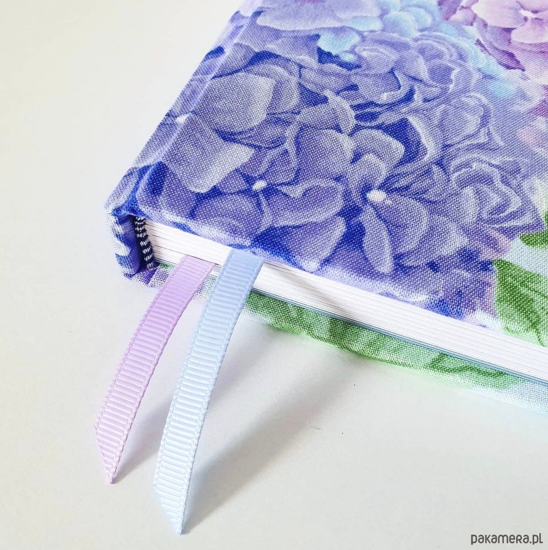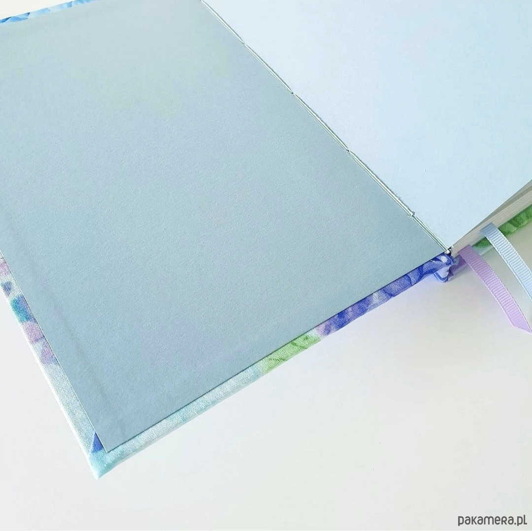 Piękny, kwiatowy notes w linie. Wykonany w 100% ręcznie, od drukowania stron poprzez szycie, klejenie okładek i składanie. Twarda okładka oklejona jest tkaniną bawełnianą, przyjemnie gładka i miła w dotyku. Wyklejki na początku i końcu książki wykonane są z grubego papieru w stalowo-szarym kolorze. Notes posiada dwie wstążkowe zakładki, i kartę tytułową z miejscem na własnoręczny podpis.