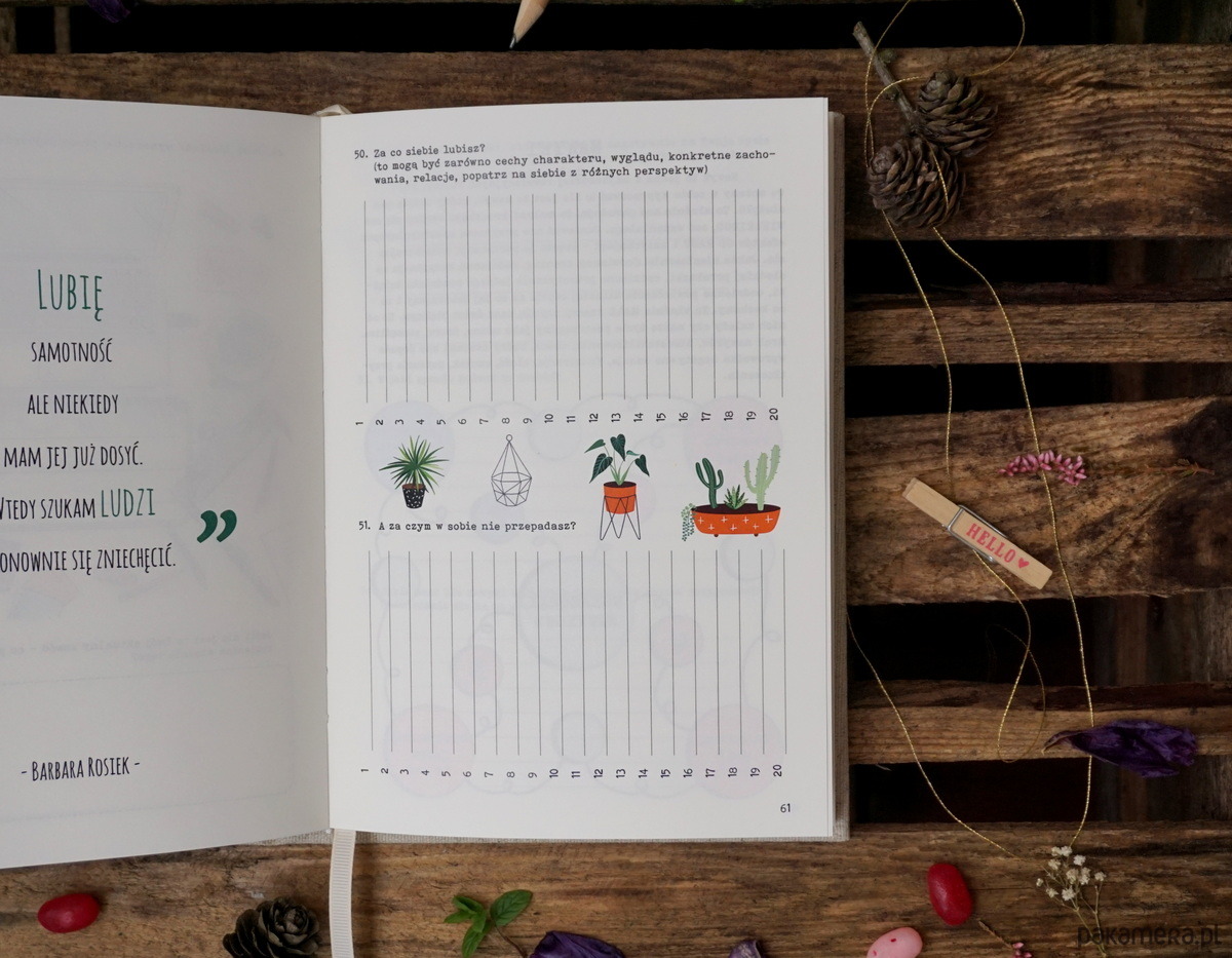 W środku znajduje się 100 pytań z rozmaitych obszarów życia - relacje, praca, wartości, potrzeby, marzenia, plany... mają one na celu głębsze poznanie siebie, które jest niezbędne do szczęśliwego i satysfakcjonującego życia!