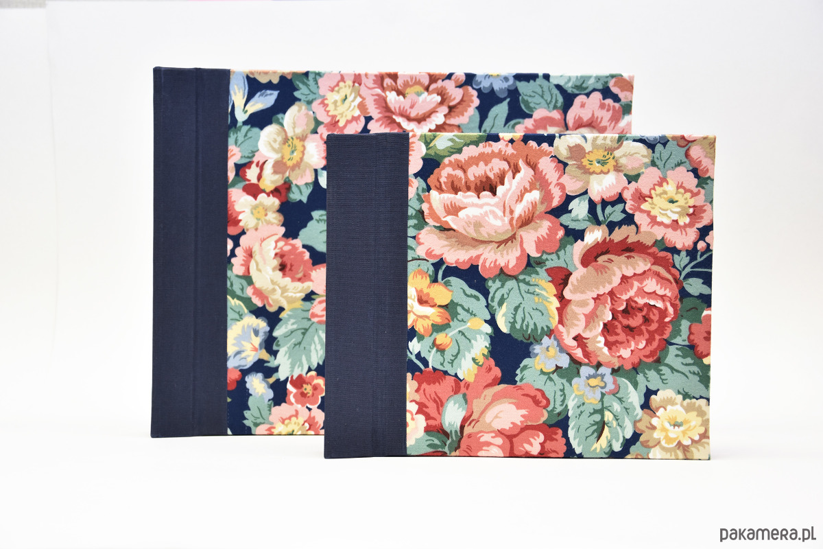 Oprawiony w piękną angielską tkaninę z motywem róż na granatowym tle. Grzbiet albumu w granatowym płótnie. Złota kapitałka.