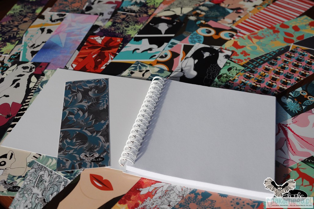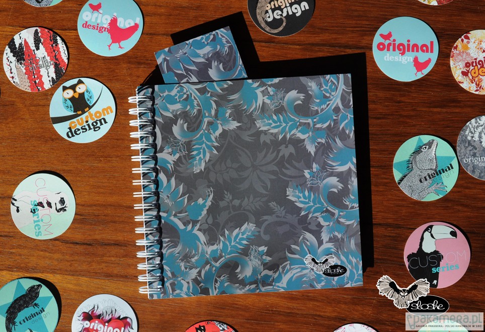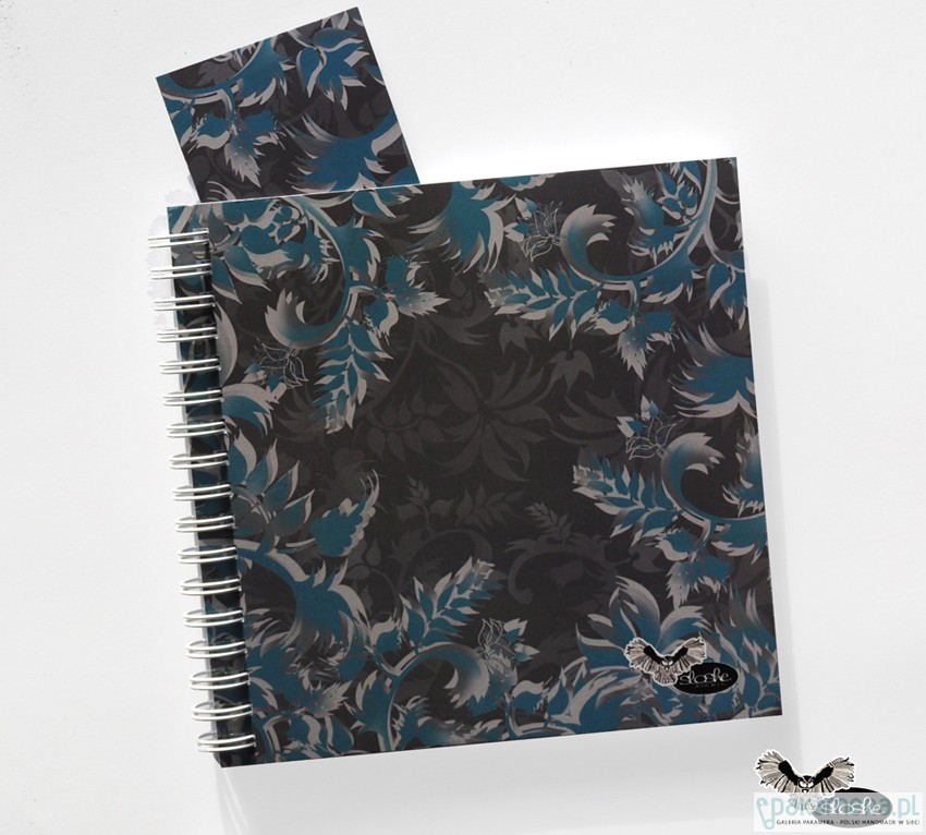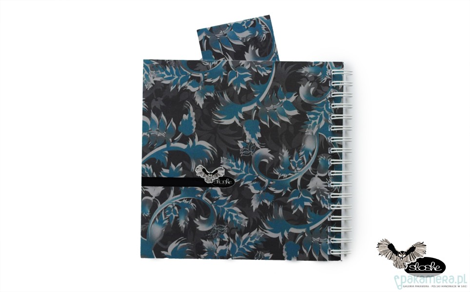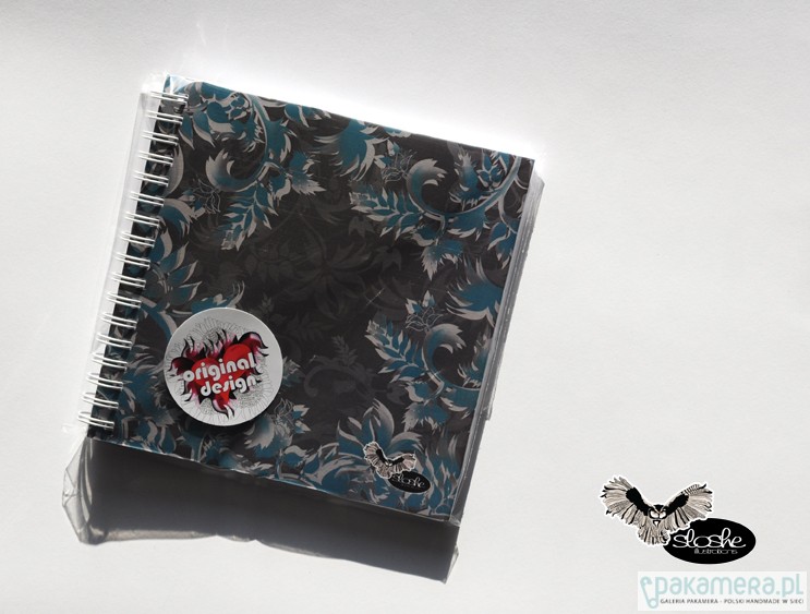 Grafika niebieskich pnączy na brązowym tle. W unikatowym kwadratowym kształcie, z dwoma różnymi grafikami na przedniej i tylnej okładce, z zakładką z tym samym motywem. Notatnik jest wykonany ręcznie, zawiera 70-80 kartek z wysokiej jakości 80gr białego papieru (możliwa kratka lub linia, na zamówienie, dopłata 2PLN), opakowany w celofanową folię z oryginalną naklejką. Wielkość 15cm x 15cm ( dostępny również w formacie 21cm, A5, A6)