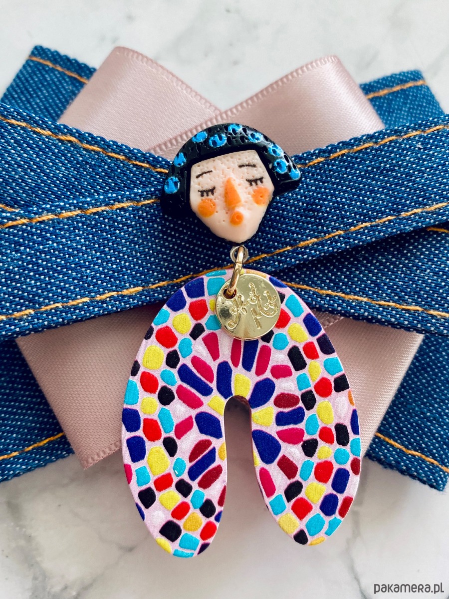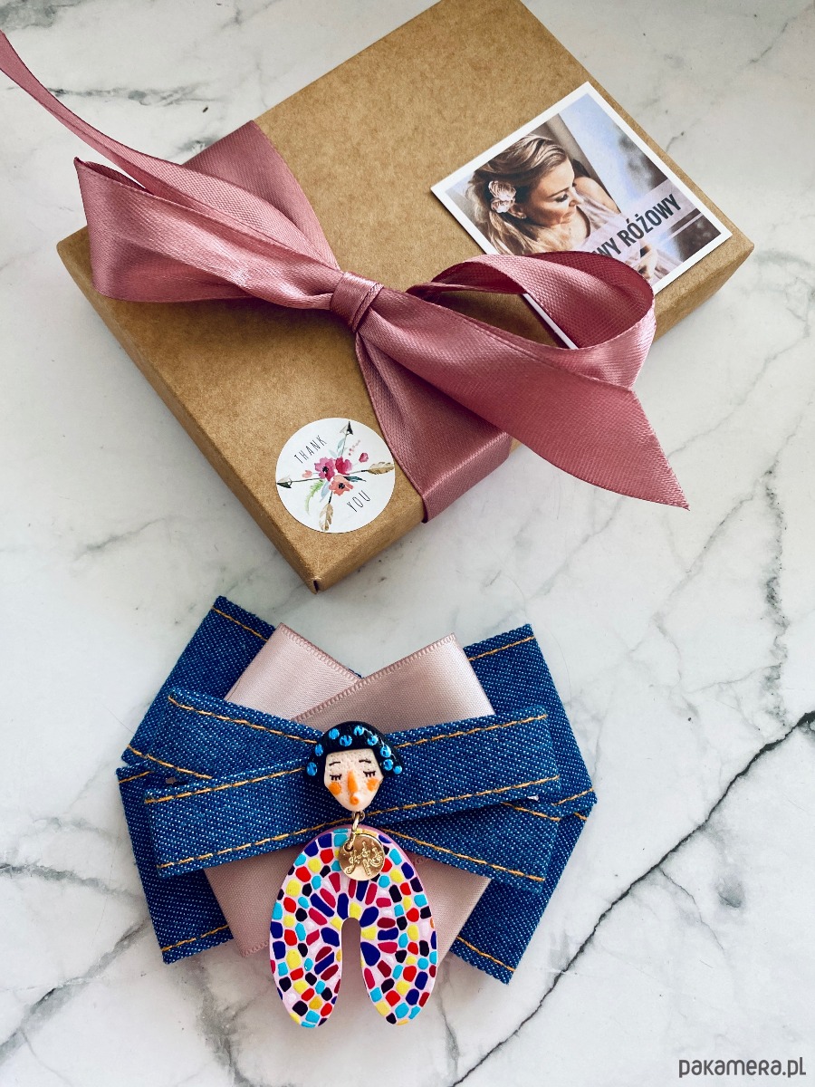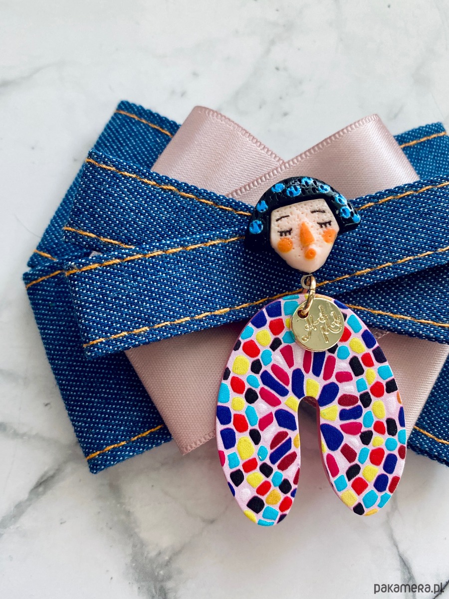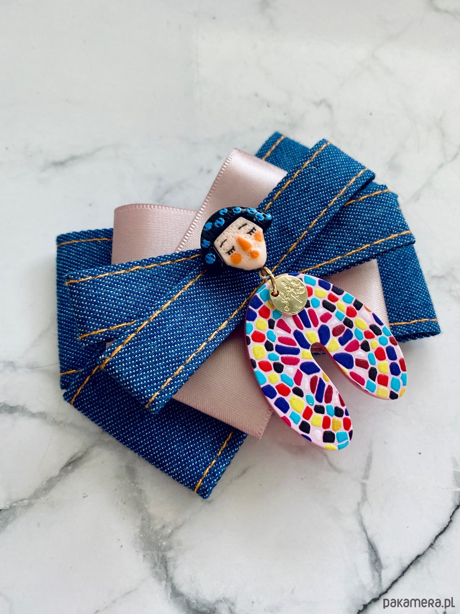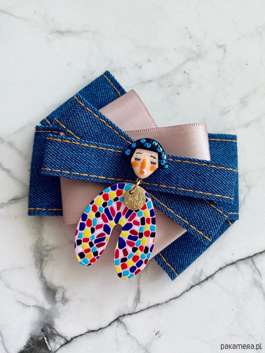 Broszka wykonana z wysokiej jakości taśm i dodatków.