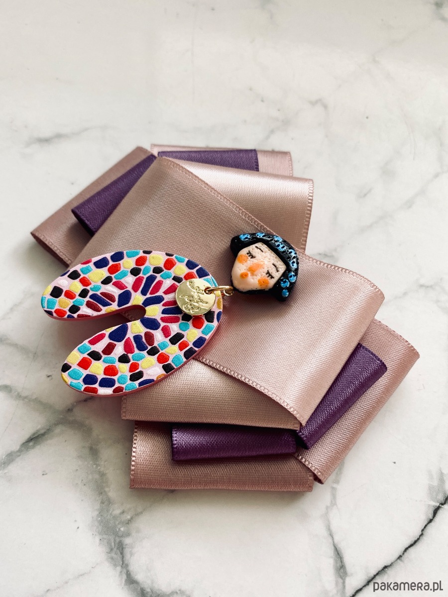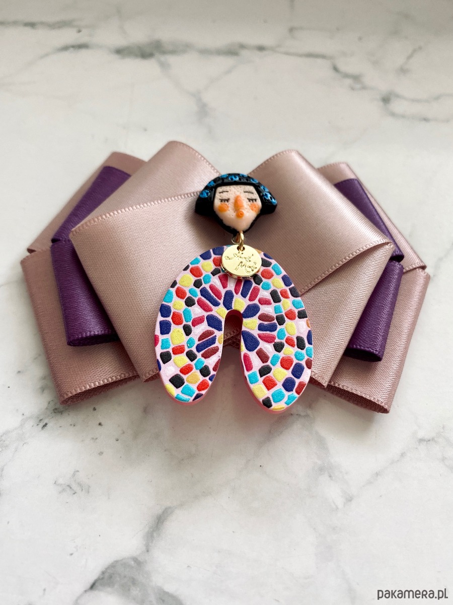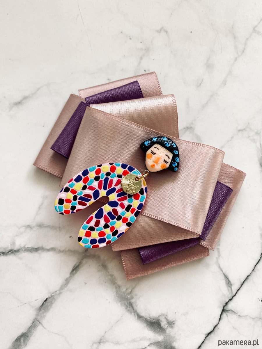 Broszka wykonana z wysokiej jakości taśm i dodatków.