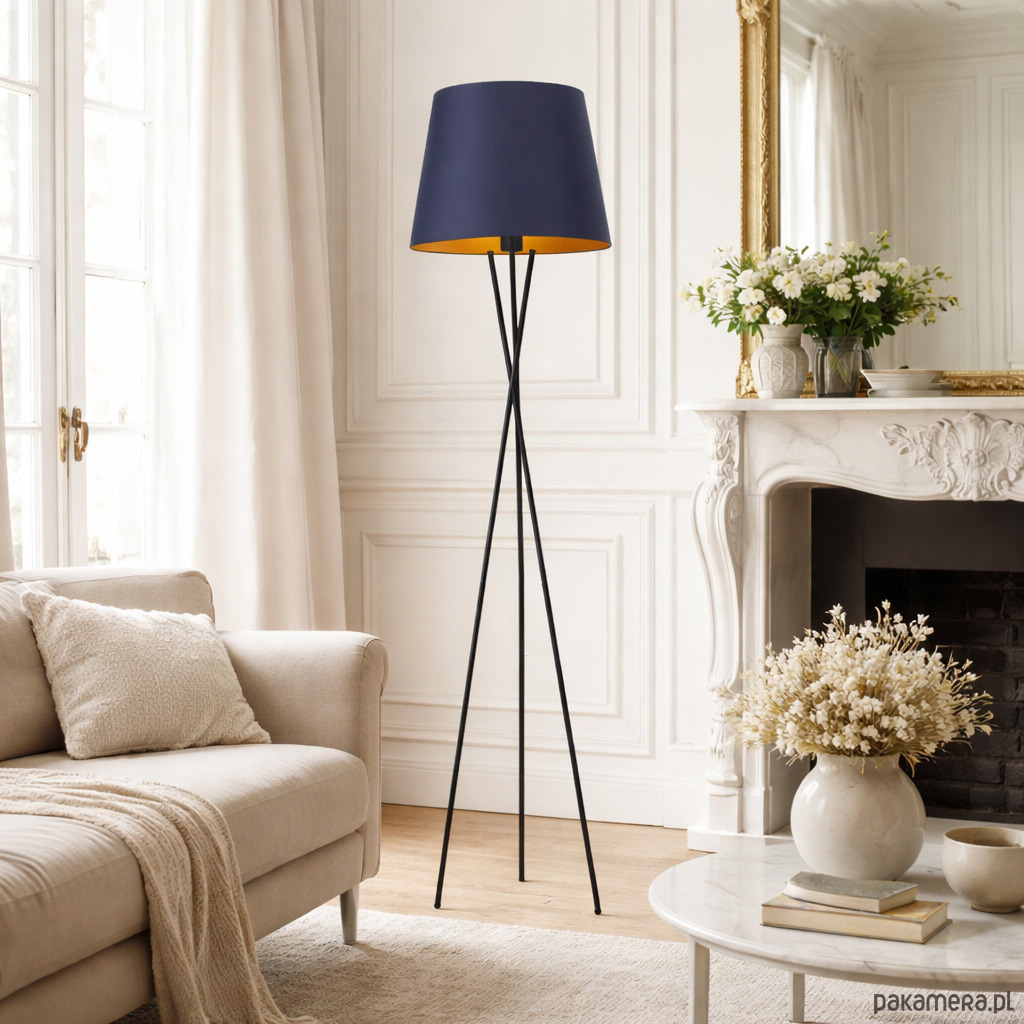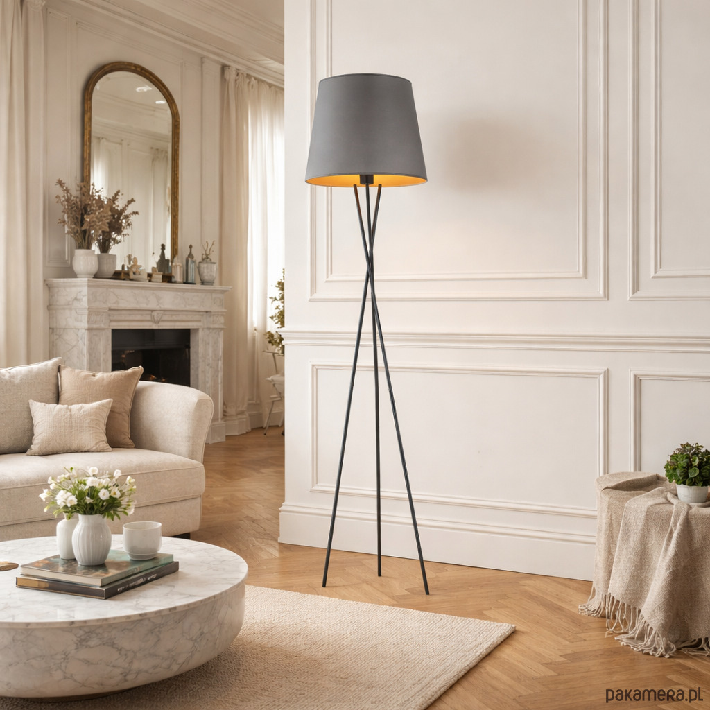 Nowoczesna lampa stojąca na trójnogu z abażurem TOKIO GOLD