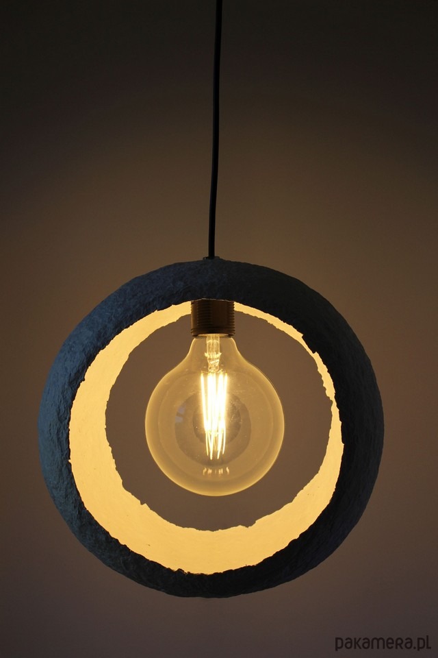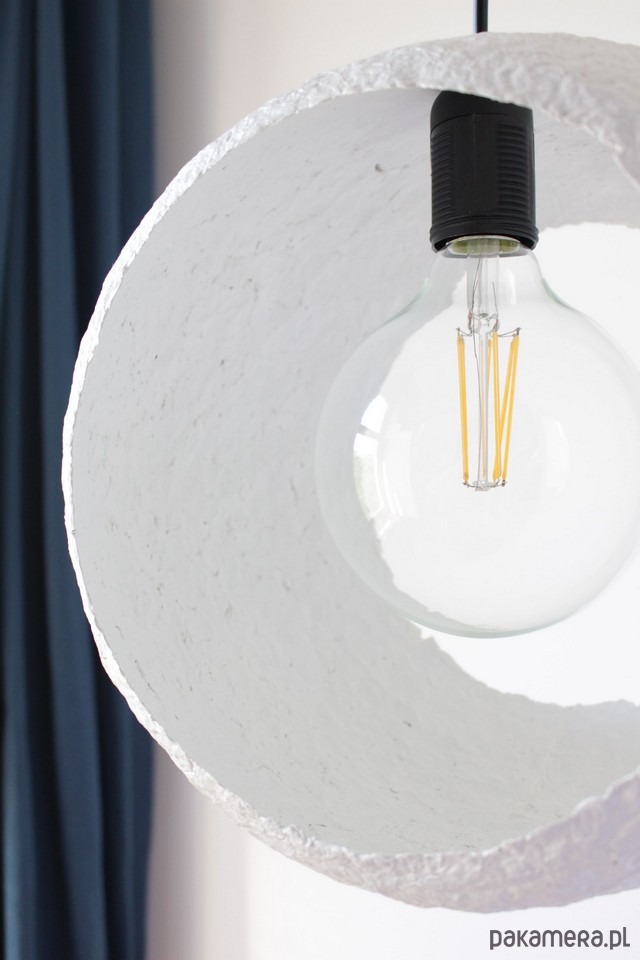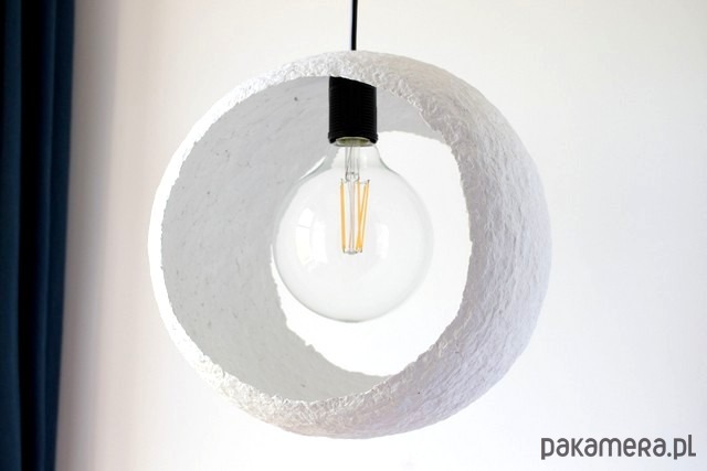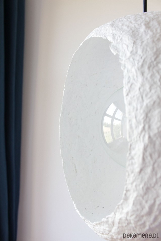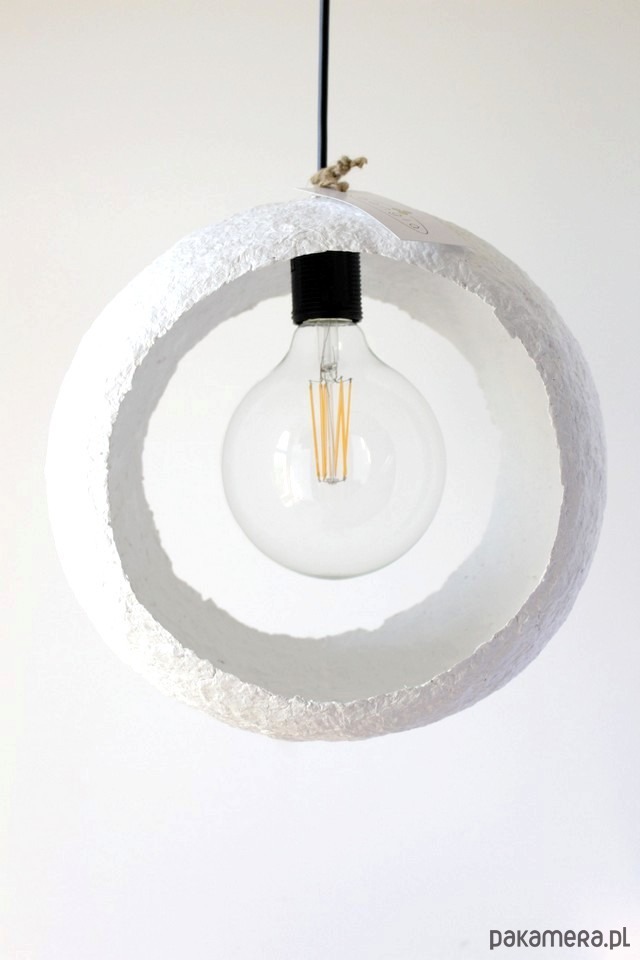 Lampa z kloszem wykonanym w duchu upcyklingu techniką papier mâché o nieregularnych krawędziach i ciekawej fakturze, w kształcie szerokiej obręczy. Na zewnątrz i wewnątrz malowana czystą bielą. Czarny zwis i oprawka podkreślają minimalistyczny charakter, lekko ją jednocześnie ożywiając. W całosci wykonana ręcznie, ma charakter unikatowy, dlatego każdy kolejny egzemplarz może nieco różnić sie od pokazowego.