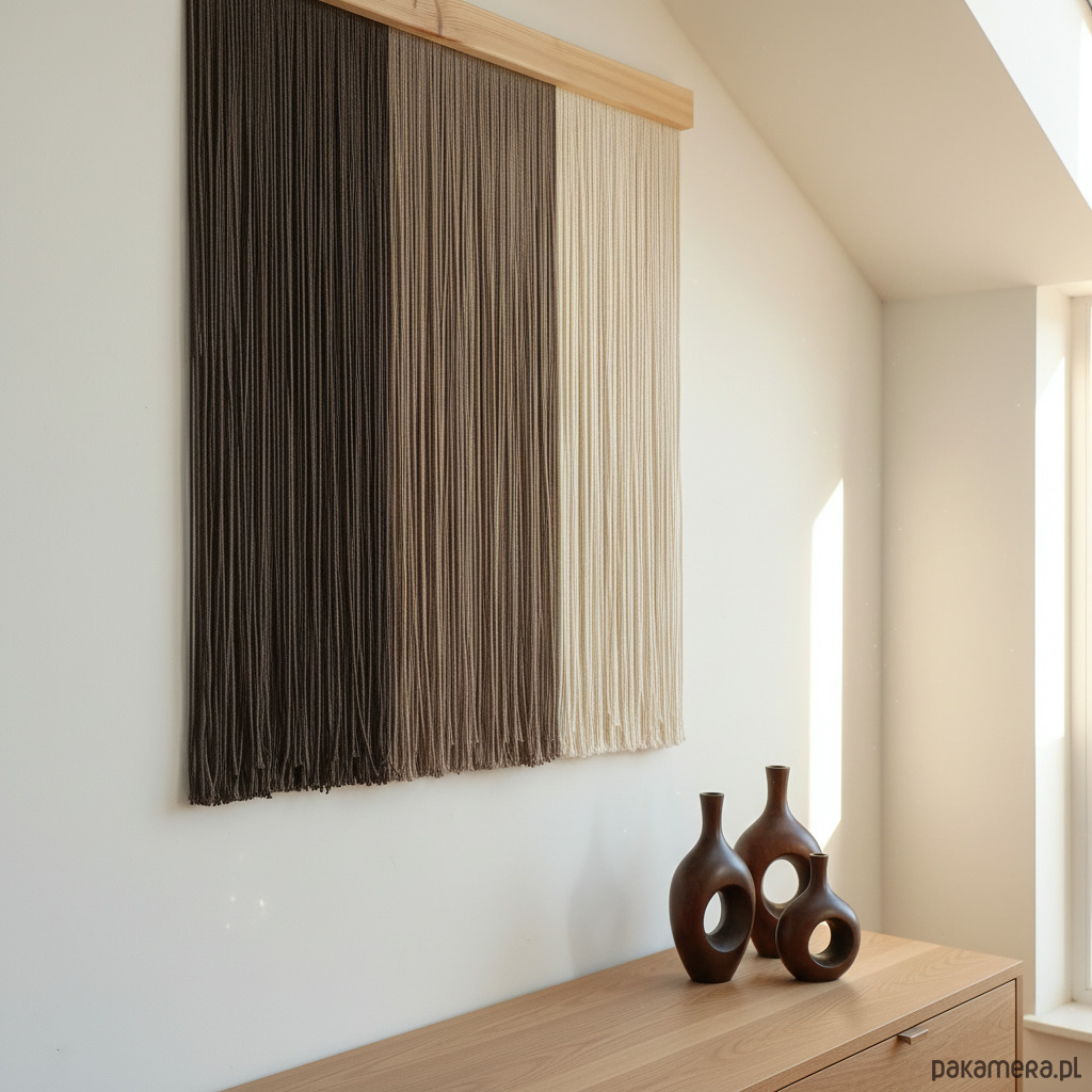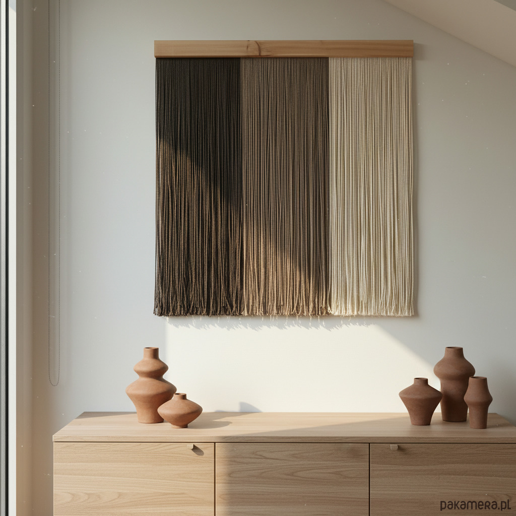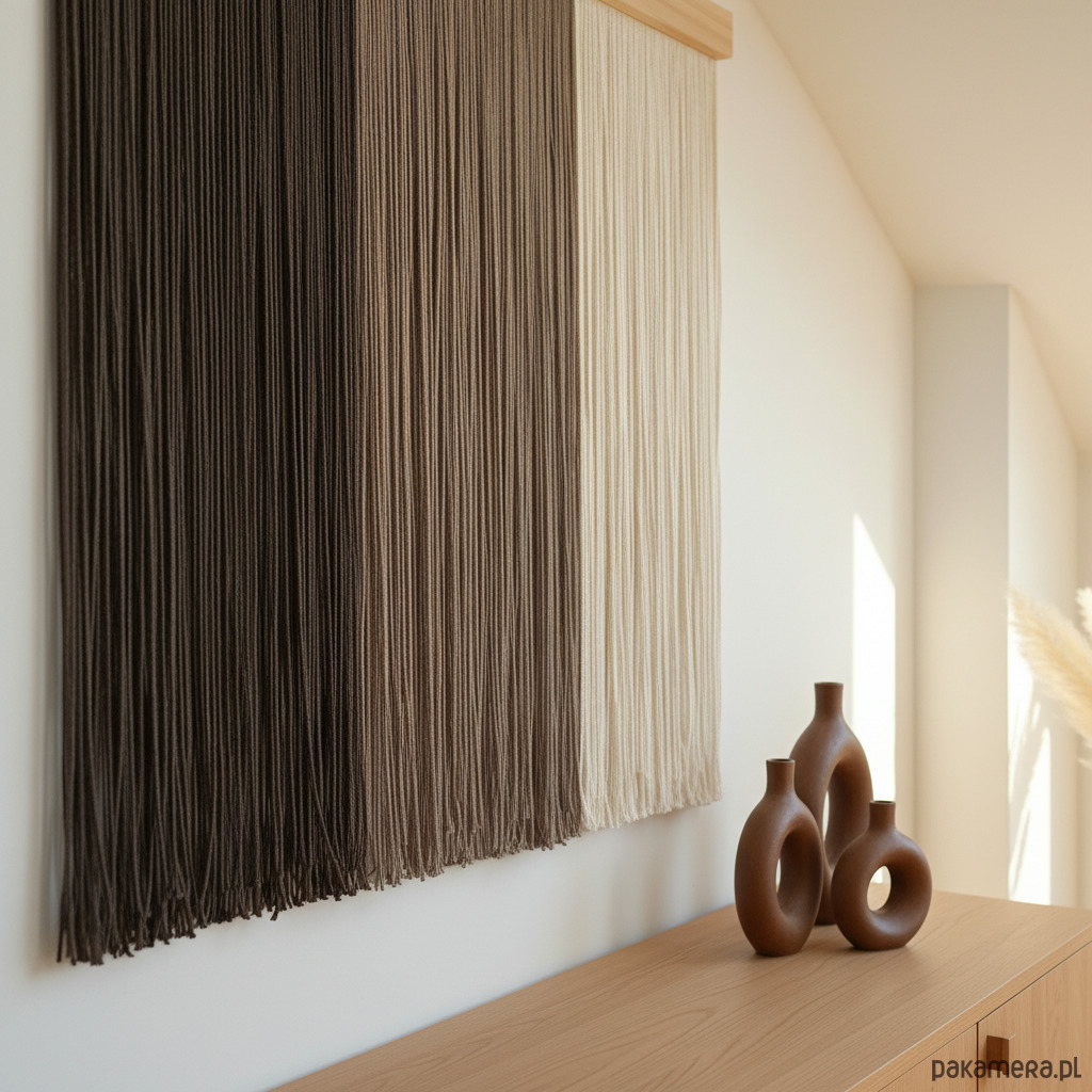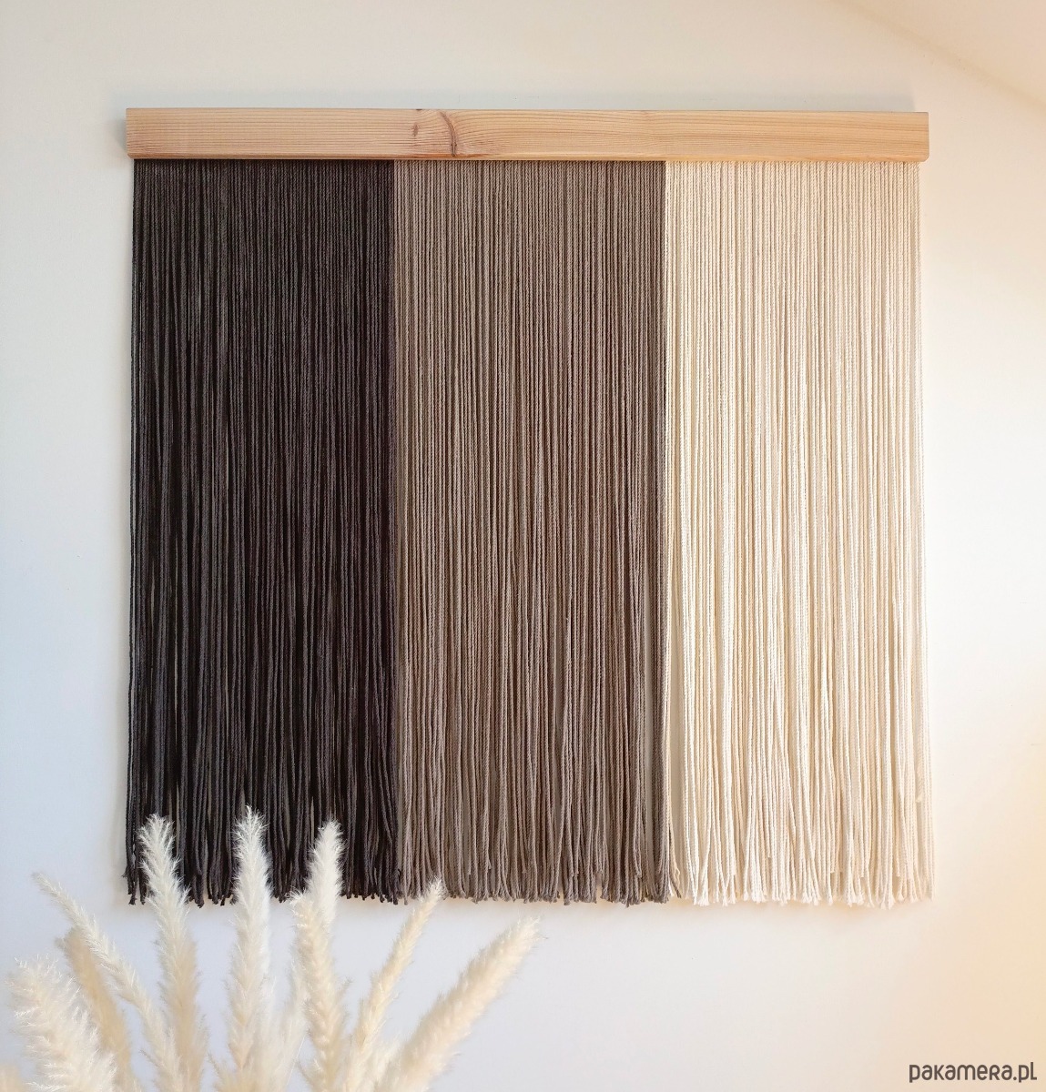 Piękna, naturalna, nowoczesna dekoracja ścienna. Wykonana na drewnianym profilu i sznurków z 100 % ekologicznej bawełny. Dwie warstwy zamocowanych sznurków, co powoduje, że dekoracja jest gęsta i uzyskuje świetny efekt.