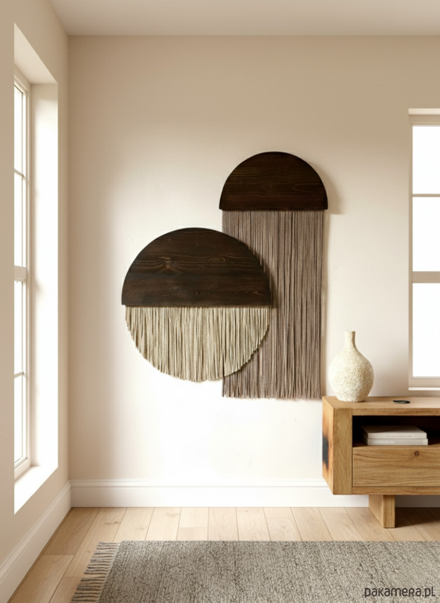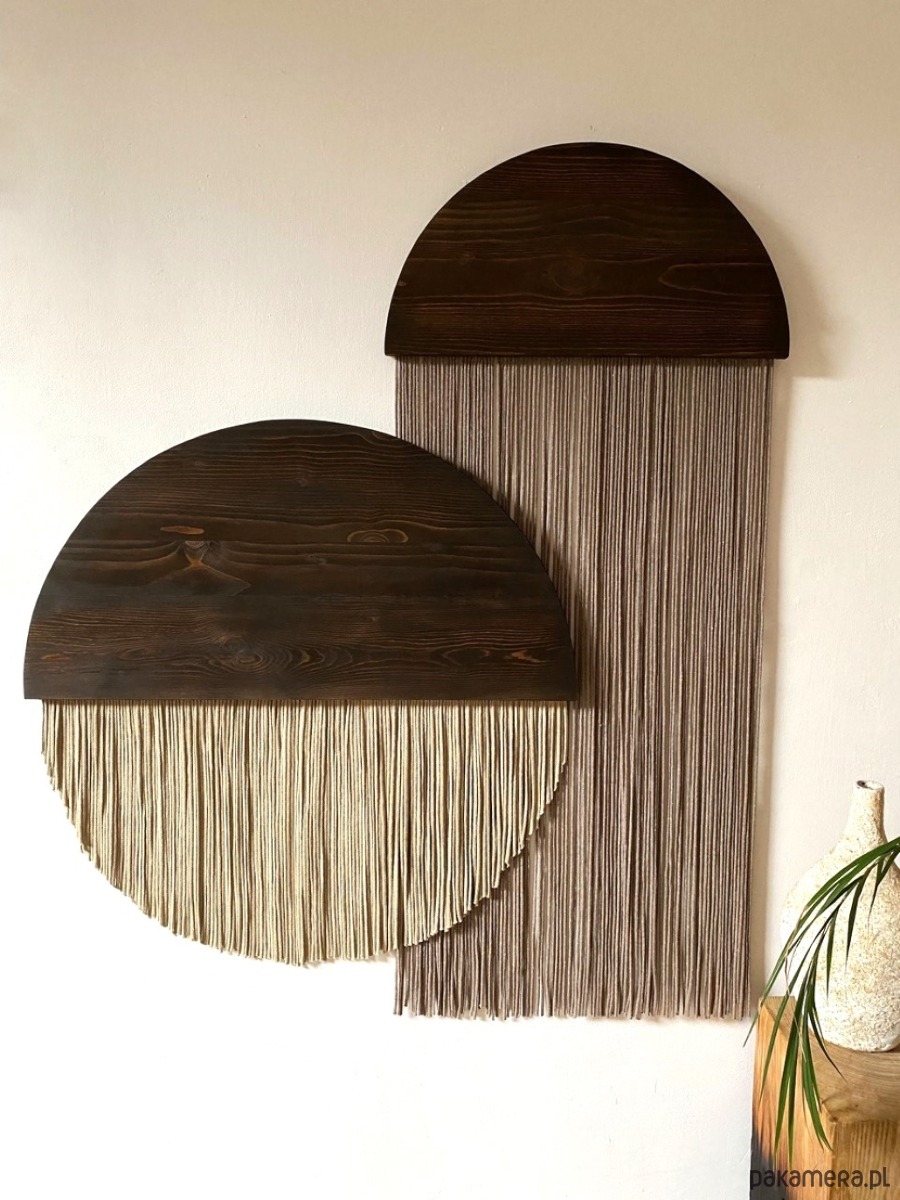 zestaw dwóch minimalistycznych nowoczesnych makram ściennych na półokrągłych drewnianych bazach - wyjątkowa dekoracja do Twojego wnętrza!