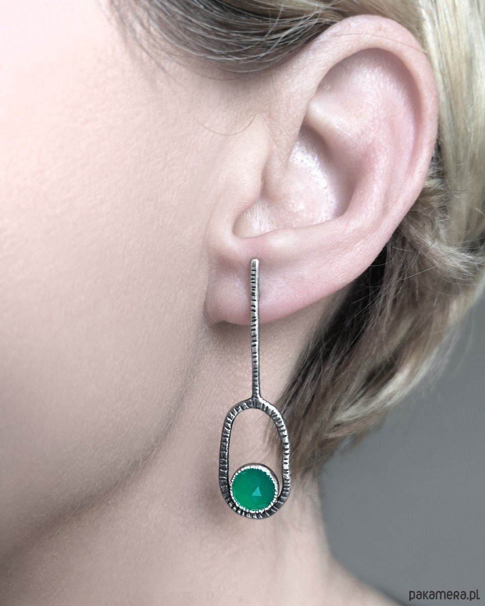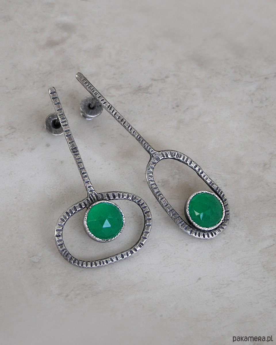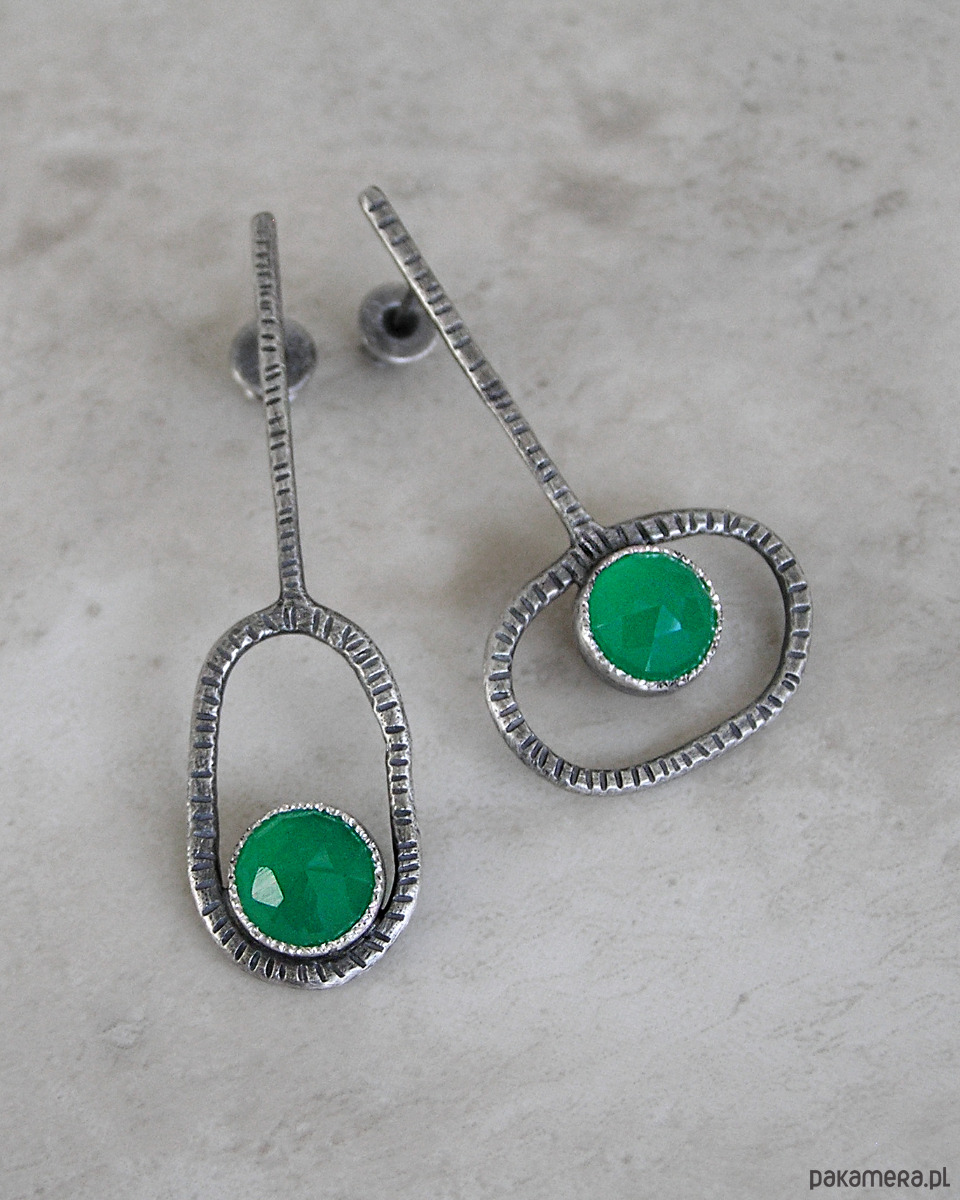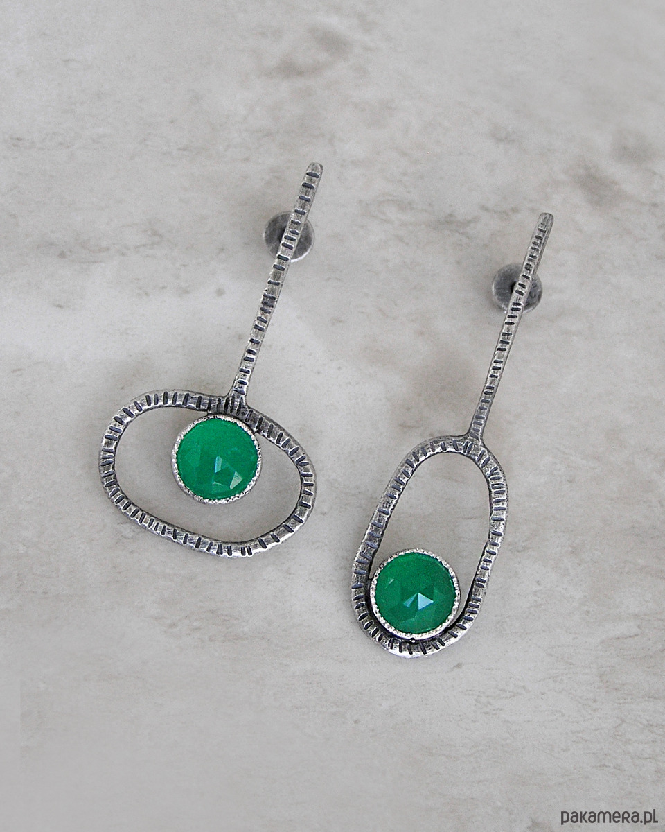Proste, nowoczesne, asymetryczne kolczyki klucze z fasetowanymi zielonymi agatami.