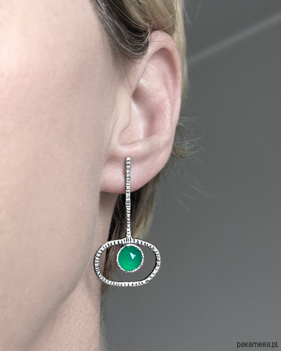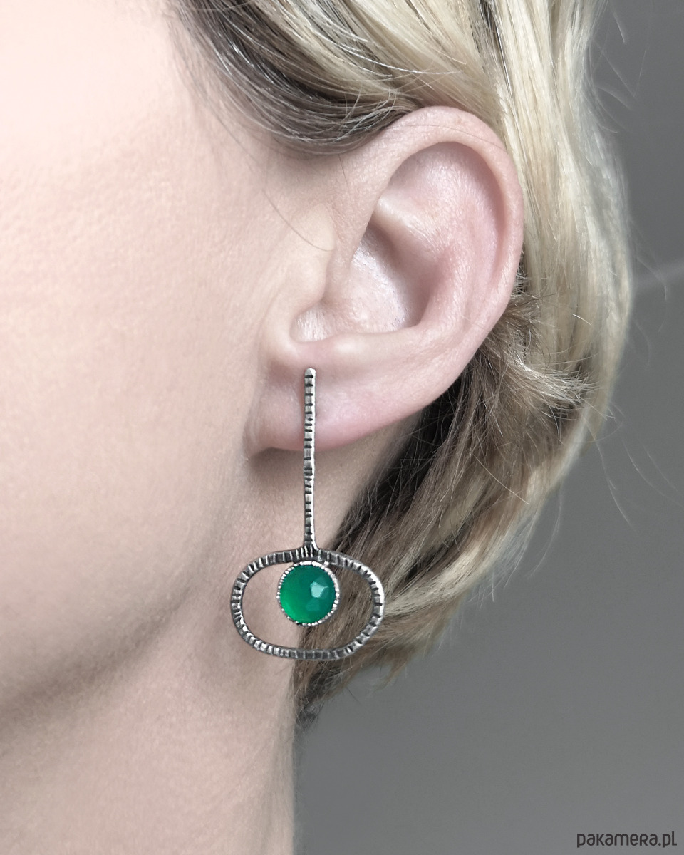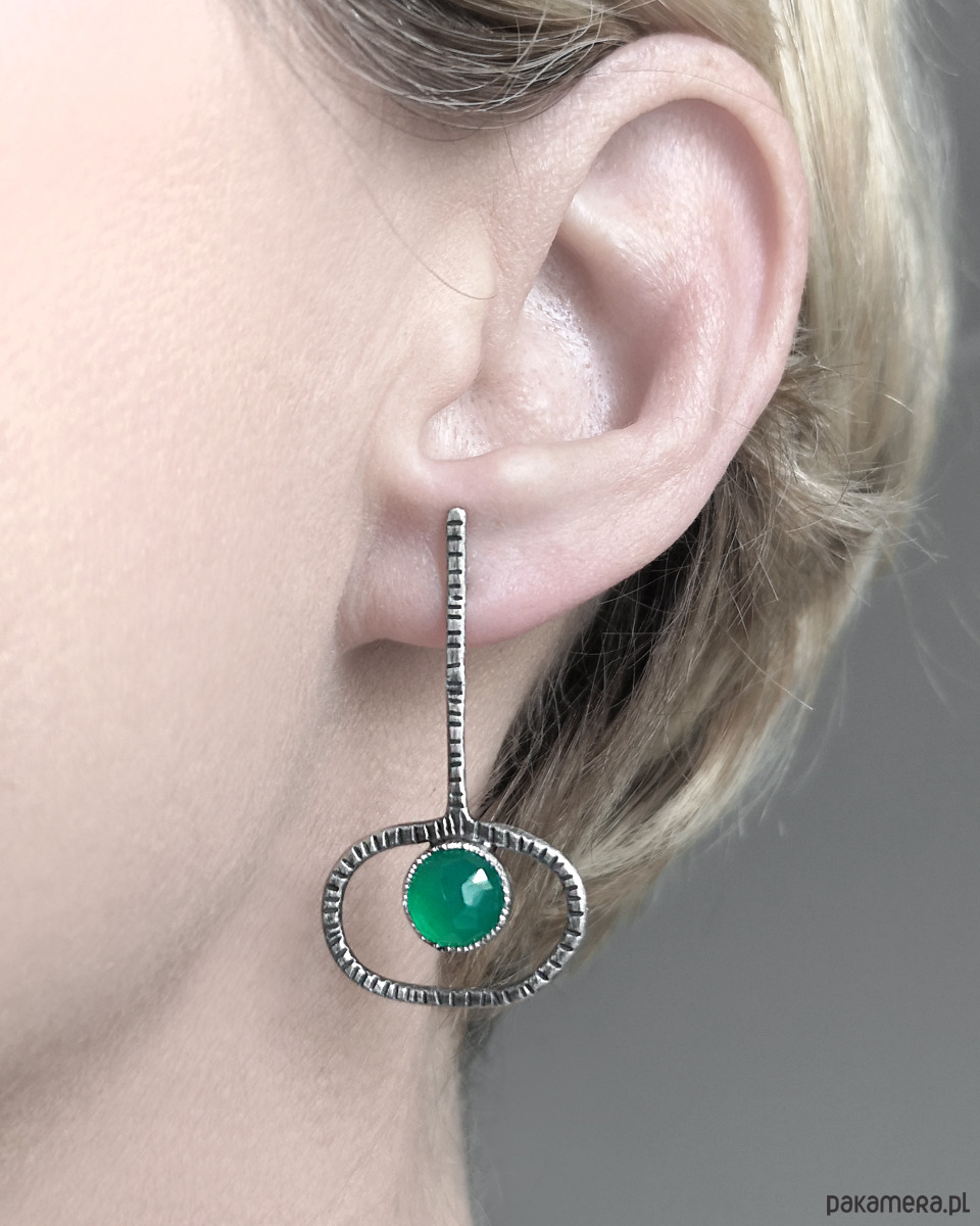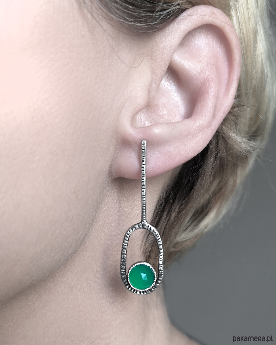 Proste, nowoczesne, asymetryczne kolczyki klucze z fasetowanymi zielonymi agatami.