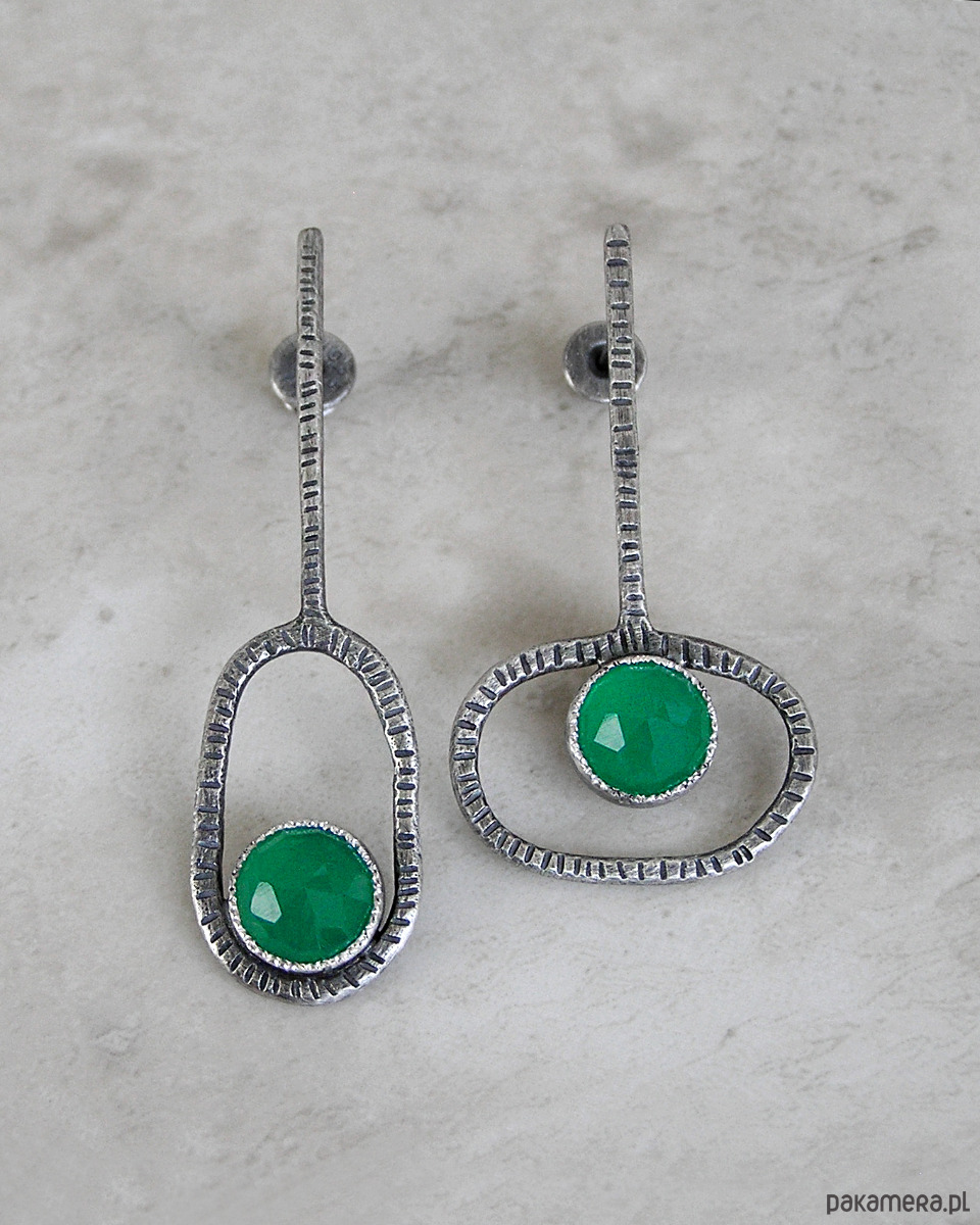 Nowoczesne asymetryczne kolczyki- srebro 925, zielone agaty