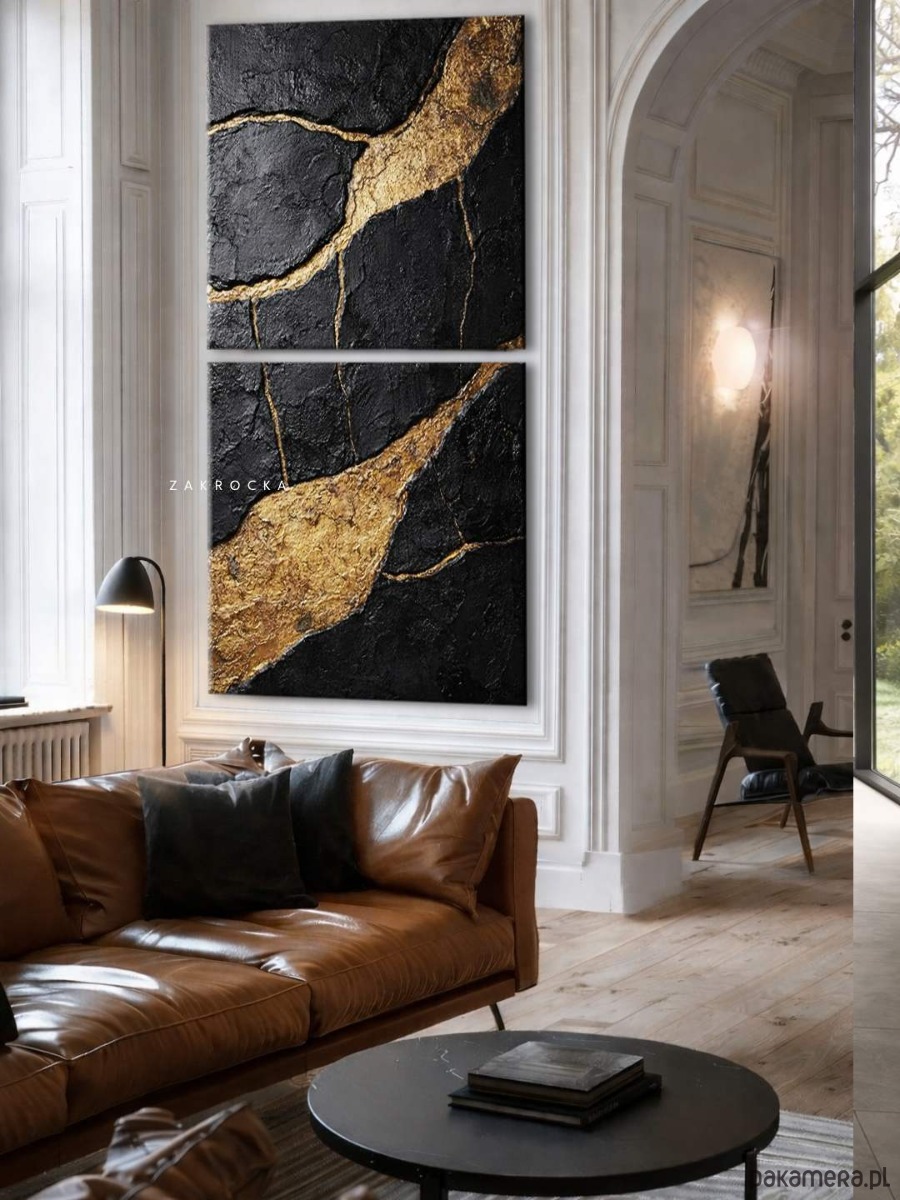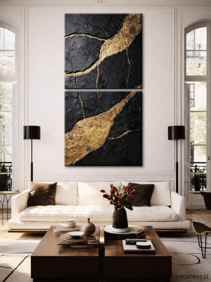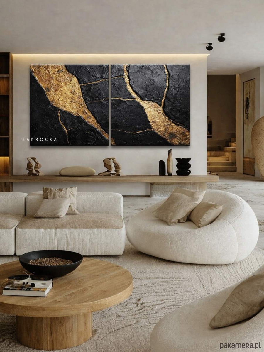 Nowoczesny obraz na płótnie w formie dyptyku przyciąga uwagę wyrazistą strukturą i elegancką kompozycją kolorów. Dominują tu głębokie czernie, grafit oraz kontrastujące jasne akcenty o charakterze kamiennej struktury. Ten obraz strukturalny doskonale wpisuje się w modne wnętrza minimalistyczne i japandi. To wyjątkowe obrazy do salonu, które budują atmosferę luksusu i spokoju.