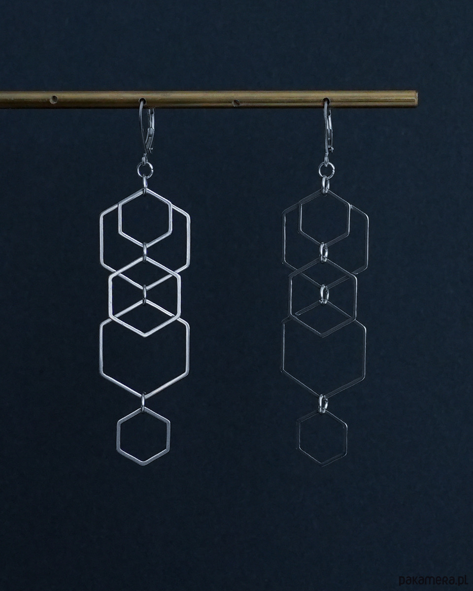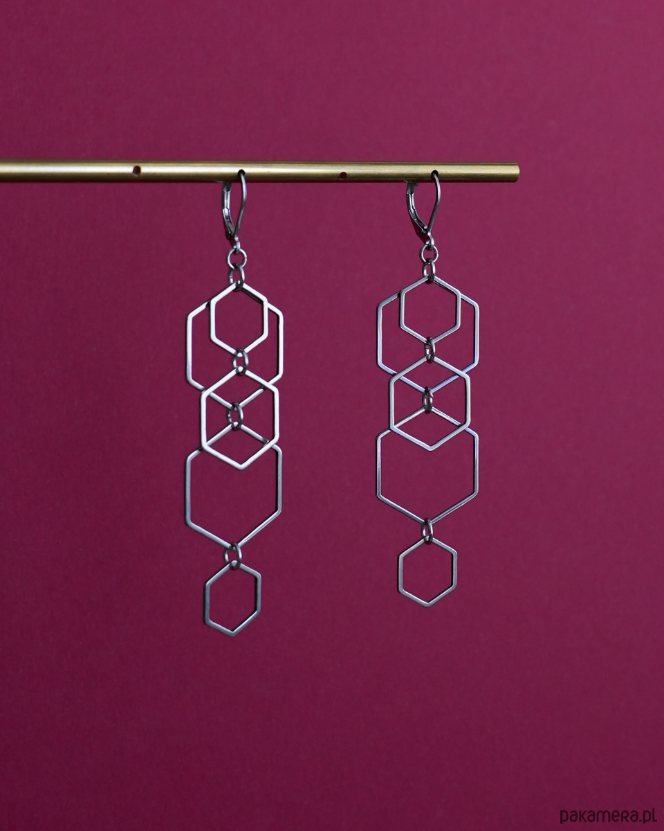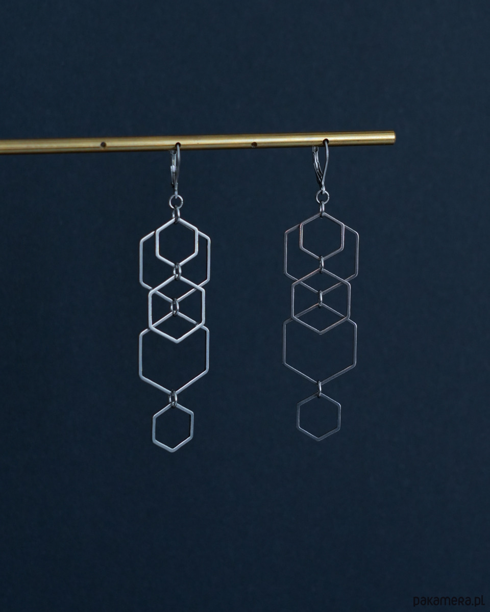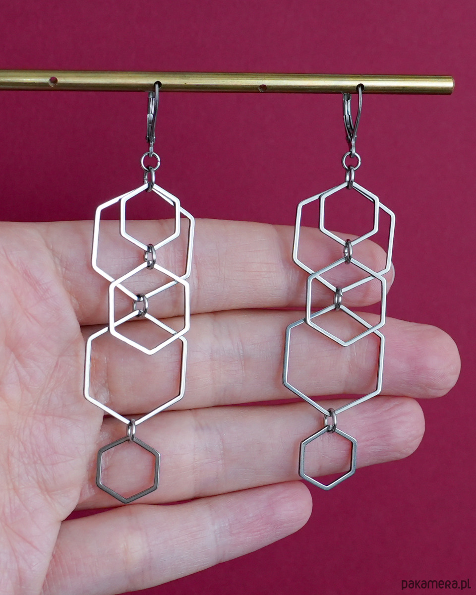 Oryginalne i nowoczesne kolczyki z heksagonami, w całości wykonane ze STALI SZLACHETNEJ. Kolczyki składają się z dwóch ruchomych elementów (nie tworzą jednej, sztywnej całości).