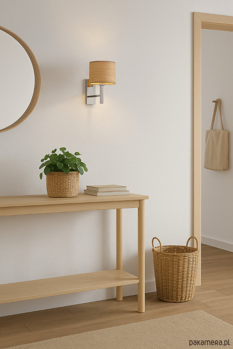Kinkiet ścienny TEGU z rodziny lamp ECO przyczyni się do stworzenia przyjemnej i kameralnej atmosfery w niejednym pomieszczeniu. Smukły stelaż lampy i cylindryczny abażur zachwycają prostotą i elegancją. Światło wydobywa się w górę i dół, rozświetlając abażur. Rozproszone światło na powierzchni abażura eksponuje drewniany wzór wytłaczany na jego powierzchni wprowadzając do wnętrza przytulny nastrój.