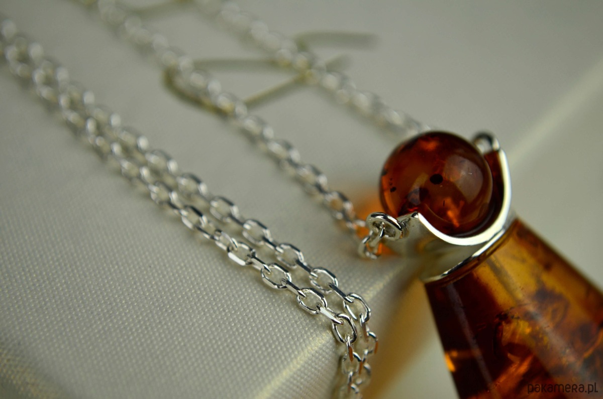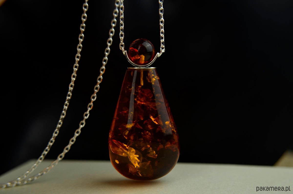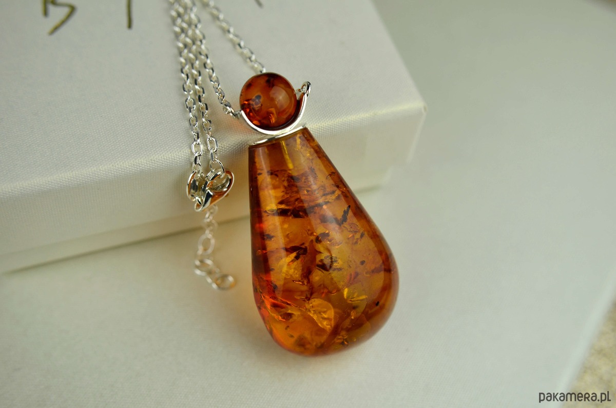 Duża koniakowa kropla bursztynu z okrągłą bursztynową "czapeczką"- oto naszyjnik, który swoim kształtem przypomina flakonik perfum. Bursztyn pięknie przepuszcza światło i jest pełen połyskujących w środku łusek.