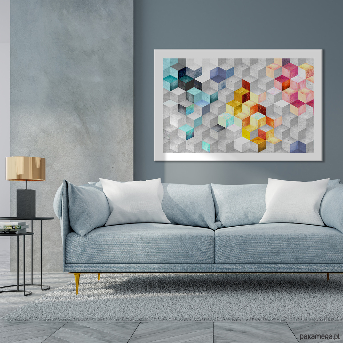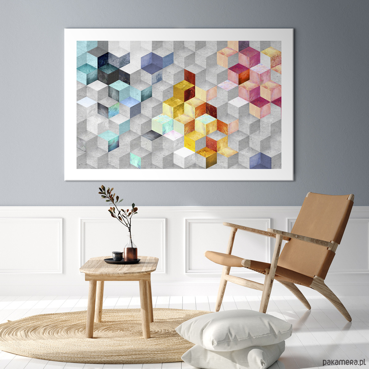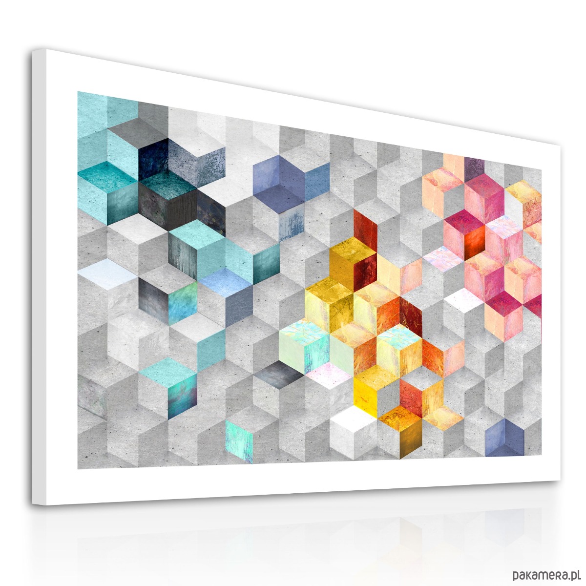 Nowoczesny obraz abstrakcyjny oparty na geometrycznym rytmie sześcianów. Stonowane szarości przełamane są akcentami turkusu, błękitu, żółci i ciepłych pomarańczy, dzięki czemu całość jest dynamiczna, ale nadal uporządkowana i lekka wizualnie. To kompozycja, która dobrze „pracuje” na ścianie – przyciąga wzrok, ale nie męczy.