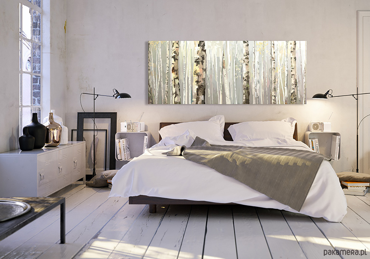 Obraz wprowadza do wnętrza lekkość i wyciszenie, przywołując atmosferę spaceru po jasnym, spokojnym lesie. Pionowe linie drzew nadają kompozycji elegancji i rytmu, dzięki czemu praca świetnie sprawdzi się jako dekoracja nad sofą, łóżkiem czy w przestrzeni biurowej.