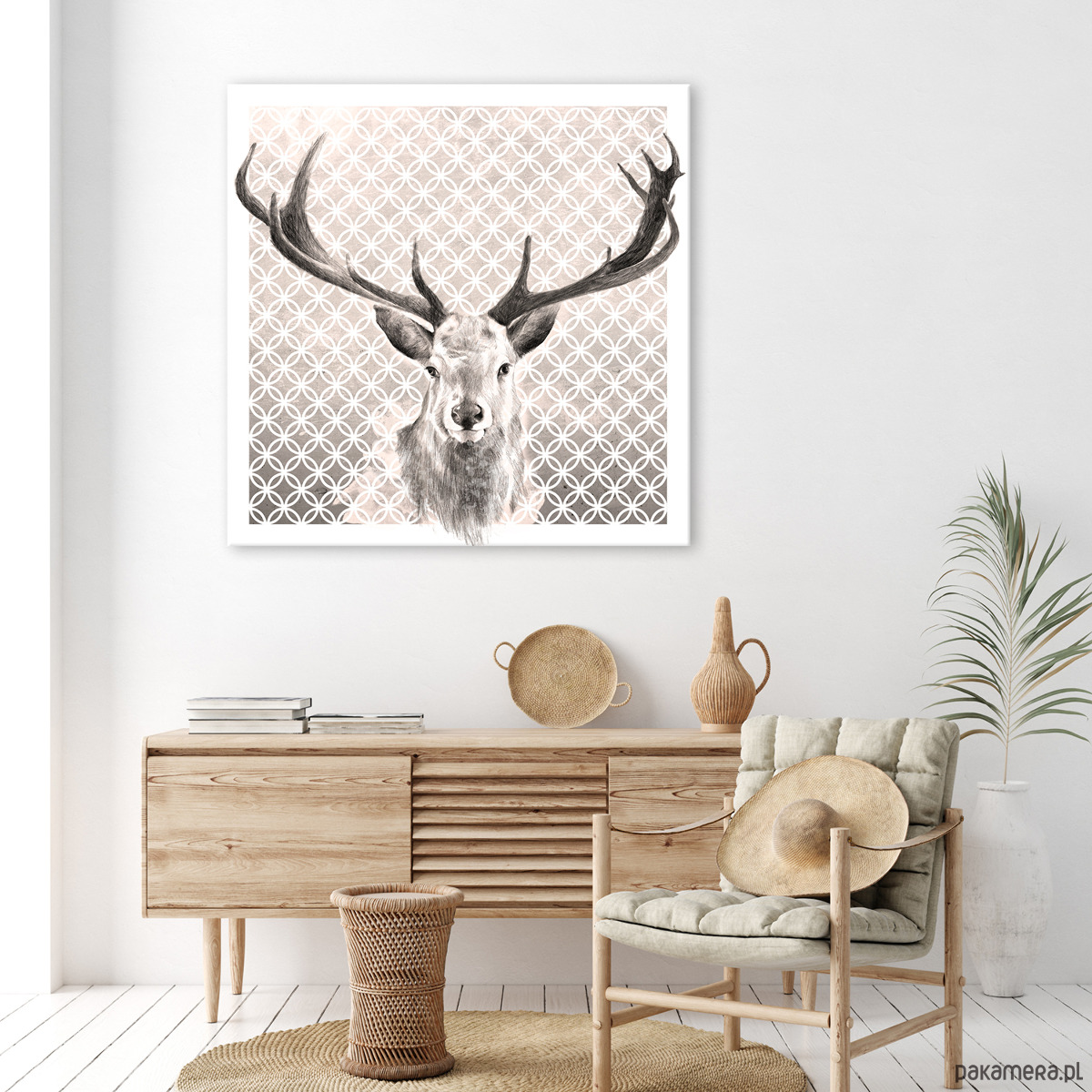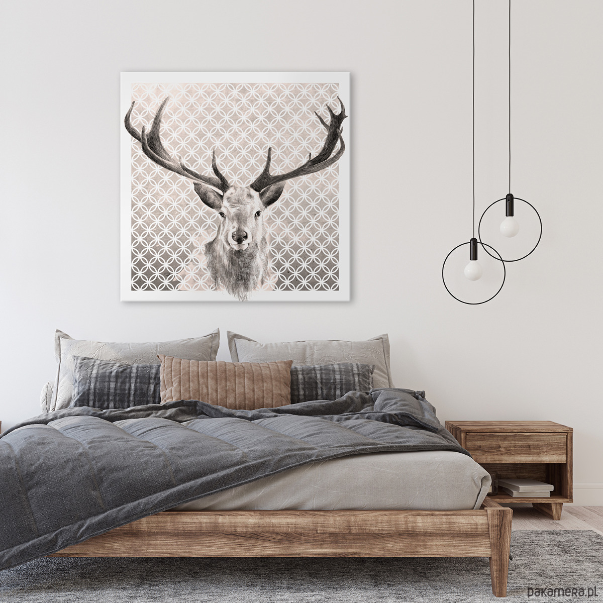 Nowoczesny obraz z minimalistycznym portretem jelenia na tle subtelnego, geometrycznego wzoru. Stonowana kolorystyka w odcieniach szarości i beżu sprawia, że całość jest elegancka i spokojna w odbiorze, a wyrazista forma poroża nadaje kompozycji charakteru. To dekoracja, która przyciąga uwagę, ale nie dominuje wnętrza.