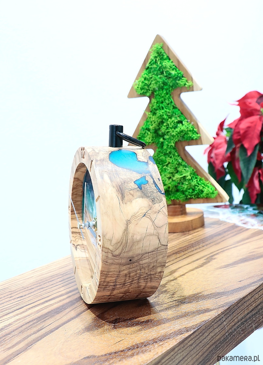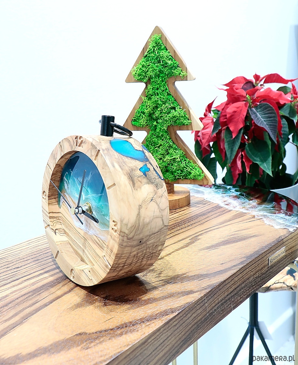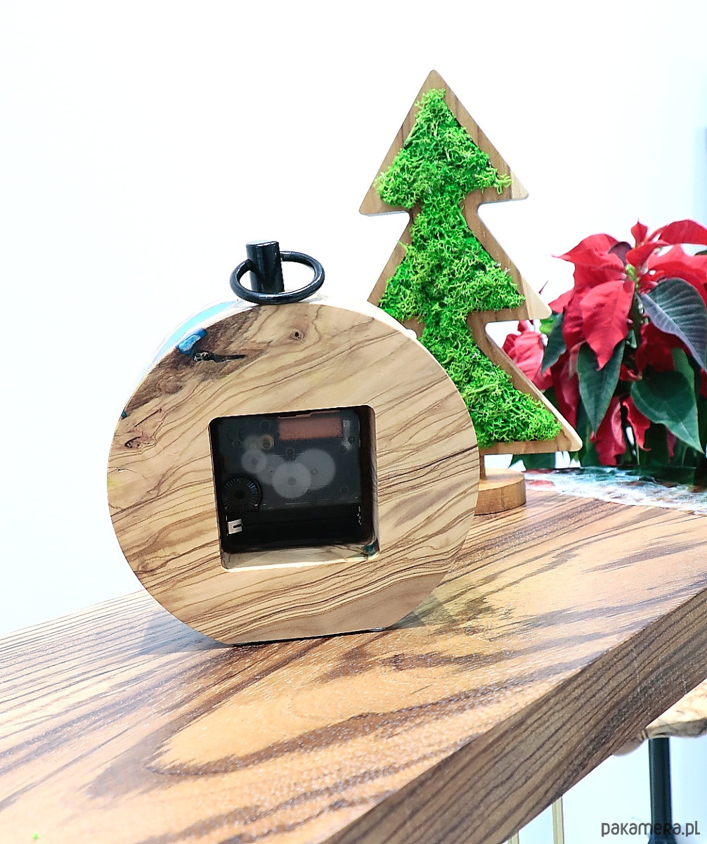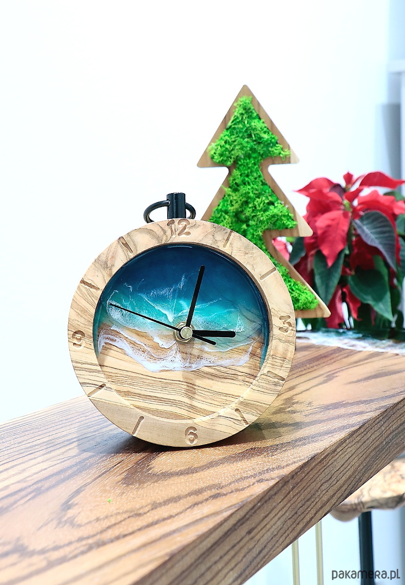 Autorski zegar stojący, wykonany ręcznie z jednego kawałka drewna oliwki. Tarcza wypełniona żywicą epoksydową, z efektem fali morskiej. Zegar posiada cichy mechanizm (zasilany bateriami AA).