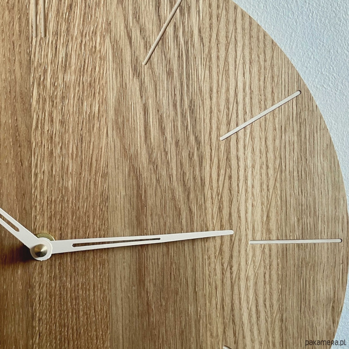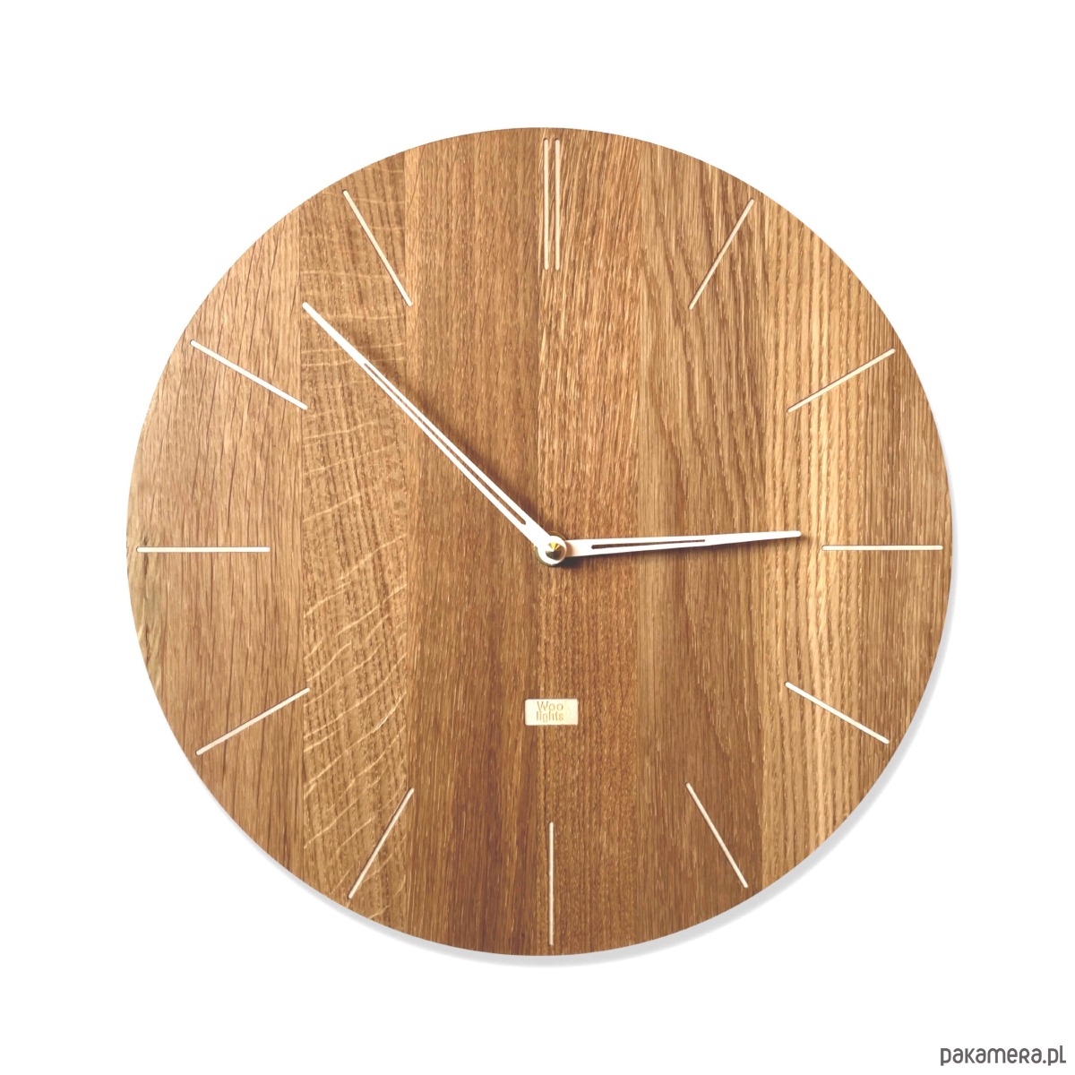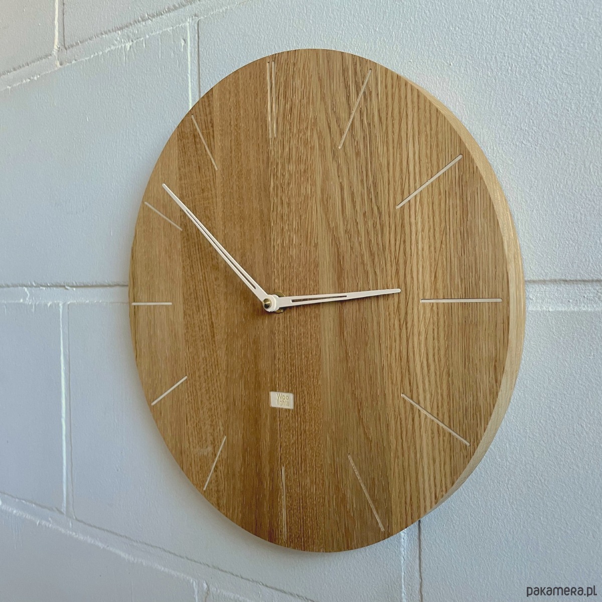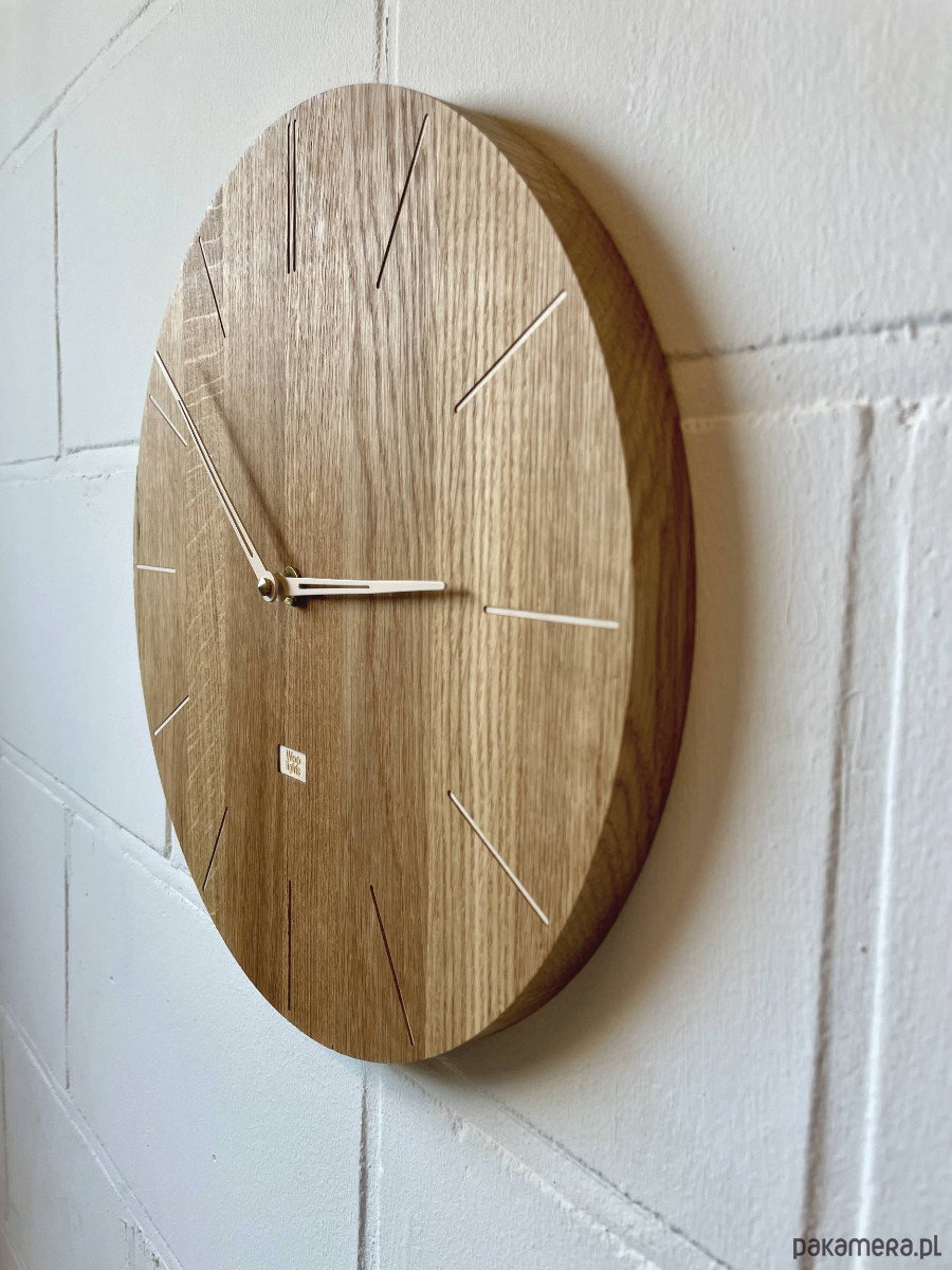Zegar ścienny wykonany z drewna z prostymi znacznikami za specjalnie zaprojektowanymi smukłymi wskazówkami.