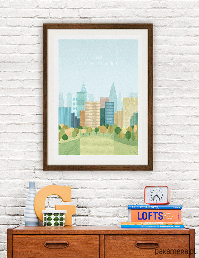 Plakat w stylu vintage przedstawiający Manhattanu z perspektywy Central Parku. Na pierwszym planie parkowa roślinność przybiera jesienne barwy. Tło tworzy gęsta zabudowa z ikonicznymi nowojorskimi wieżowcami Empire State Building i Chrysler Building. Inspirowany plakatami podróżniczymi z lat 20-tych XX wieku.
