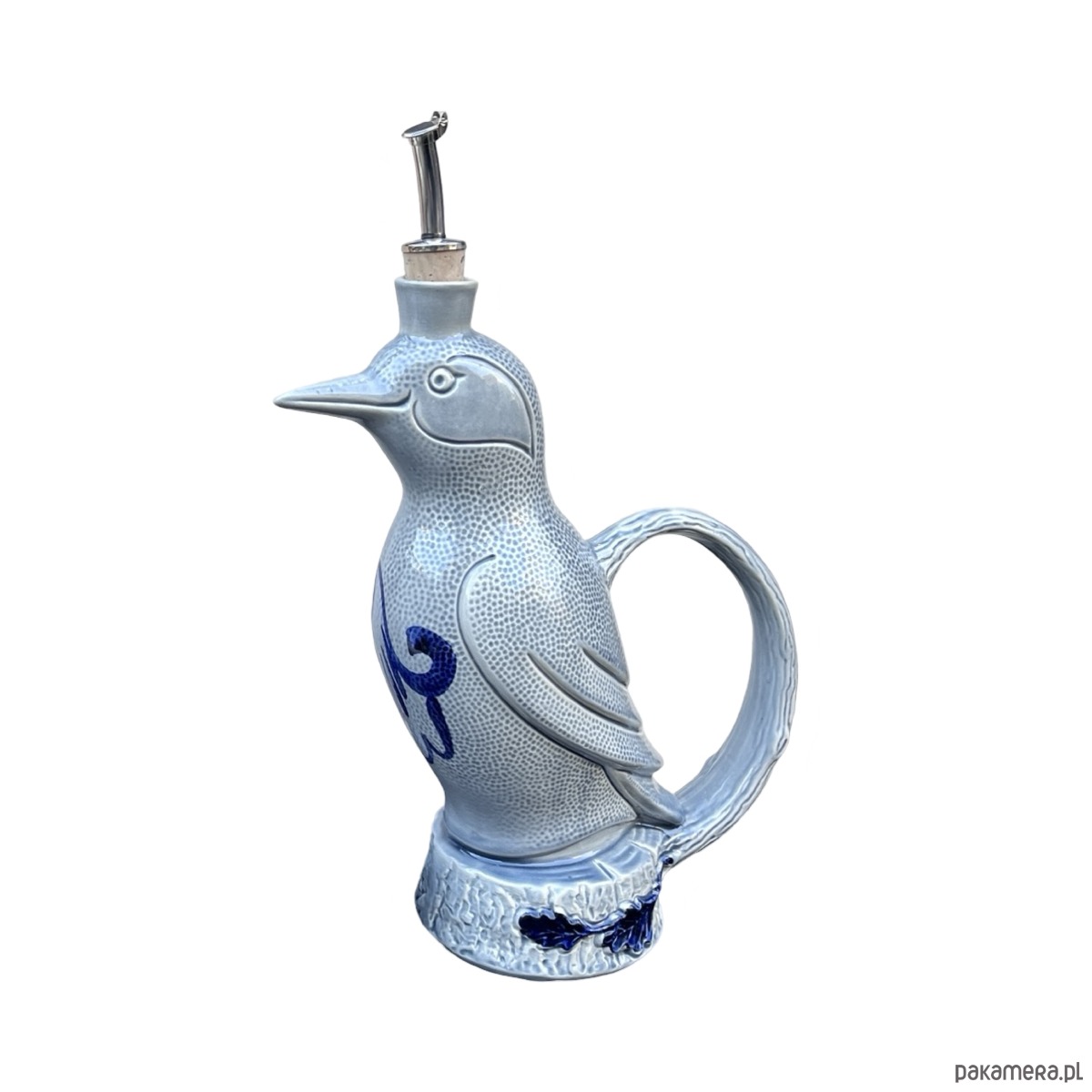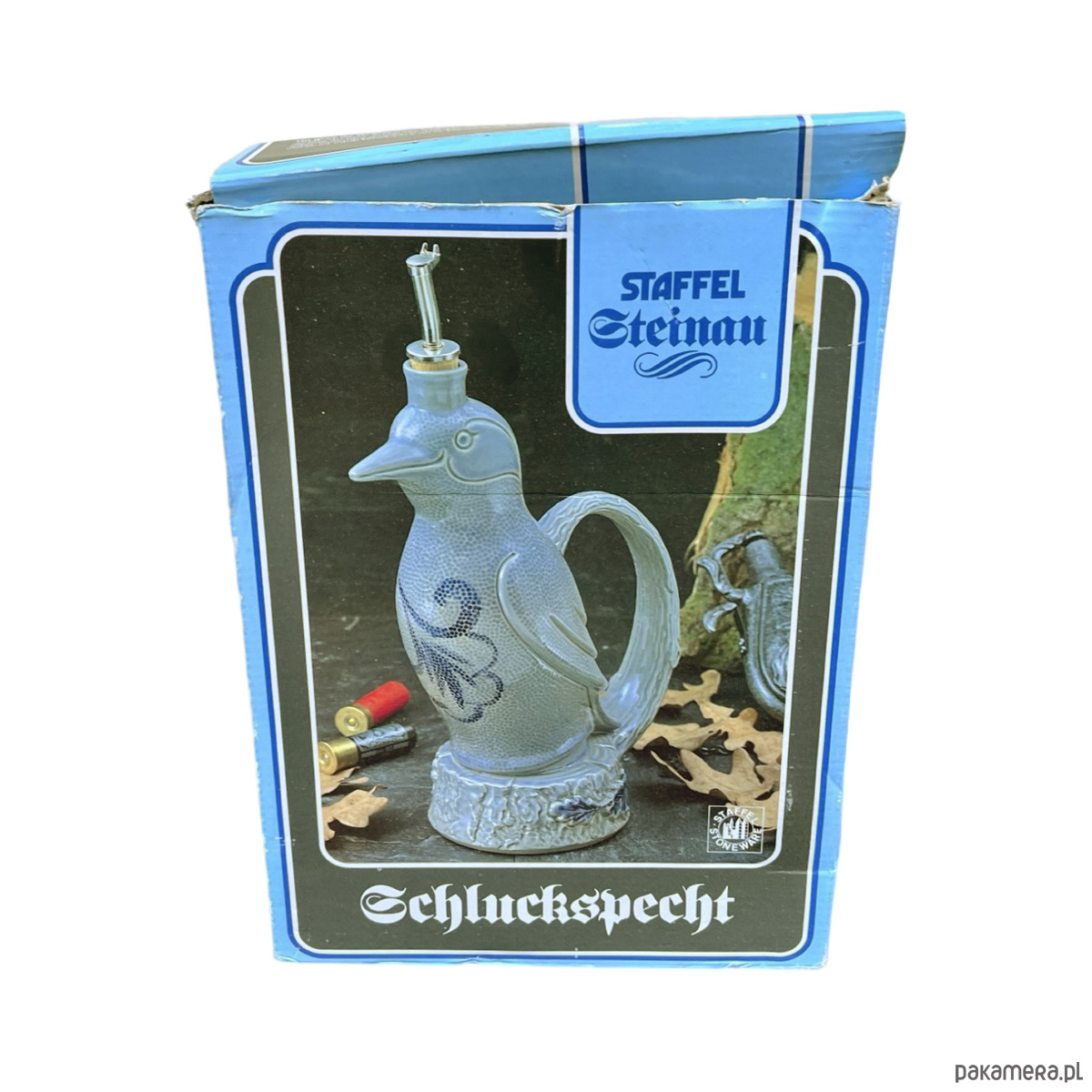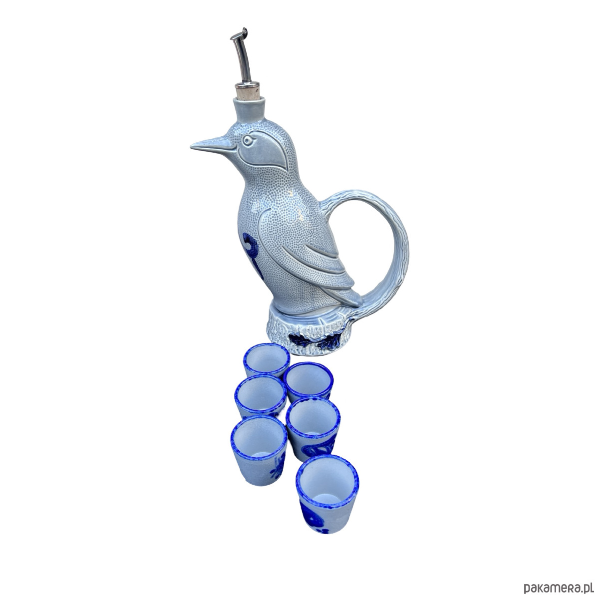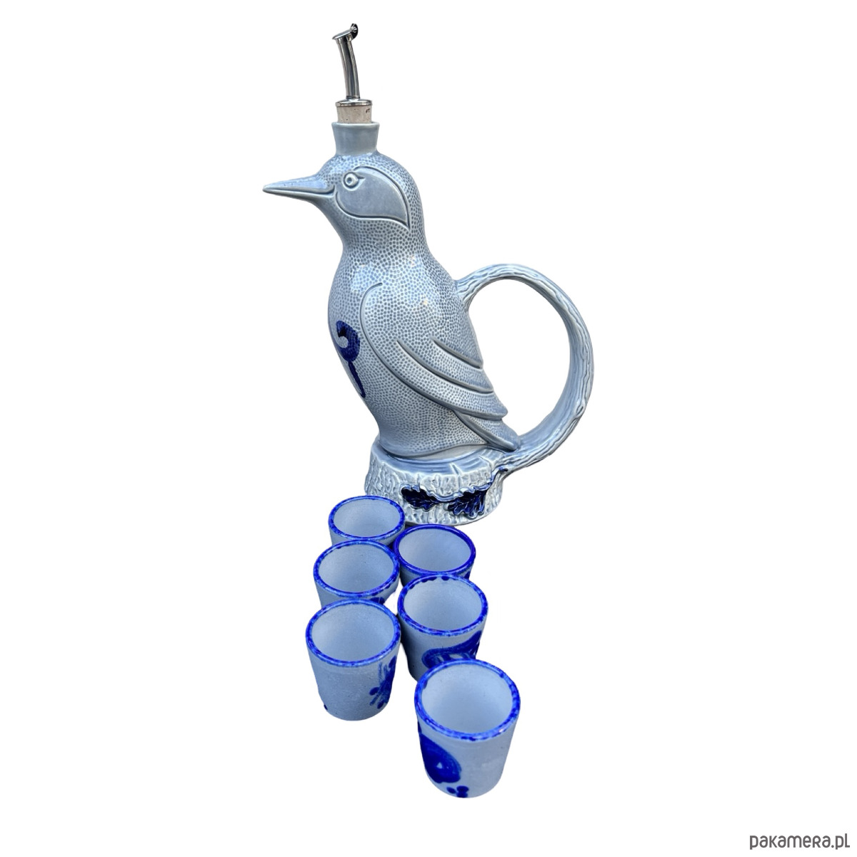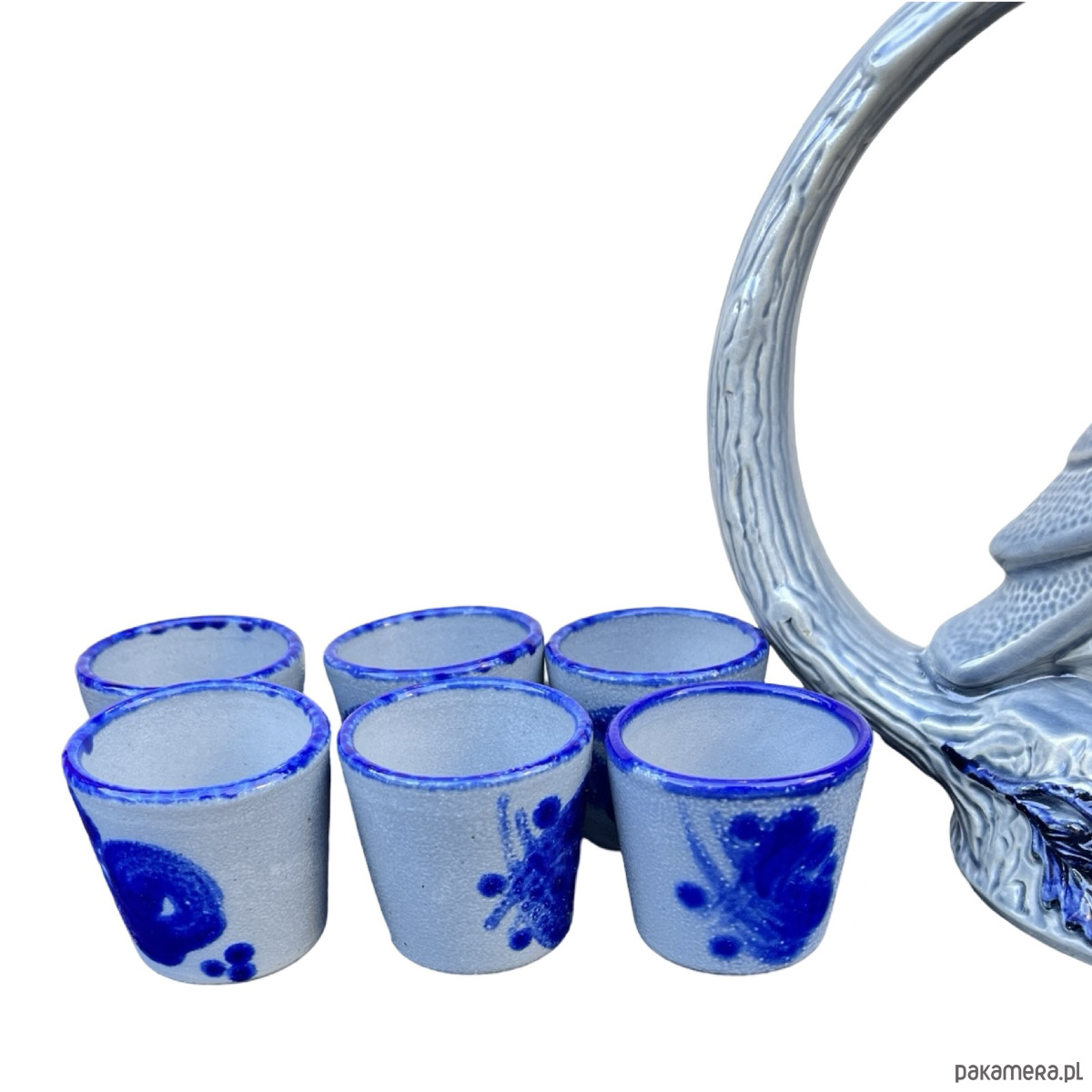 Kamionkowy serwis do napojów zimnych, likierów w stylu mid-century modern wyprodukowany w Niemczech w drugiej połowie XX wieku dla Staffel Stoneware. Zestaw dla 6 osób, w którego skład wchodzi dzbanek z uchem w kształcie ptaka- kawki oraz 6 kieliszków. Serwis o ciekawej, nietuzinkowej formie zdobiony malaturą w motywy florystyczne w kolorze kobaltowym. Zestaw zachowany w idealnym - jest to przedmiot typu new-old stock - nowy, nigdy nie używany z oryginalnym pudełkiem. przedmiot sygnowany w podstawie.