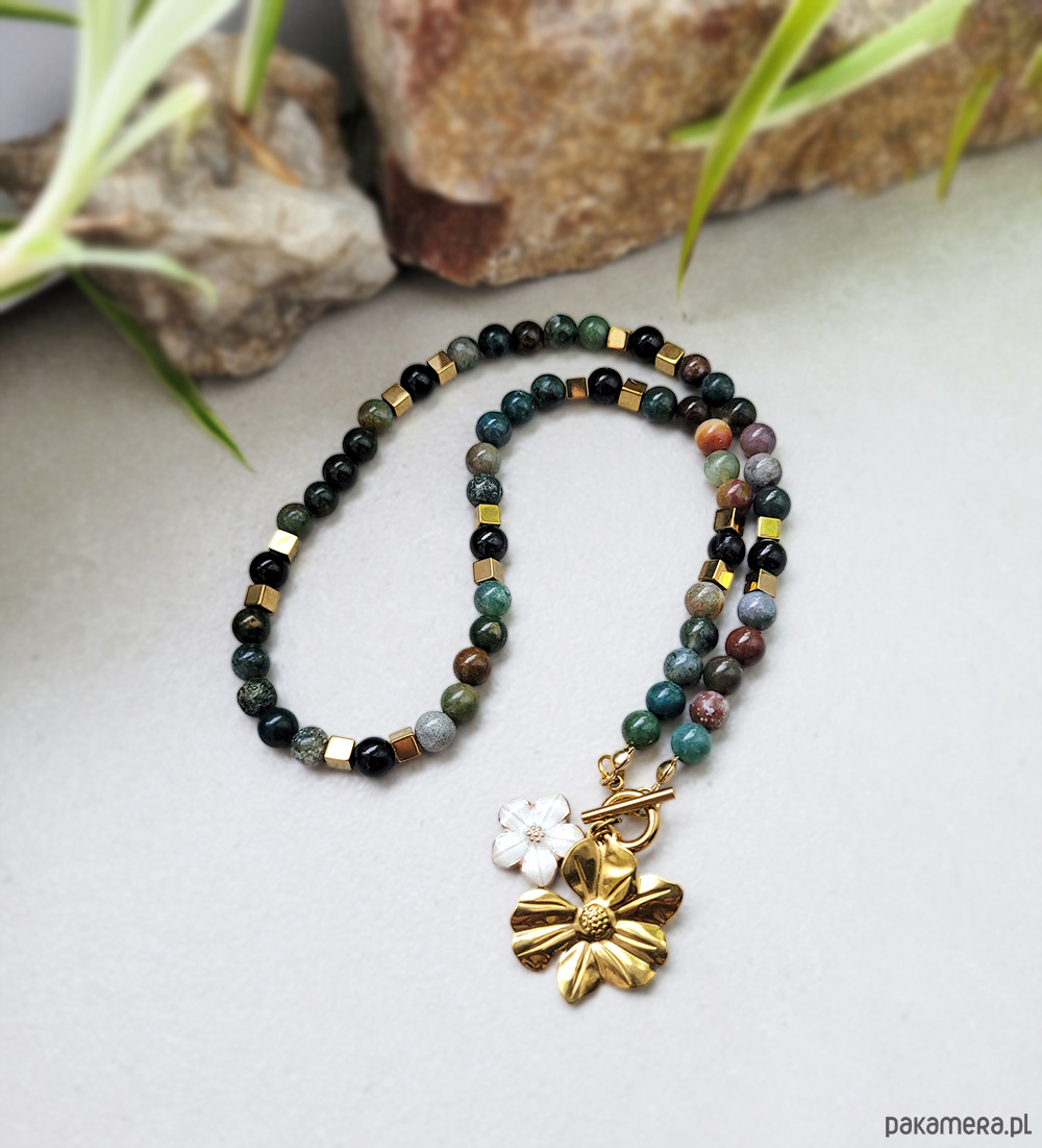 Piękny naszyjnik wykonany na stalowej lince z kamieni naturalnych: Agatu indyjskiego, Onyksu oraz hematytu w kolorze złotym.