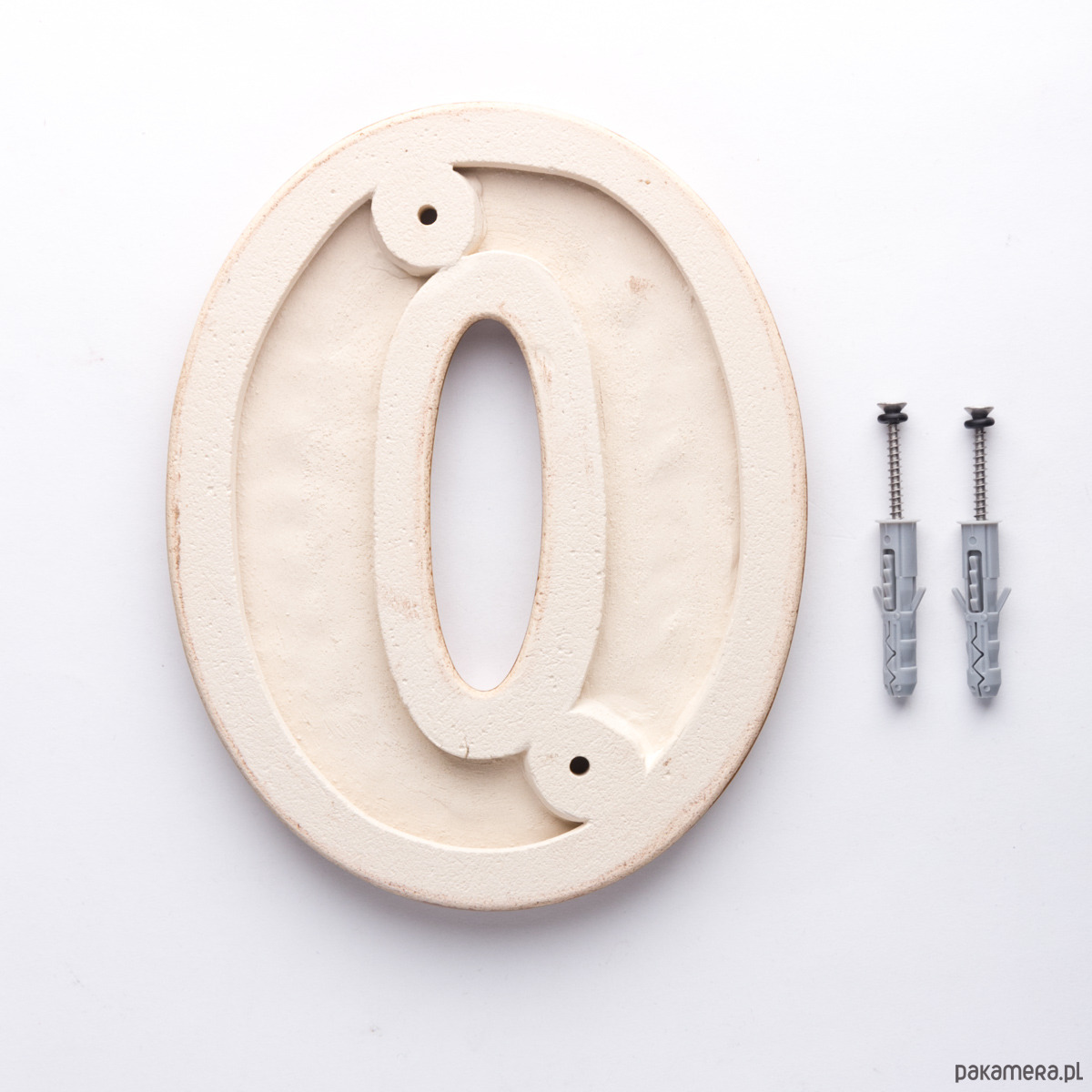 – dwie koszulki do kołków rozporowych abyś mógł przykręcić cyfrę do powierzchni budynku np mur z cegły, betonu, pustaków i.t.p. (oczywiście w przypadku montażu do drewna koszulki są zbyteczne, bo używasz tylko metalowych wkrętów)