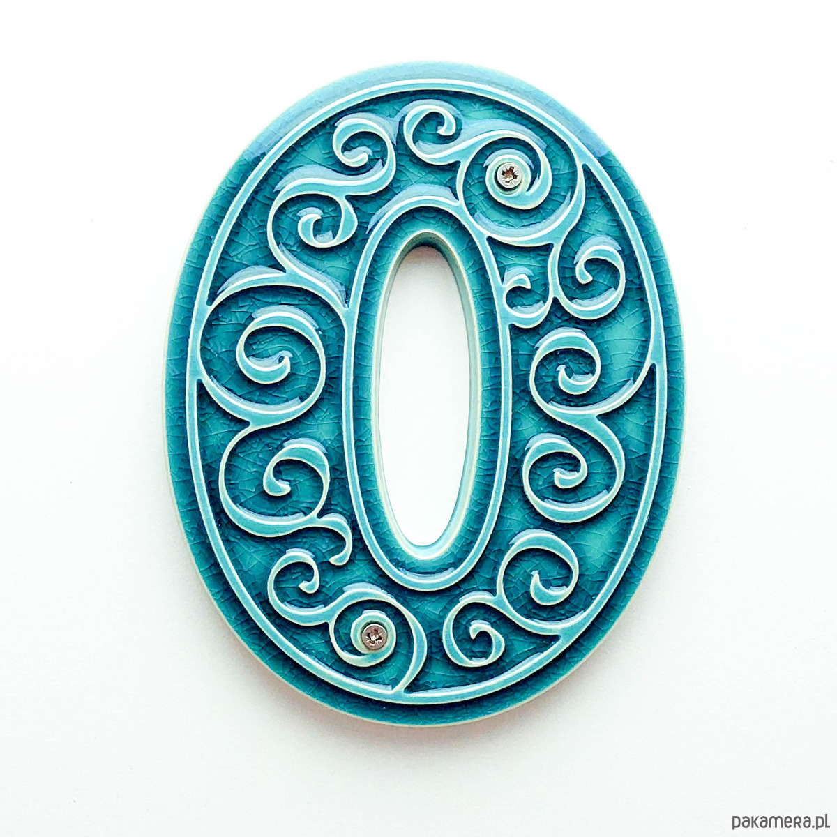 Ceramiczna cyfra z lekko wypukłym, dekoracyjnym ornamentem. Ręcznie wykonana z jasnej gliny, pokryta błyszczącym szkliwem. Dwukrotnie wypalana w wysokiej temperaturze.