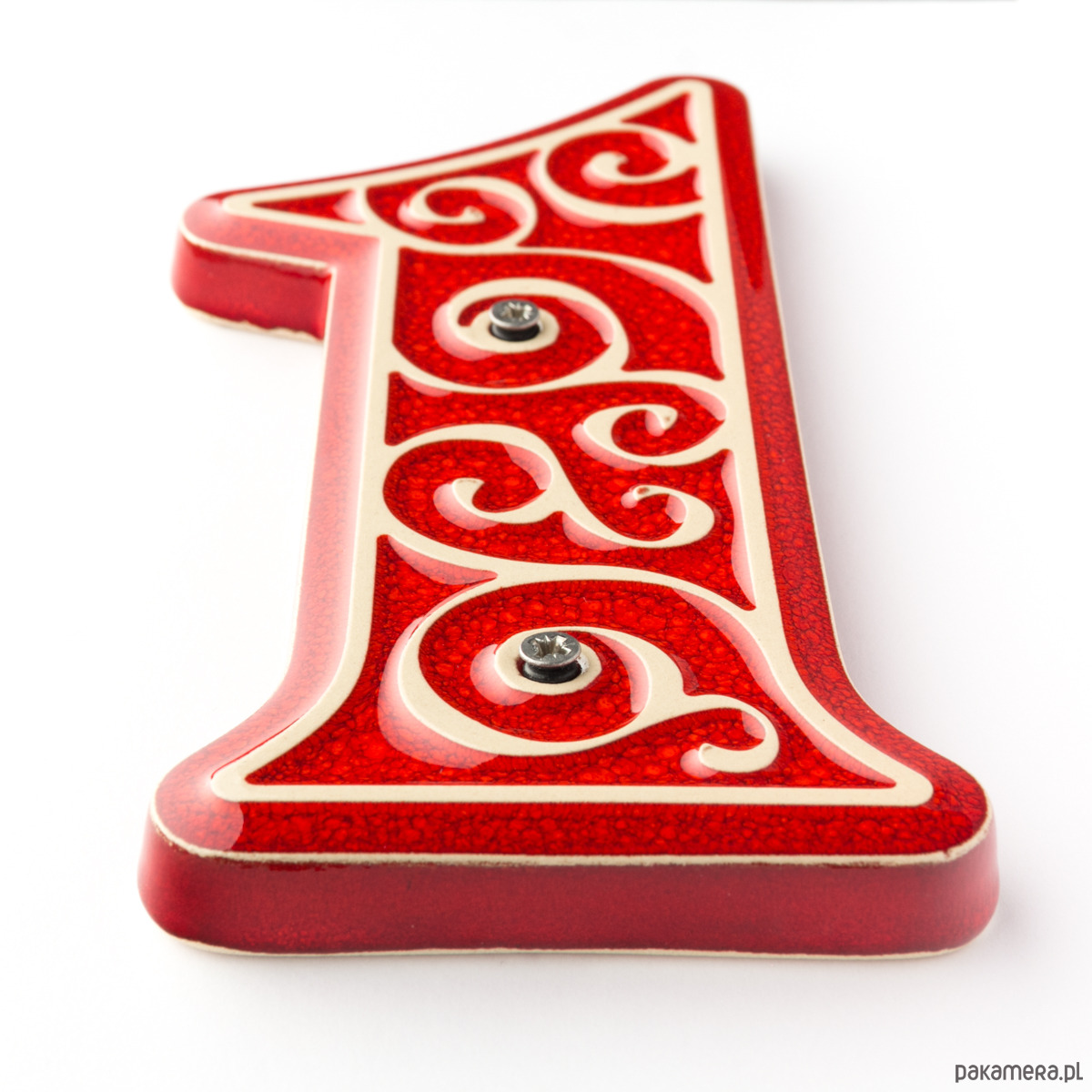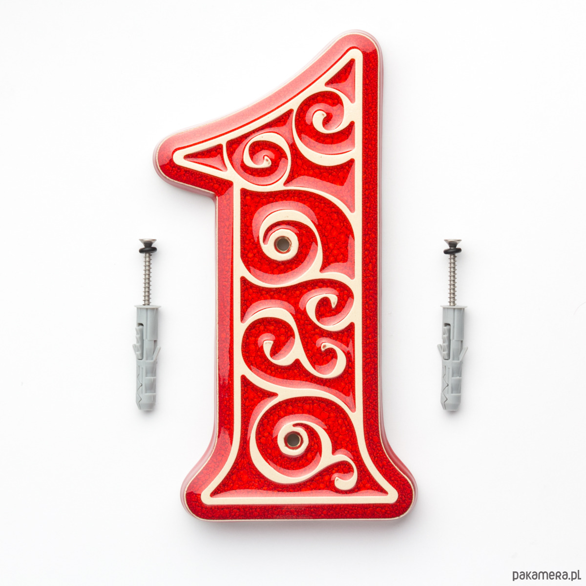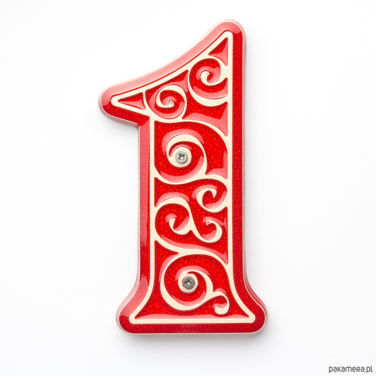 Numer domu, cyfra 1, czerwona z jasnym ornamentem, do przykręcenia