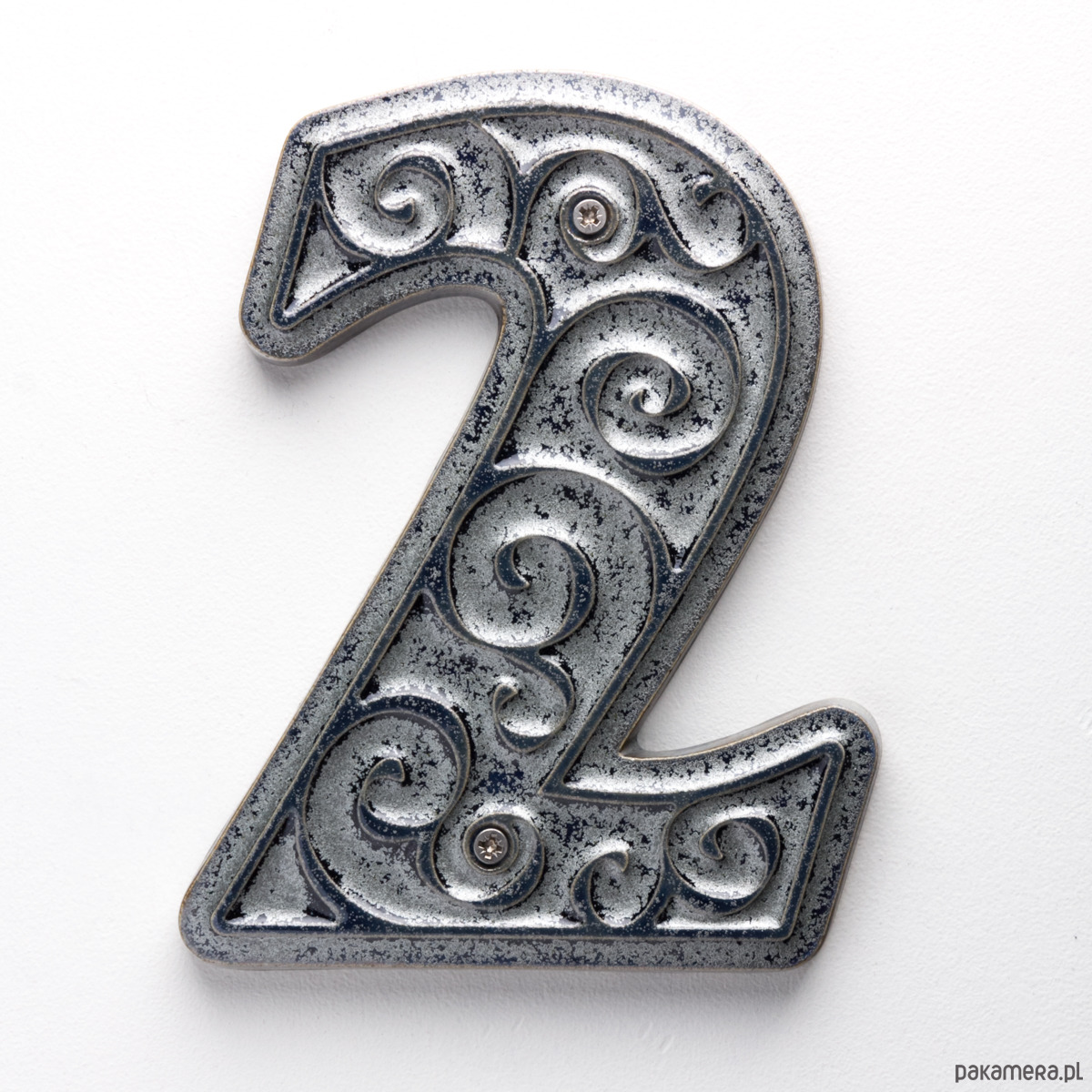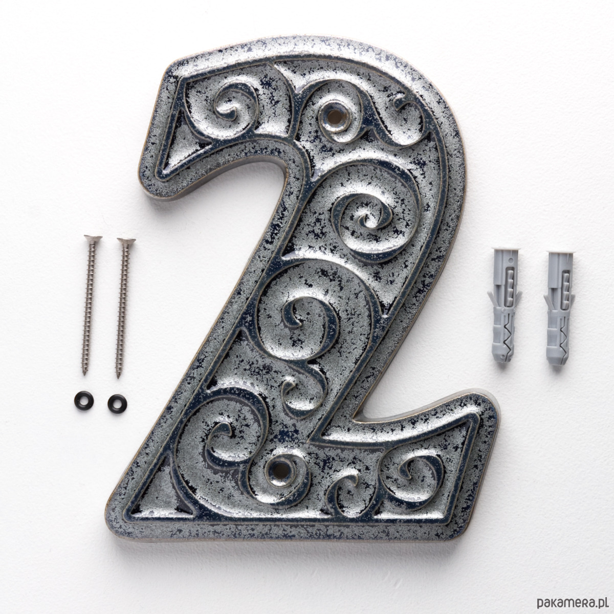 Numer domu, cyfra 2, srebrno-granatowa, do zawieszenia