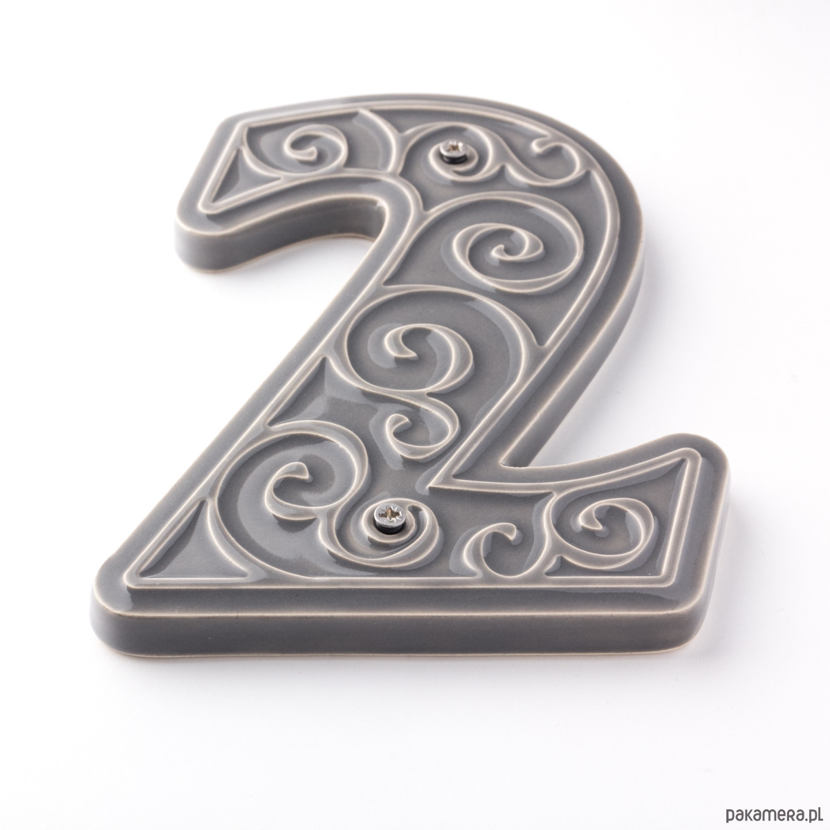 Ceramiczna cyfra z lekko wypukłym, dekoracyjnym ornamentem. Ręcznie wykonana z jasnej gliny, pokryta błyszczącym szkliwem. Dwukrotnie wypalana w wysokiej temperaturze.