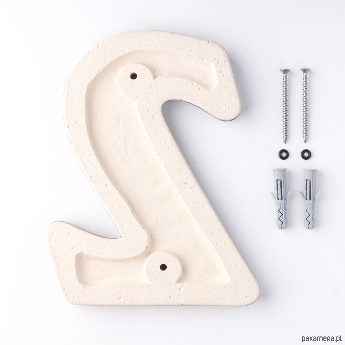 – dwie koszulki do kołków rozporowych abyś mógł przykręcić cyfrę do powierzchni budynku np mur z cegły, betonu, pustaków i.t.p. (oczywiście w przypadku montażu do drewna koszulki są zbyteczne, bo używasz tylko metalowych wkrętów)