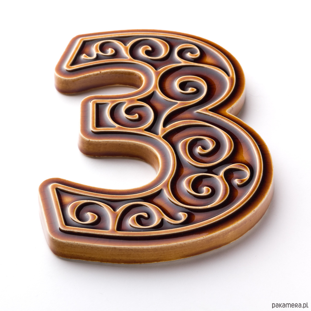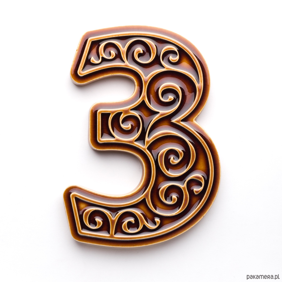 Numer domu, cyfra 3, brązowa z miodowymi ornamentami