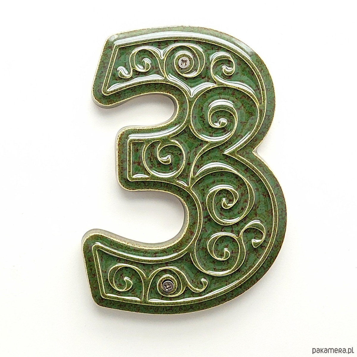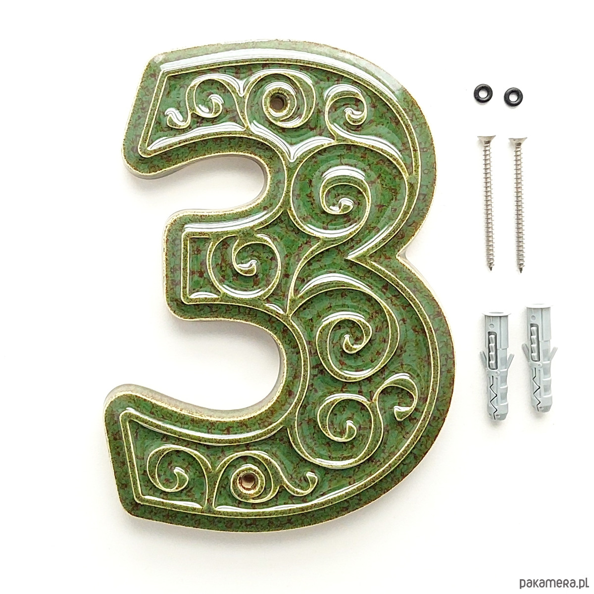Numer domu, cyfra 3, zielono-brązowa, do przykręcenia
