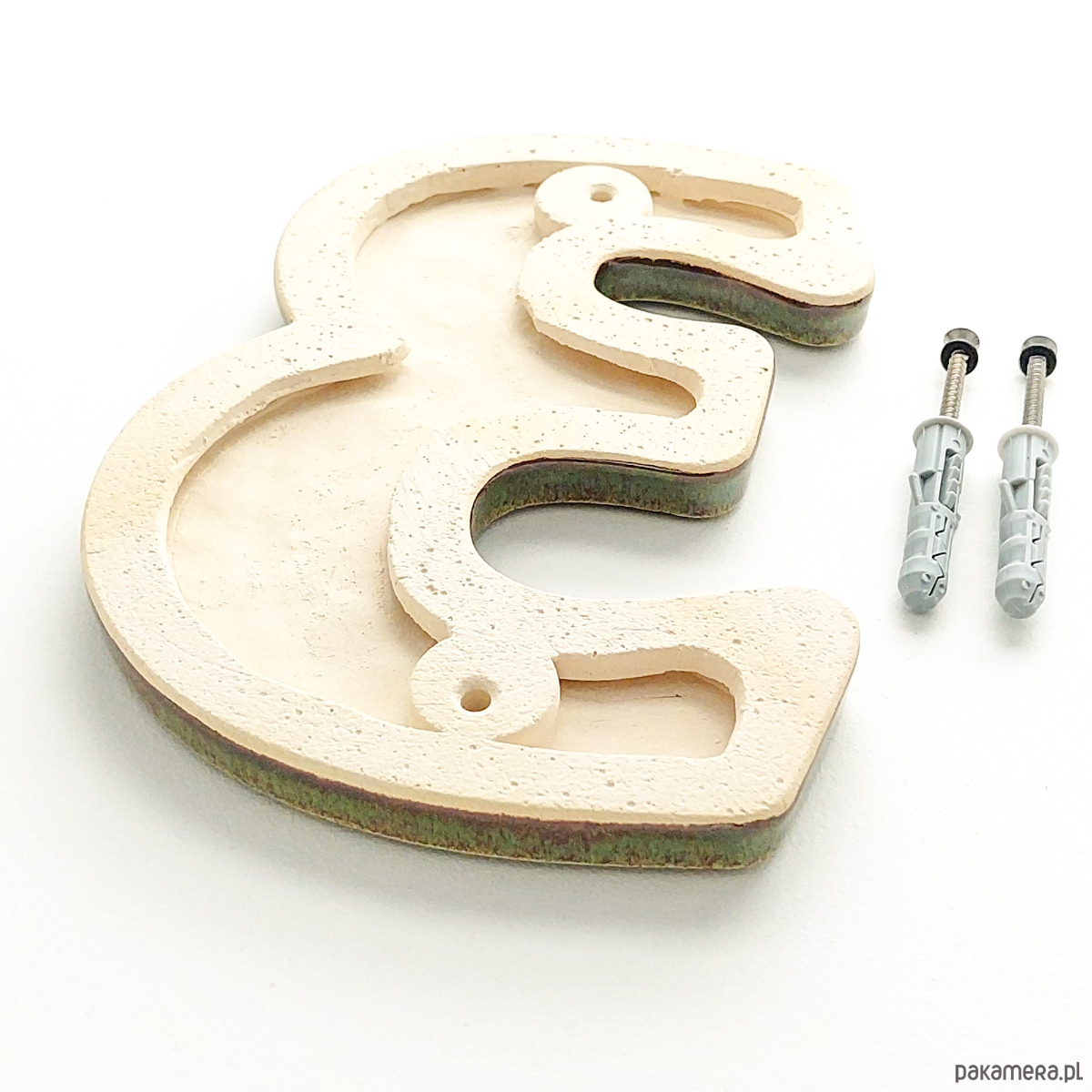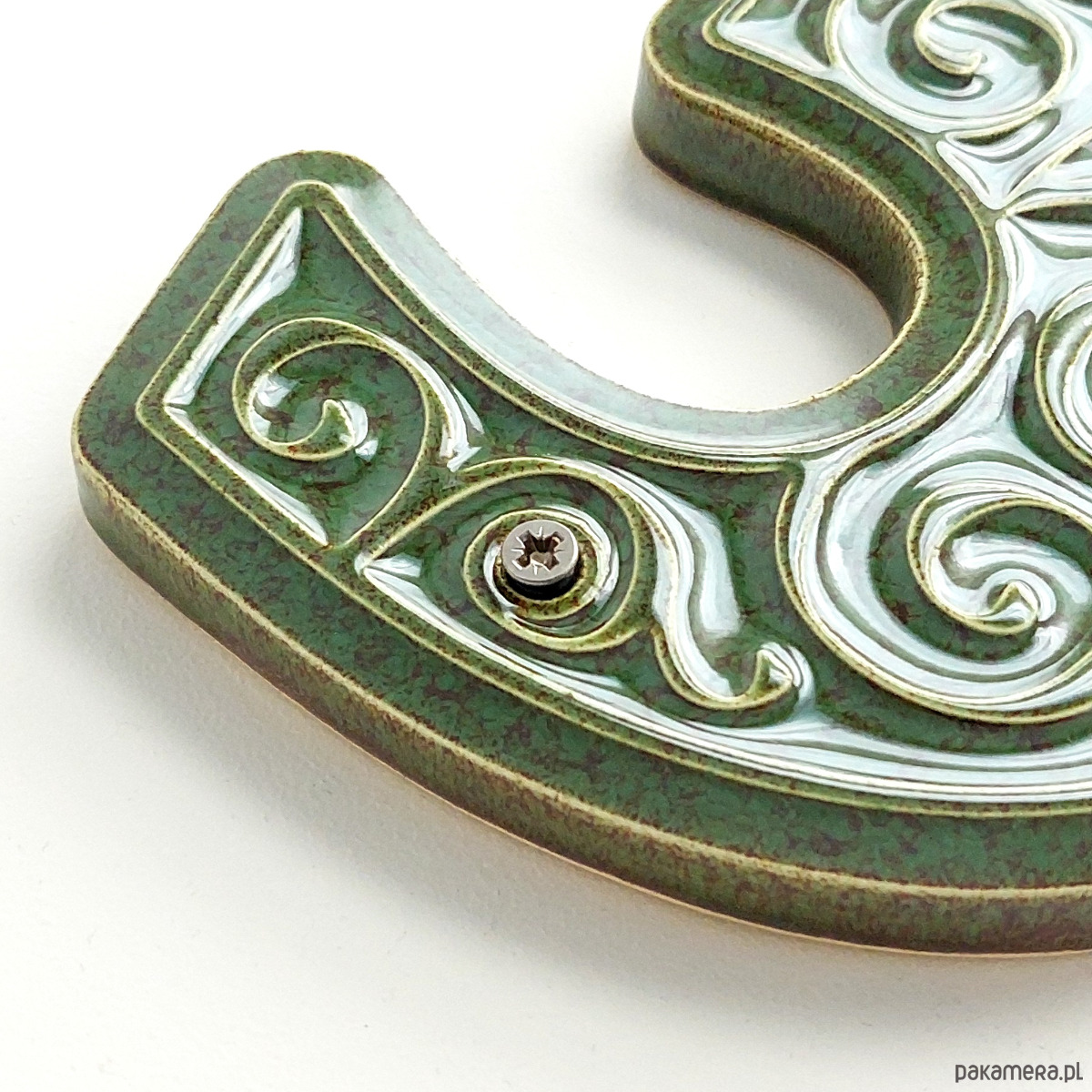 Ceramiczna cyfra z lekko wypukłym, dekoracyjnym ornamentem. Ręcznie wykonana z jasnej gliny, pokryta błyszczącym szkliwem. Dwukrotnie wypalana w wysokiej temperaturze.