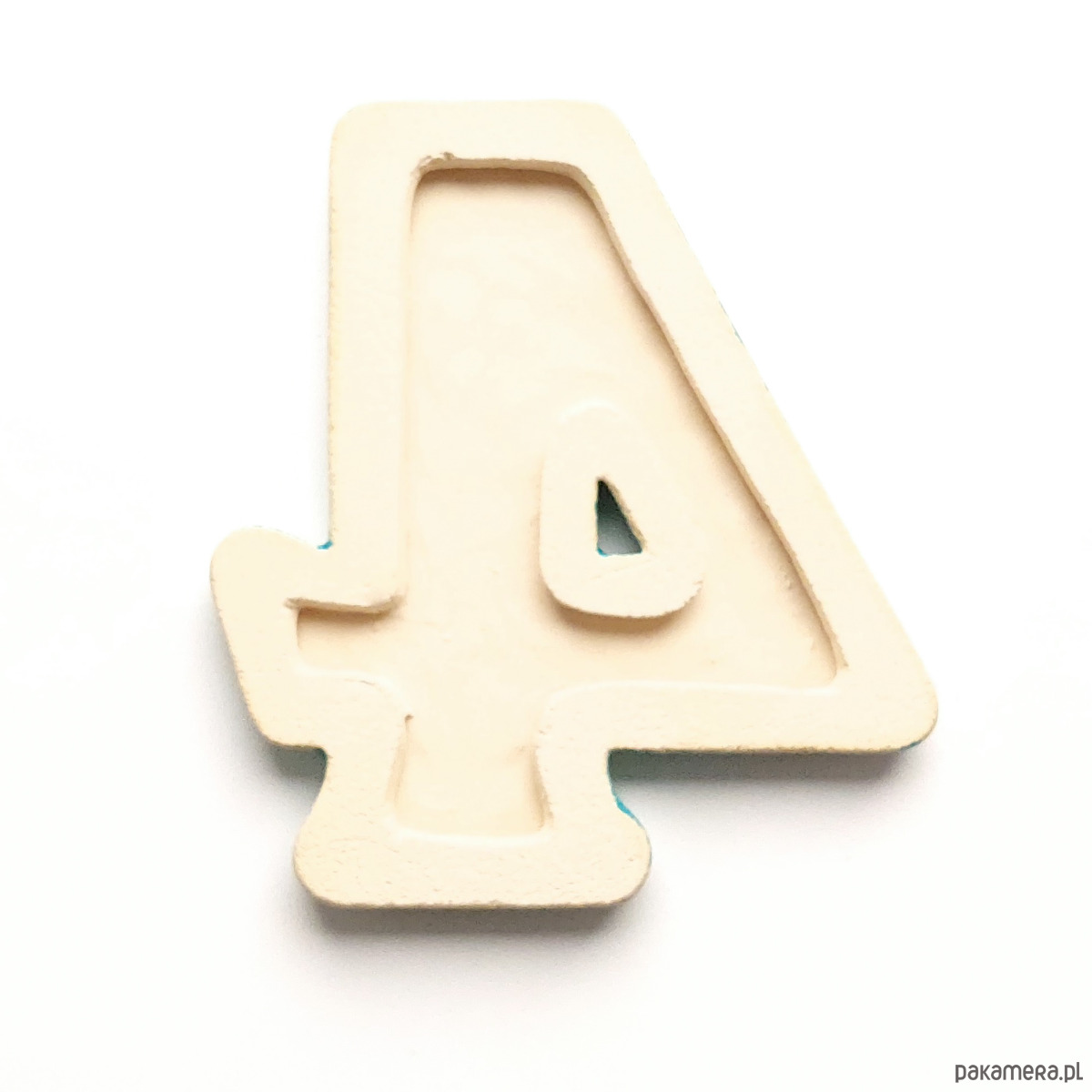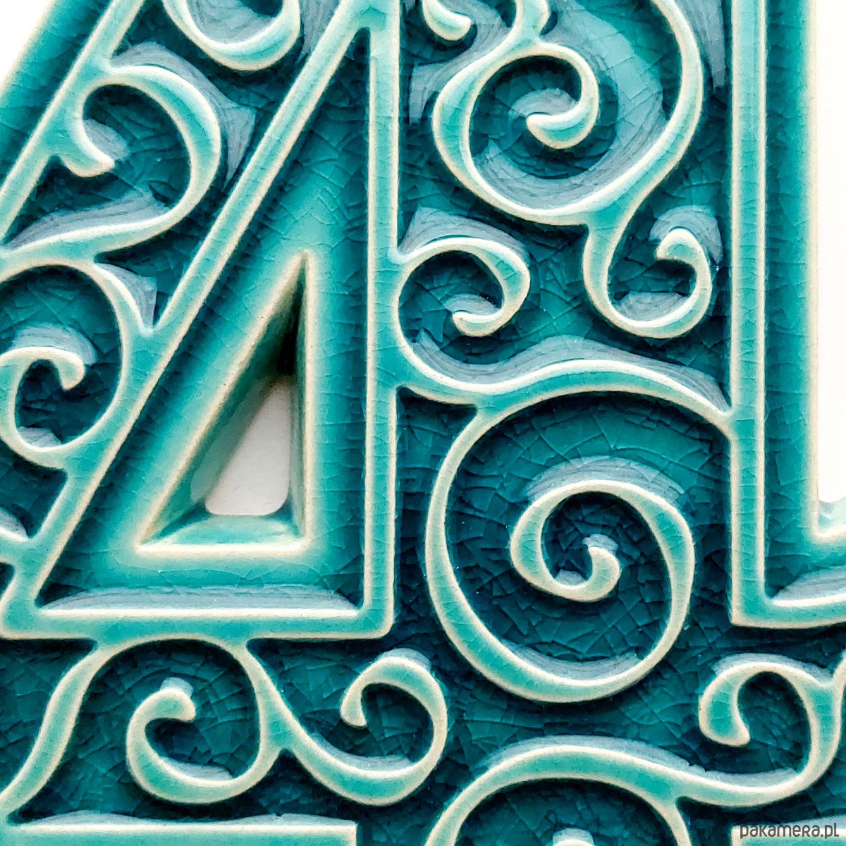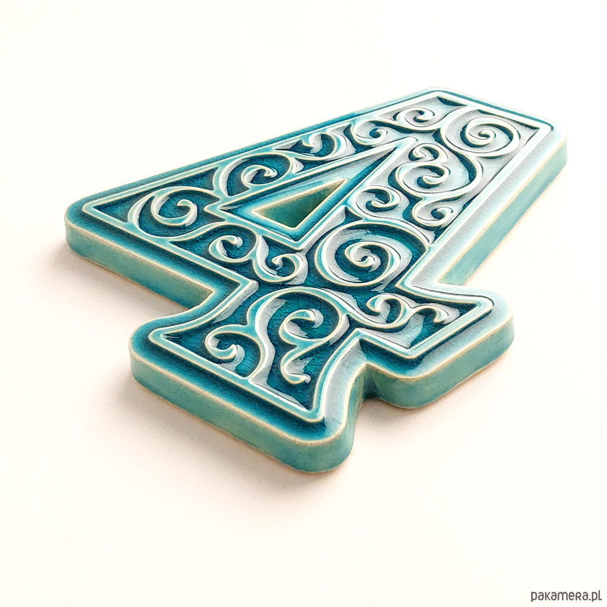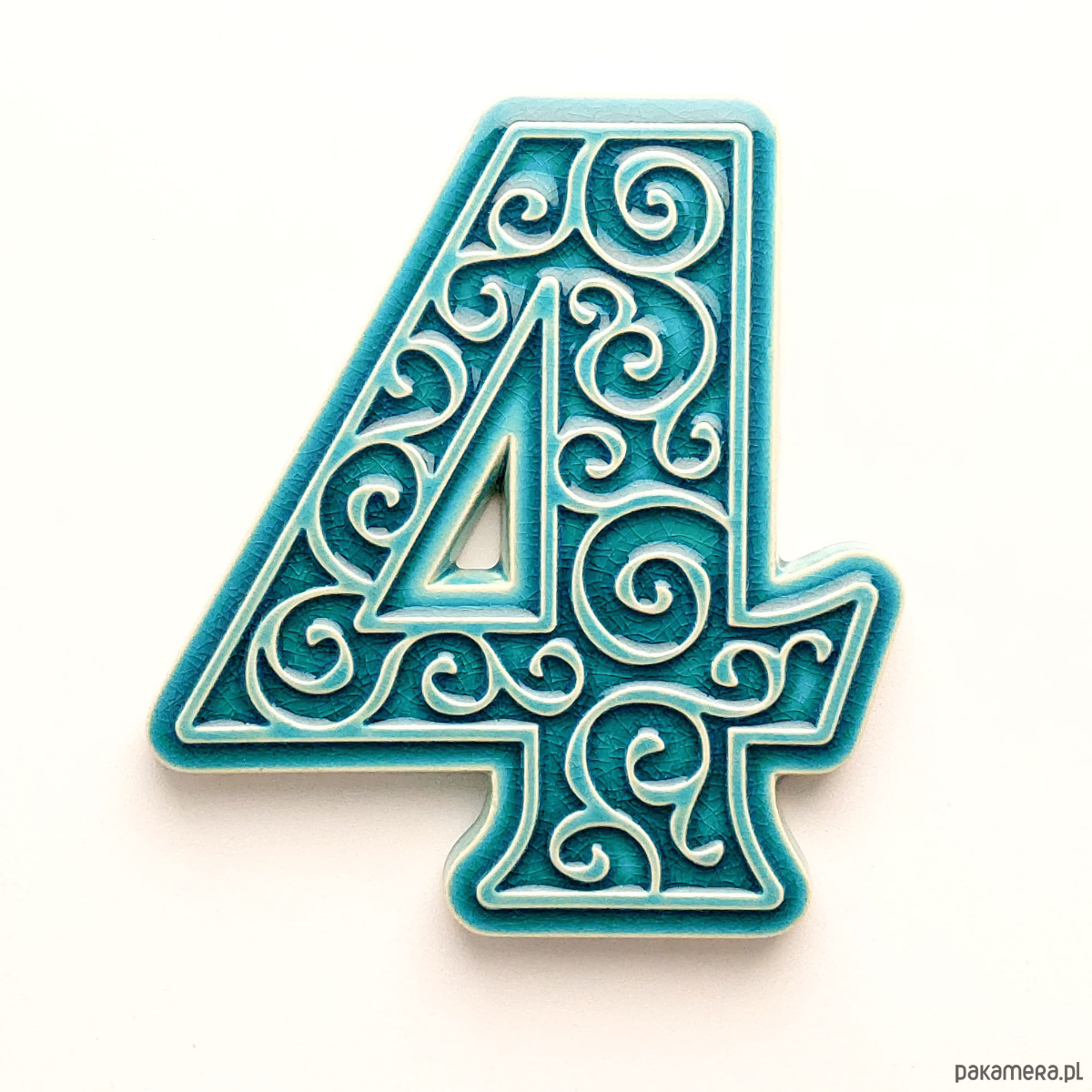 Ceramiczna cyfra 4 z ozdobnym ornamentem, do zamocowania na elewacji budynku. Wykonana z jasnej gliny, pokryta błyszczącym szkliwem, wypalana dwukrotnie w wysokiej temperaturze. Do klejenia cyfry można stosować kleje montażowe odporne na działanie warunków atmosferycznych. Unieruchomienie cyfry na czas schnięcia kleju umożliwia krawędziowy kołnierz od spodu cyfry.