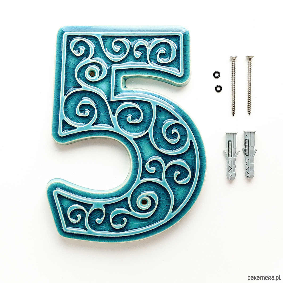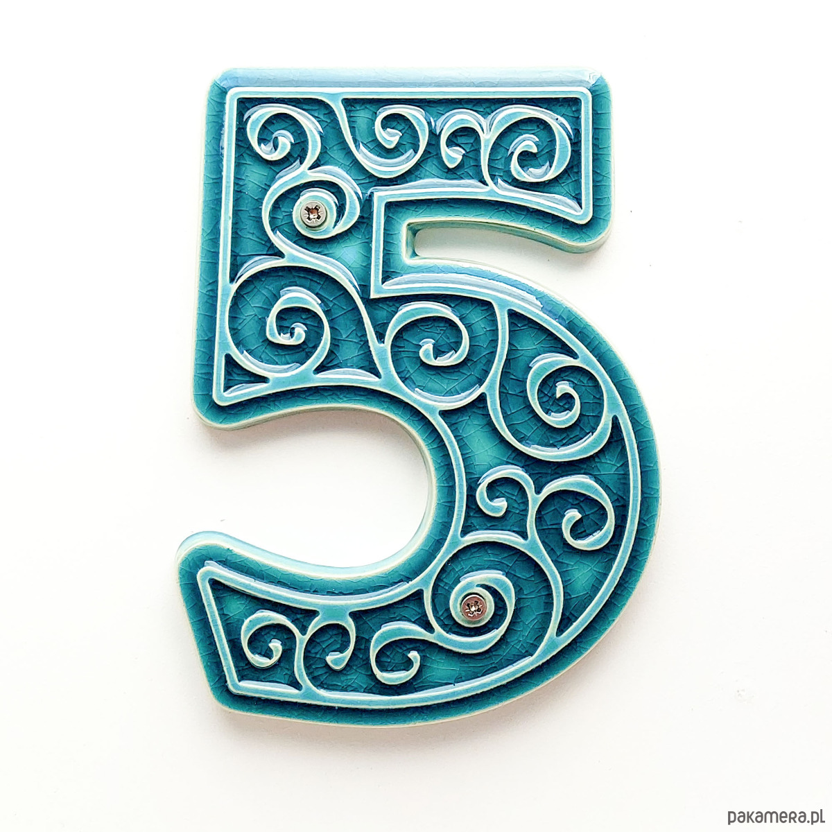 Numer domu, cyfra 5 turkusowa, do zawieszenia