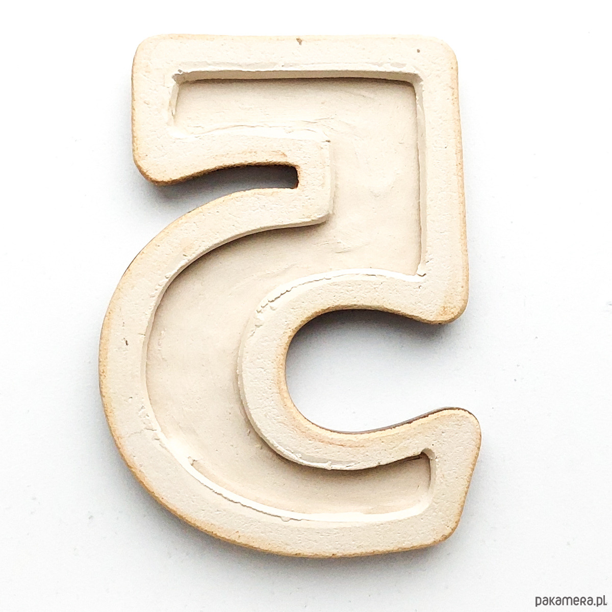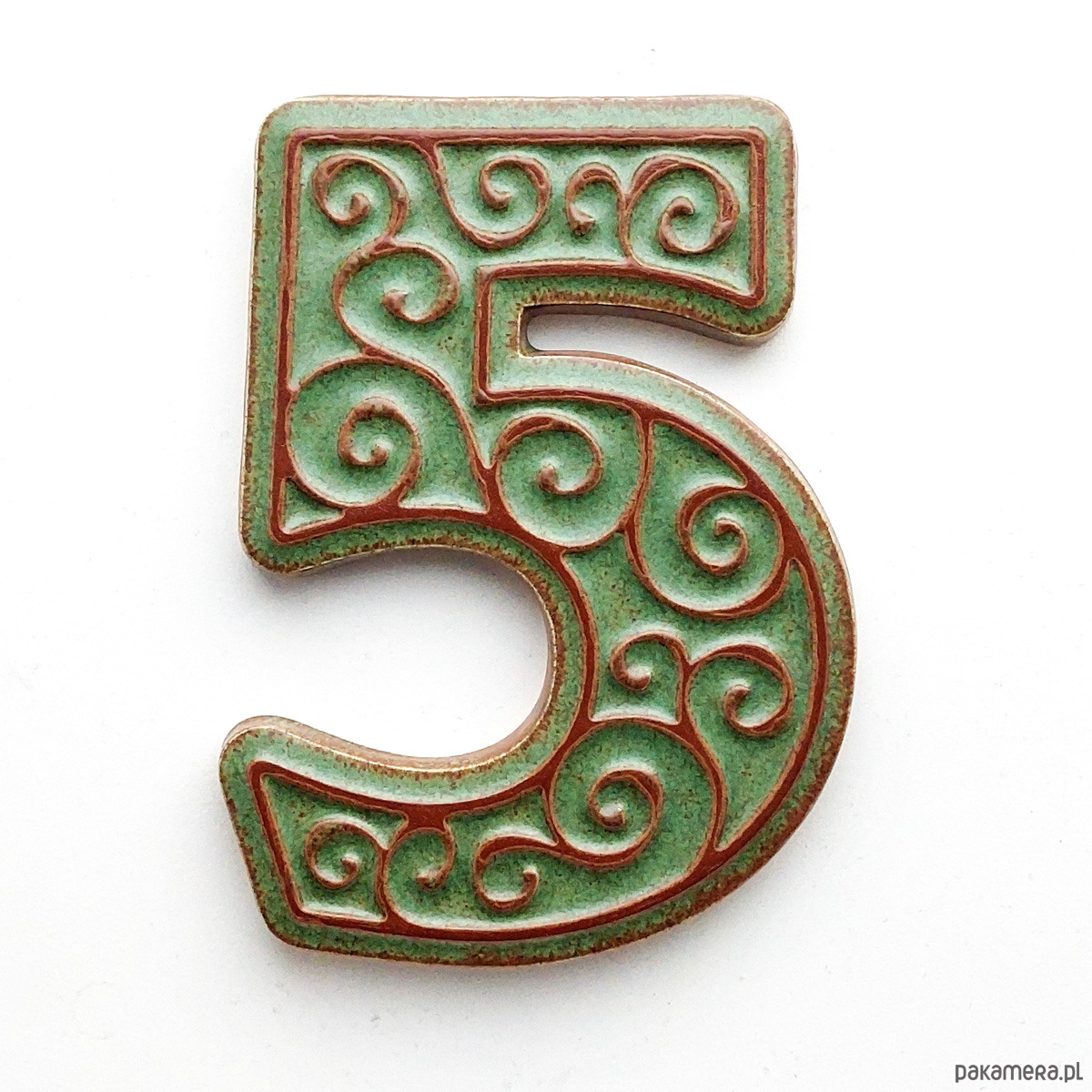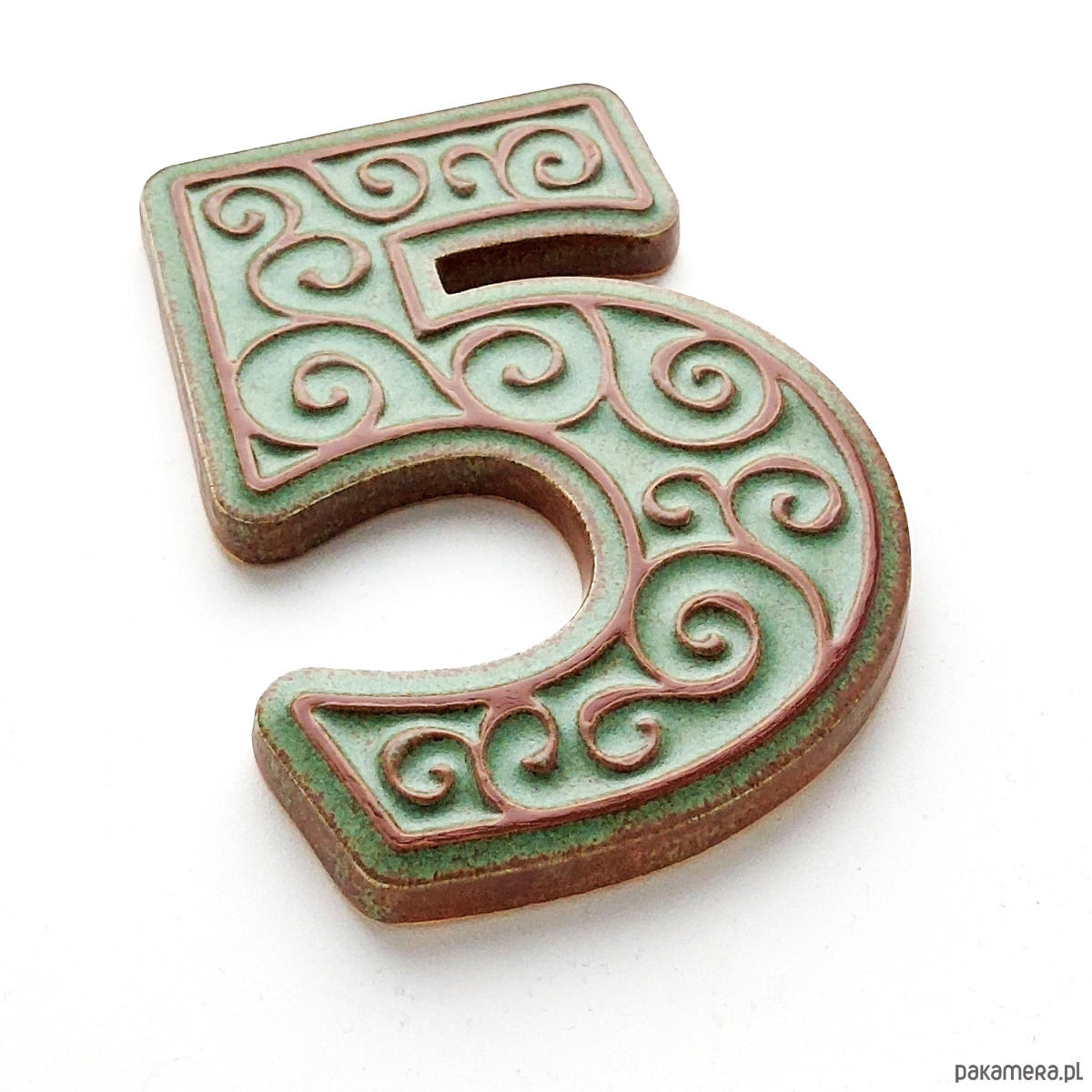 Ceramiczna cyfra 5 z ozdobnym, lekko wypukłym ornamentem, do zamocowania na elewacji budynku. Wykonana z jasnej gliny, pokryta szkliwem o satynowym połysku, wypalona dwukrotnie w wysokiej temperaturze. Do klejenia cyfry można stosować kleje montażowe odporne na działanie warunków atmosferycznych. Unieruchomienie cyfry na czas schnięcia kleju umożliwia krawędziowy kołnierz od spodu cyfry. Polecam serdecznie.