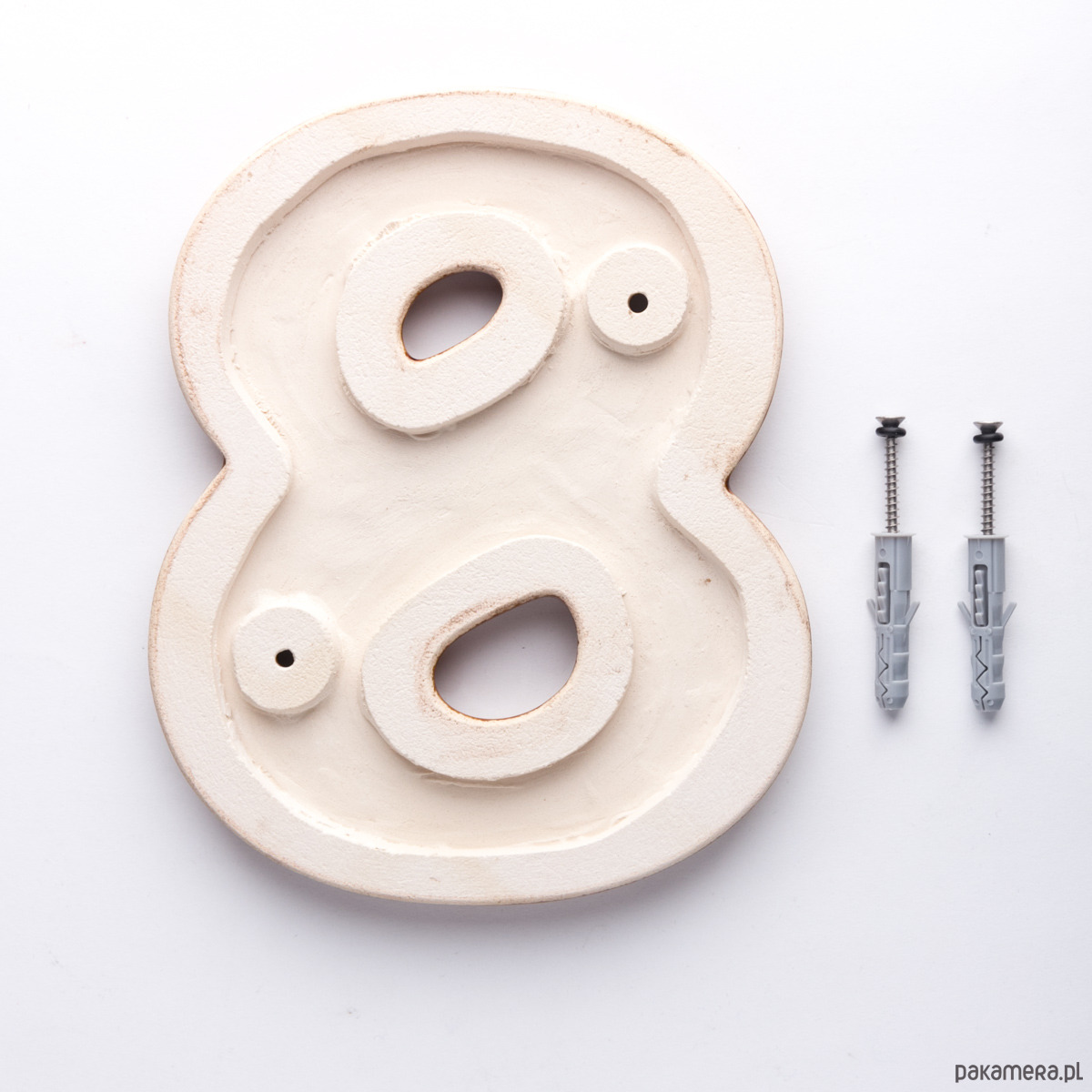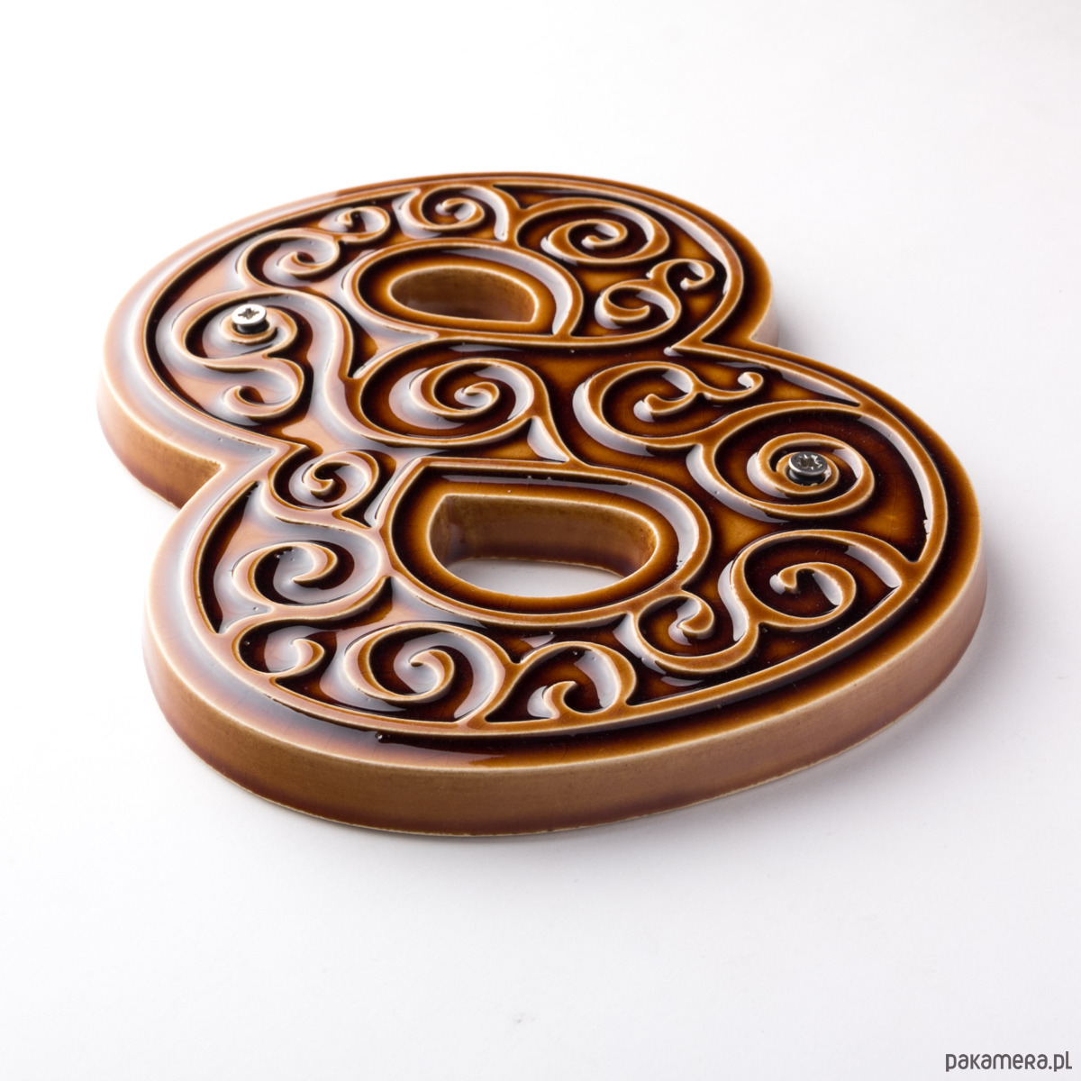 Ceramiczna cyfra z lekko wypukłym, dekoracyjnym ornamentem. Ręcznie wykonana z jasnej gliny, pokryta błyszczącym szkliwem. Dwukrotnie wypalana w wysokiej temperaturze.