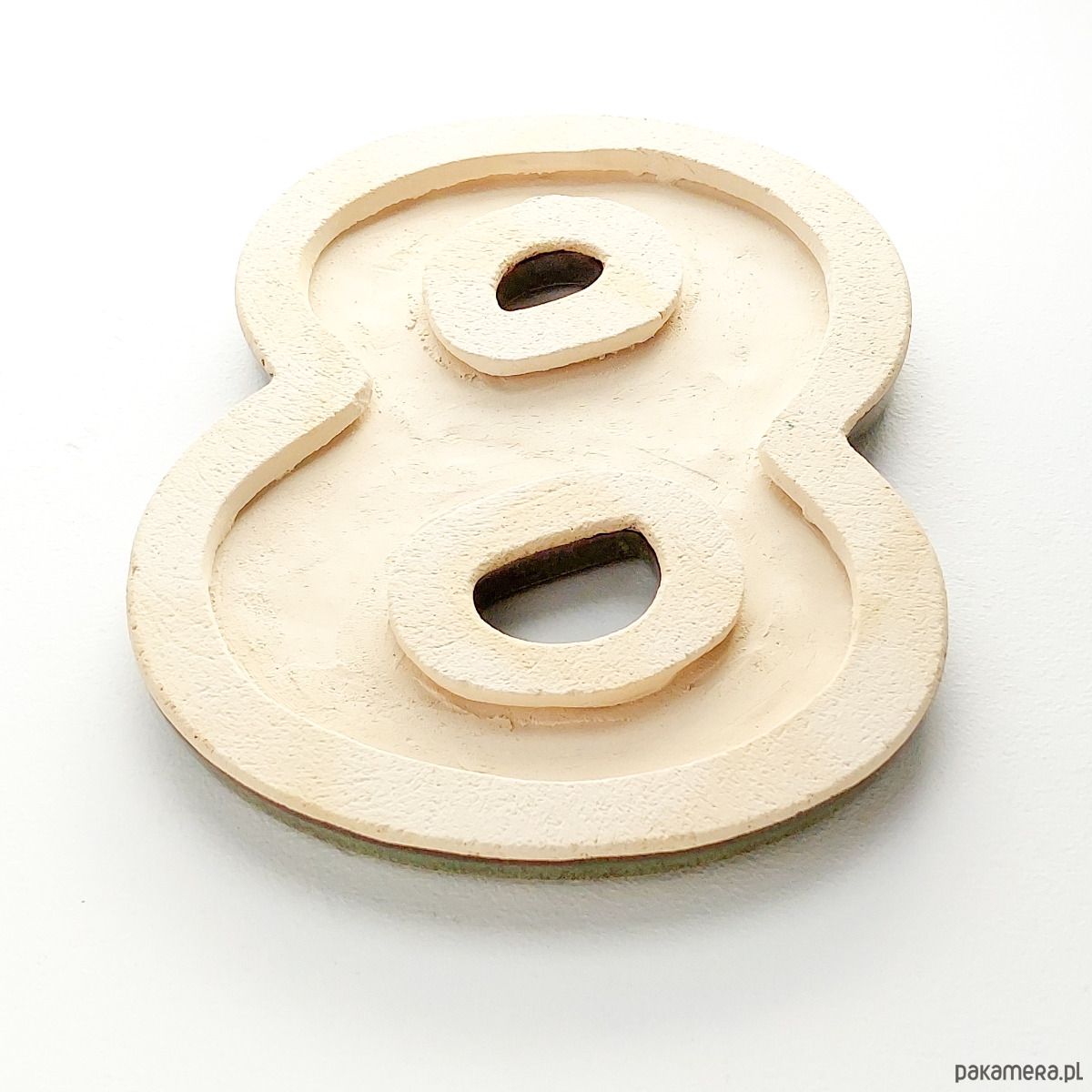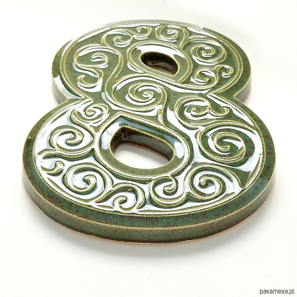 Ceramiczna cyfra 8 z ozdobnym ornamentem do zamocowania na elewacji budynku. Wykonana z jasnej gliny, pokryta błyszczącym szkliwem, wypalana dwukrotnie w wysokiej temperaturze. Do klejenia cyfr można stosować kleje montażowe odporne na działanie warunków atmosferycznych. Unieruchomienie cyfry na czas schnięcia kleju umożliwia krawędziowy kołnierz od spodu cyfry, ułatwiający jej zawieszenie na kołku zamocowanym w ścianie, tak aby kołek nie był widoczny. Polecam serdecznie.
