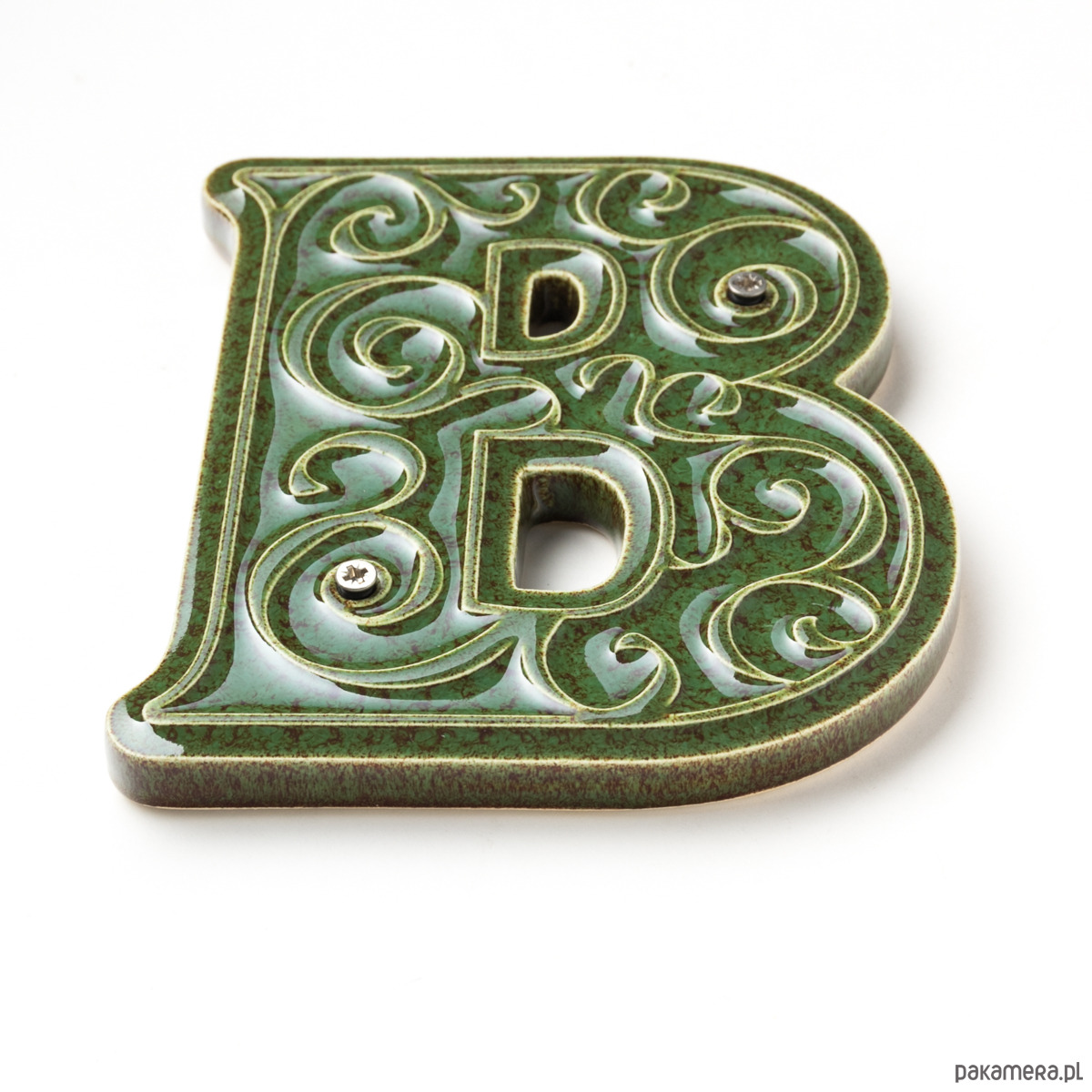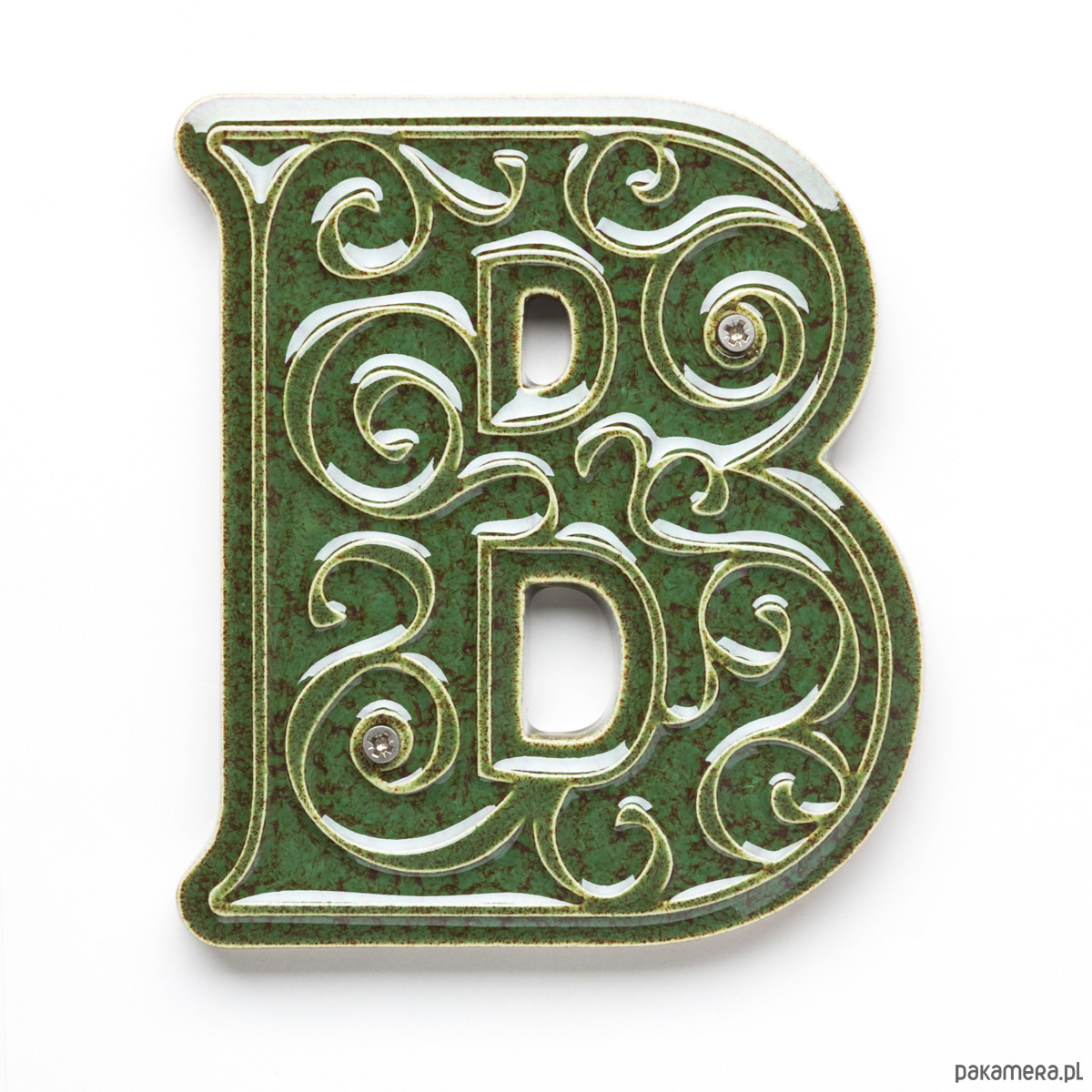 Ceramiczna litera z lekko wypukłym, dekoracyjnym ornamentem. Ręcznie wykonana z jasnej gliny, pokryta błyszczącym szkliwem. Dwukrotnie wypalana w wysokiej temperaturze.