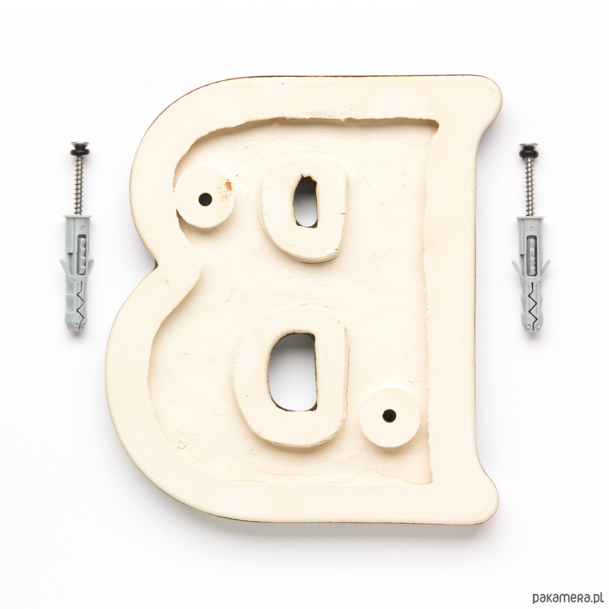 - dwie koszulki do kołków rozporowych abyś mógł przykręcić literę do powierzchni budynku np mur z cegły, betonu, pustaków i.t.p. (oczywiście w przypadku montażu do drewna koszulki są zbyteczne, bo używasz tylko metalowych wkrętów)