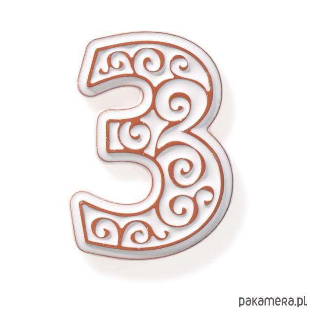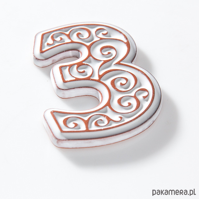 Numer mieszkania, cyfra 3, biała z brązowym ornamentem